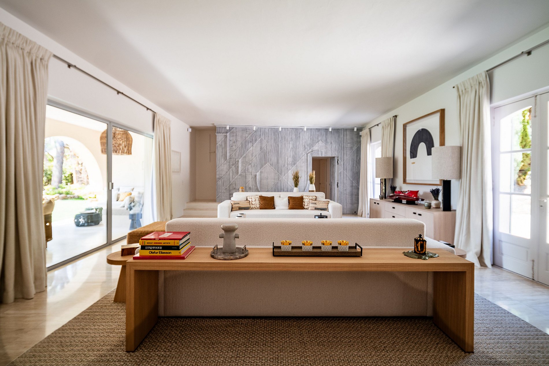 - 2 salones, sistema de sonido Sonos. Gran ventanal que da acceso a los salones exteriores y a la piscina, así como al otro lado un patio (80 m2)