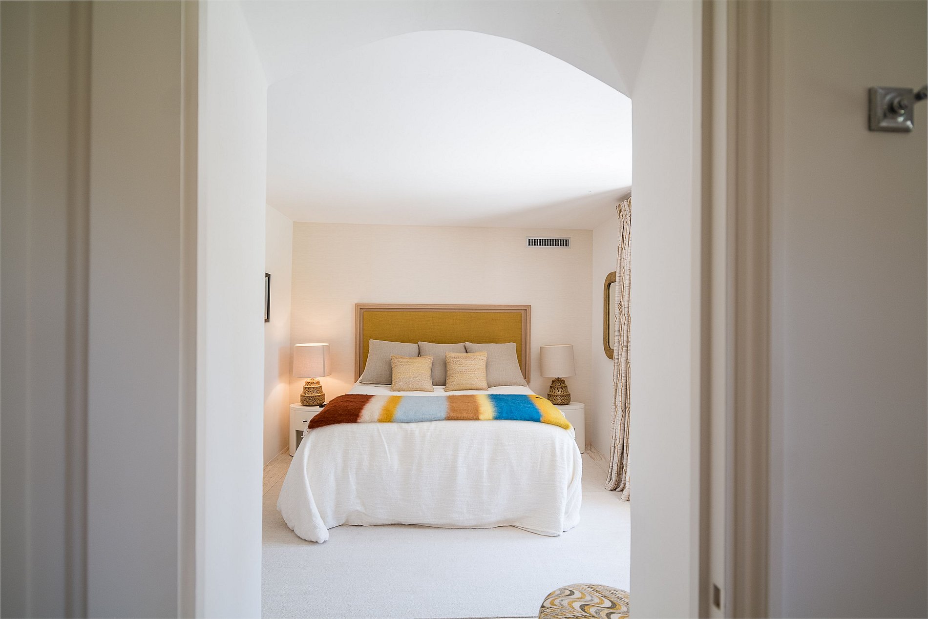 Cuarto principal, cama doble King Size de 200 cm, vestidor grande, baño (ducha, lavabo doble, bañera, inodoro), Smart TV, Apple TV y VOD, TV vía satélite, sistema de sonido Sonos, cajilla de seguridad, acceso a una gran terraza privada de 75 m2 (salón al aire libre), vista de 180° hacia el oeste de la piscina y el parque ajardinado.