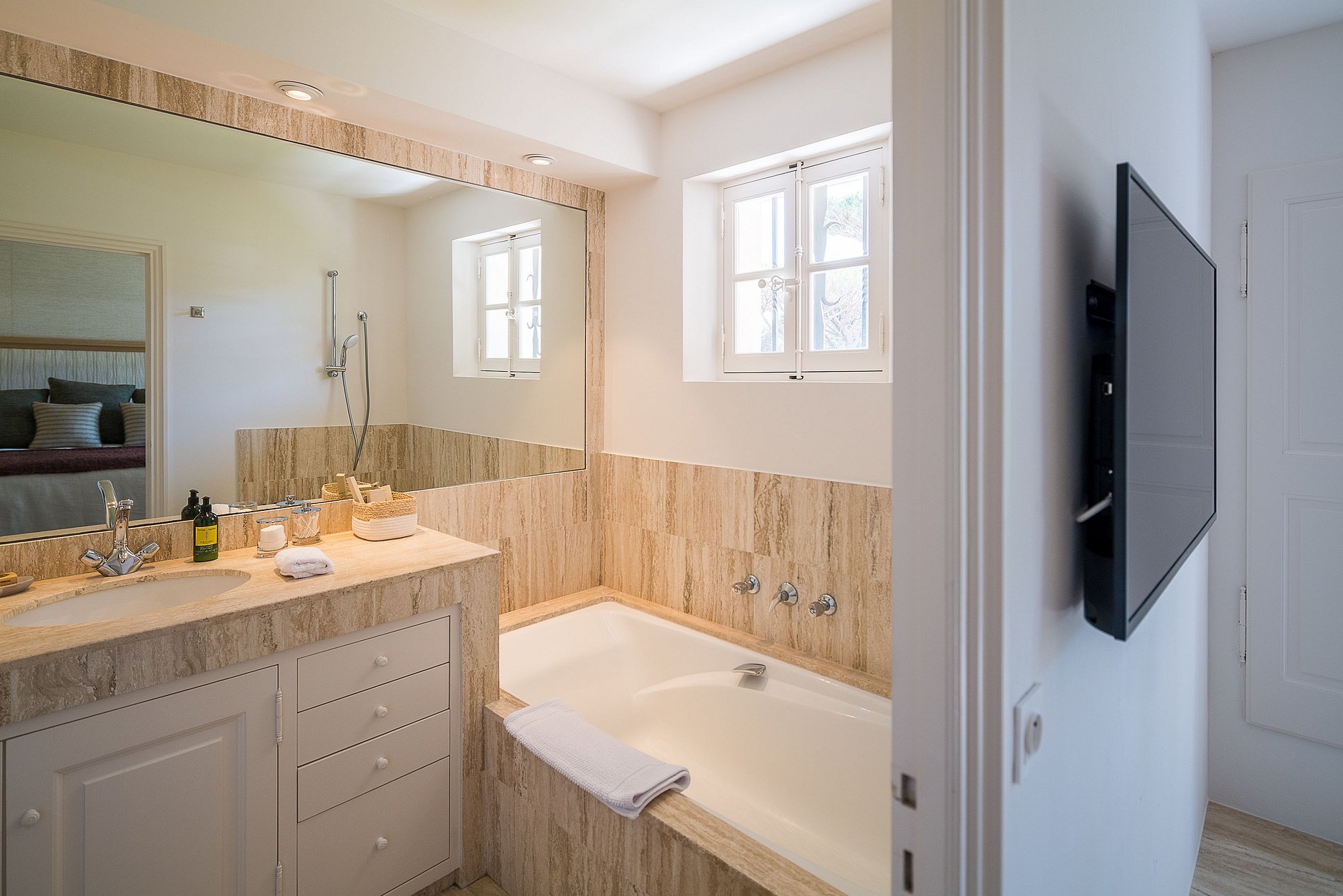 Cuarto principal, cama doble King Size de 200 cm, vestidor grande, baño (ducha, lavabo doble, bañera, inodoro), Smart TV, Apple TV y VOD, TV vía satélite, sistema de sonido Sonos, cajilla de seguridad, acceso a una gran terraza privada de 75 m2 (salón al aire libre), vista de 180° hacia el oeste de la piscina y el parque ajardinado.