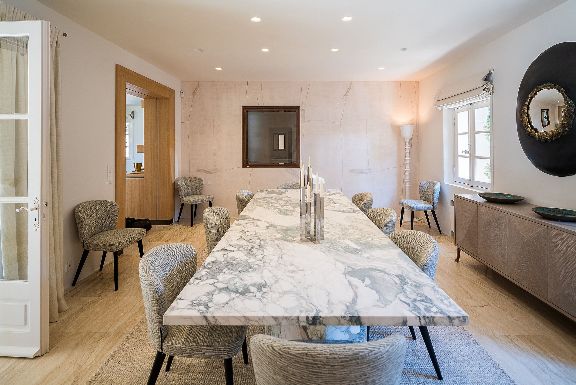 - 1 comedor (28m2), mesa de comedor para 12 personas. Un gran ventanal con vista al jardín.