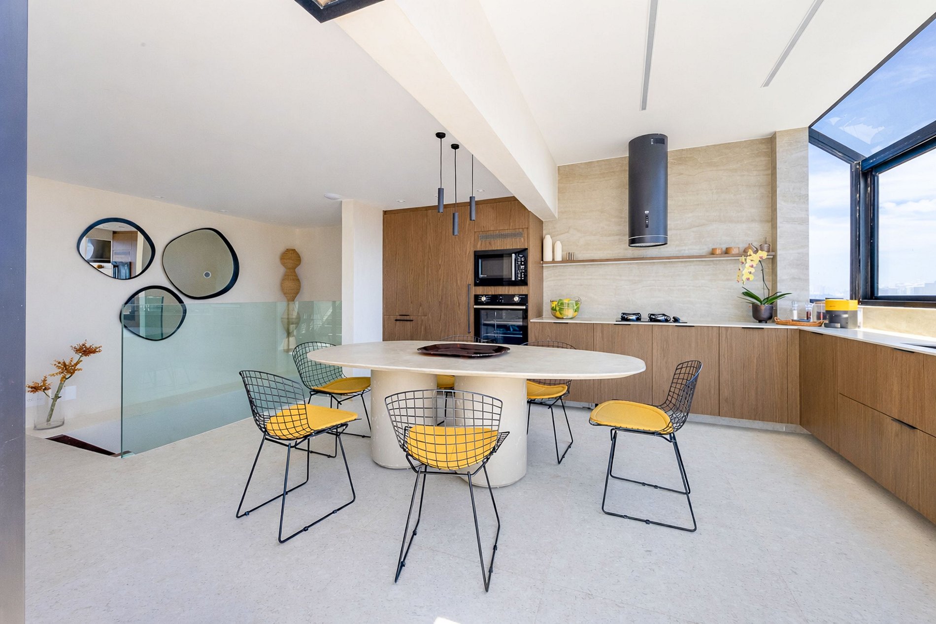 El segundo nivel está dedicado a los principales espacios sociales y de entretenimiento. Una cocina completamente equipada se abre al océano y se integra perfectamente con un comedor diseñado para largas y agradables reuniones. Las aberturas de piso a techo conducen a una magnífica terraza que cuenta con un salón exterior y un comedor al aire libre, ofreciendo un entorno privilegiado para disfrutar de los legendarios atardeceres de Río.