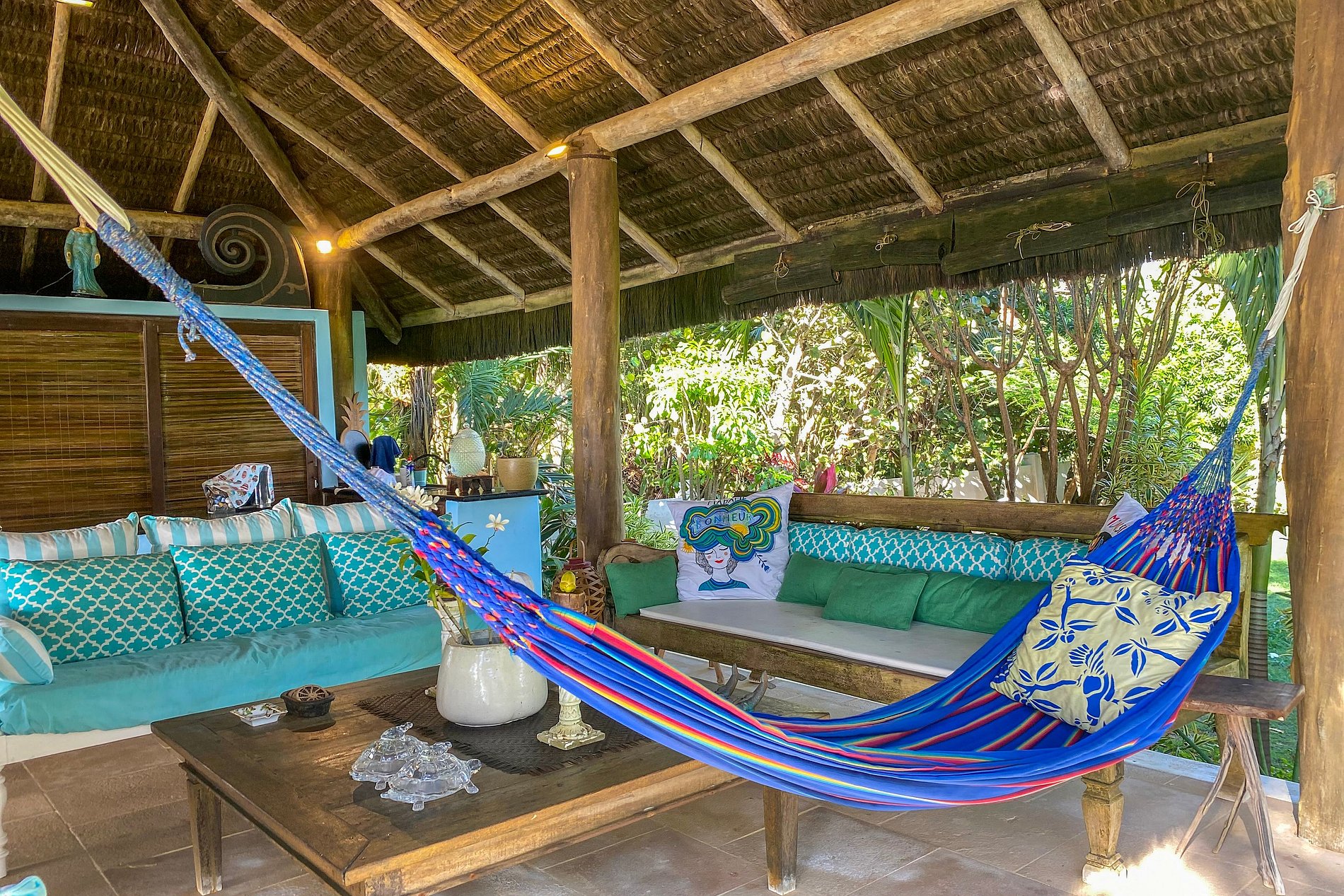 Cerca, la encantadora casa de estilo balinés cuenta con 4 suites que rodean un salón asiático y su jardín interior y hamacas. Lugar extremadamente relajante y amigable.