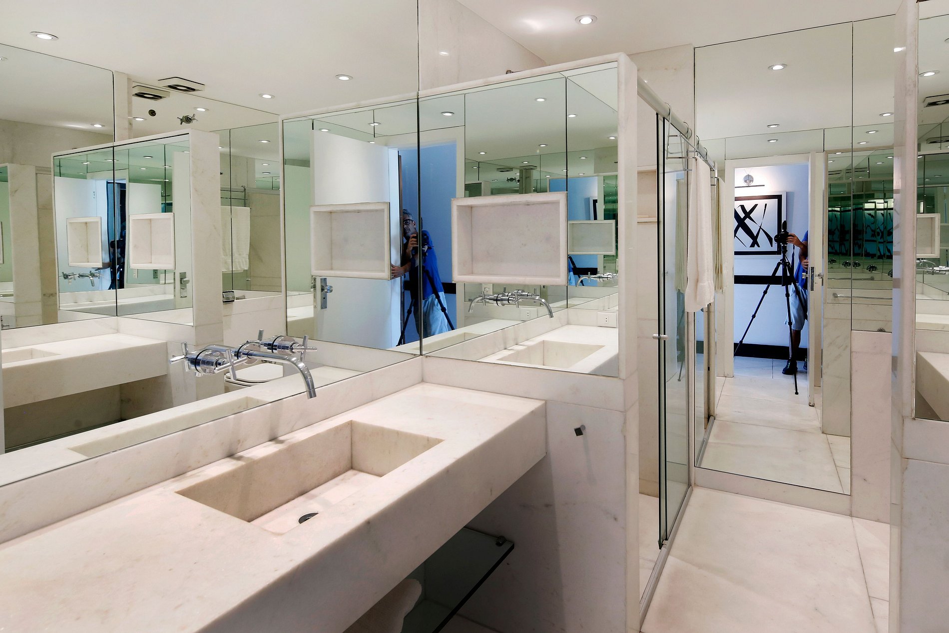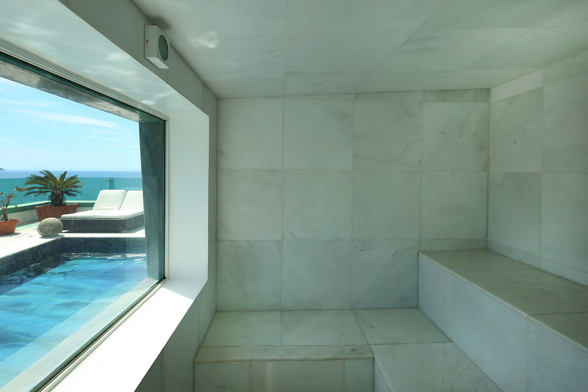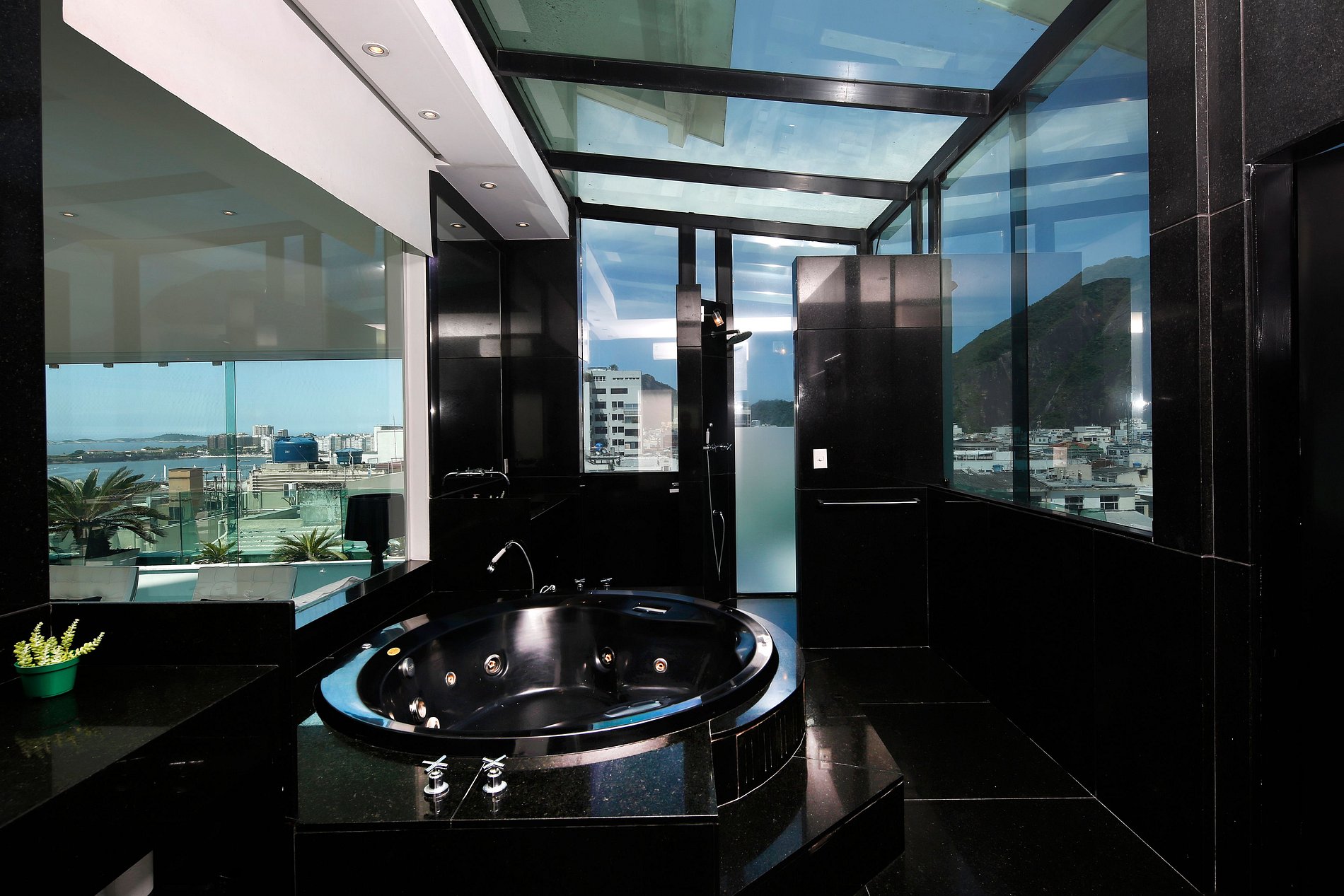 El baño principal tiene un diseño único, todo decorado en mármol negro, incluye un jacuzzi y ducha con vista a la playa de Copacabana y al Cristo Redentor.