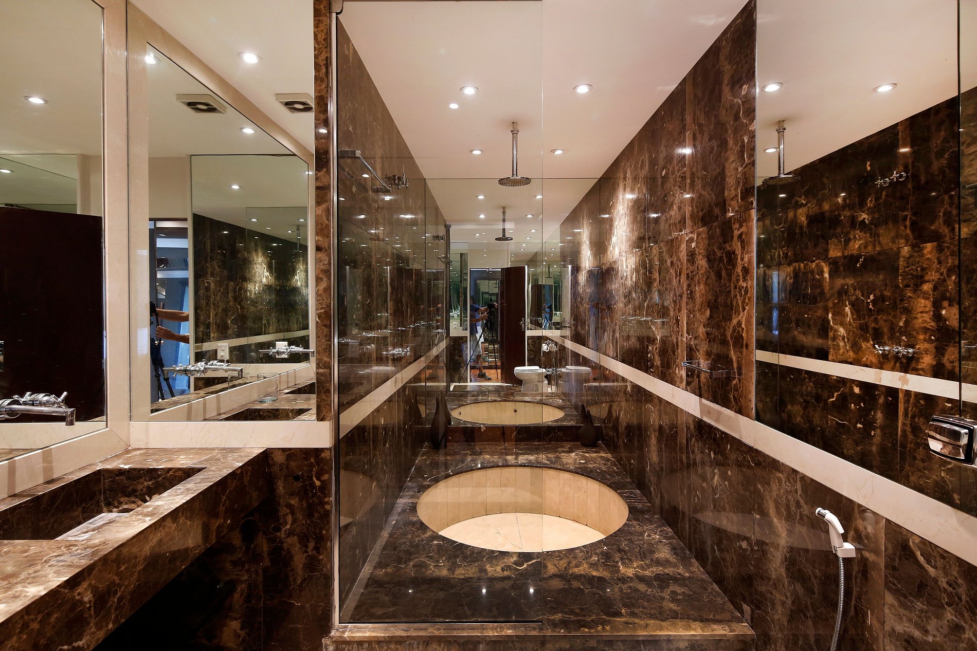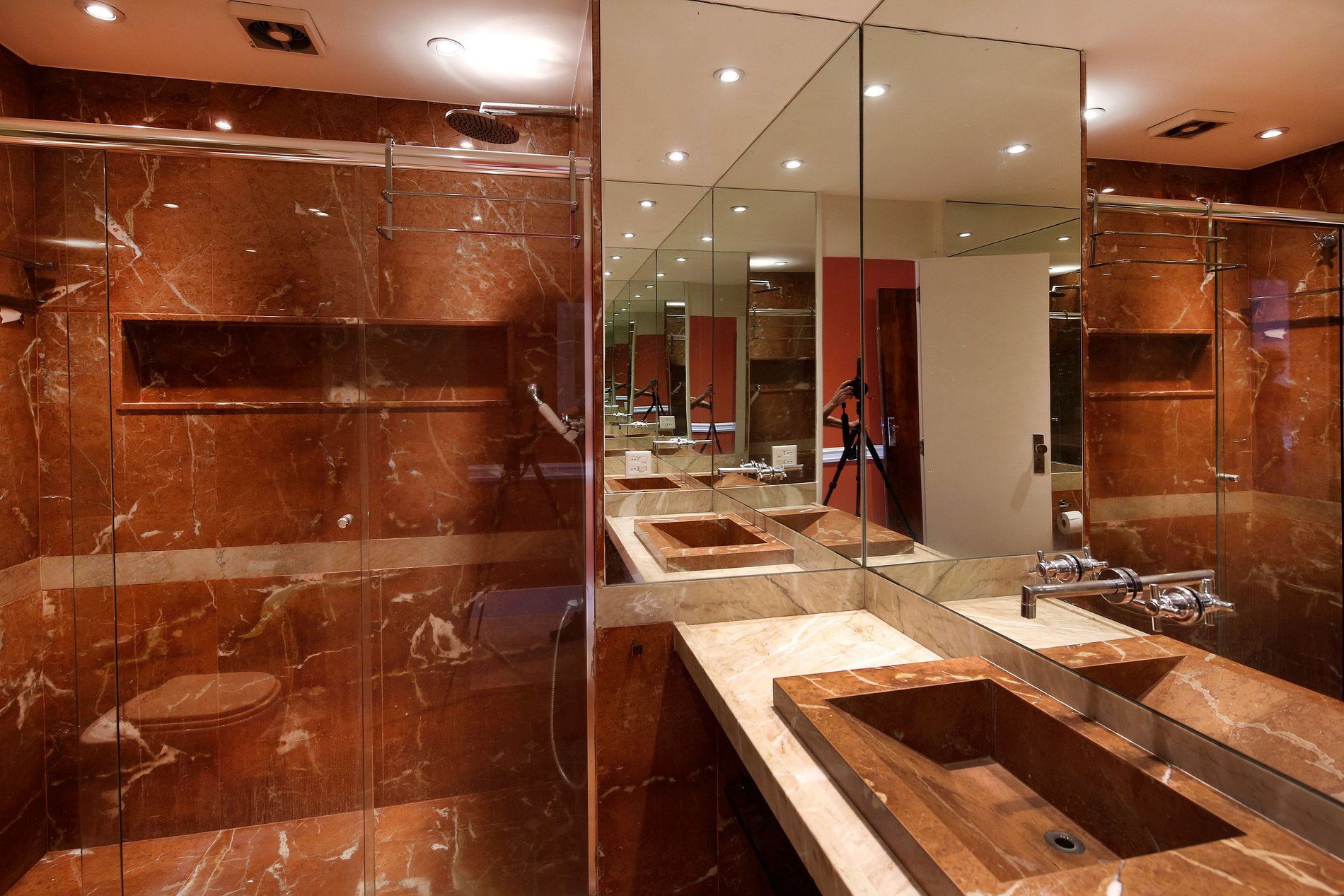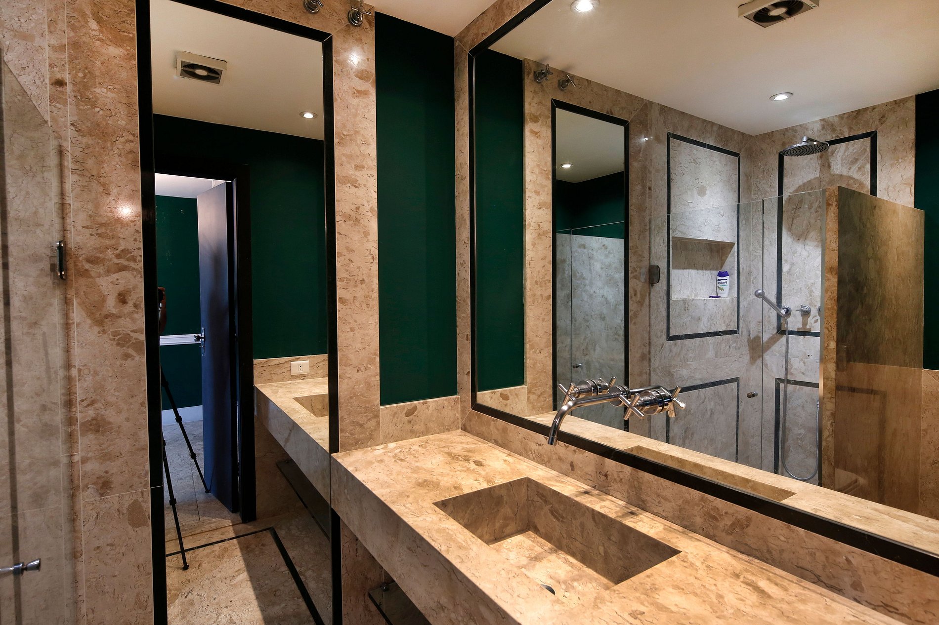 El baño principal tiene un diseño único, todo decorado en mármol negro, incluye un jacuzzi y ducha con vista a la playa de Copacabana y al Cristo Redentor.