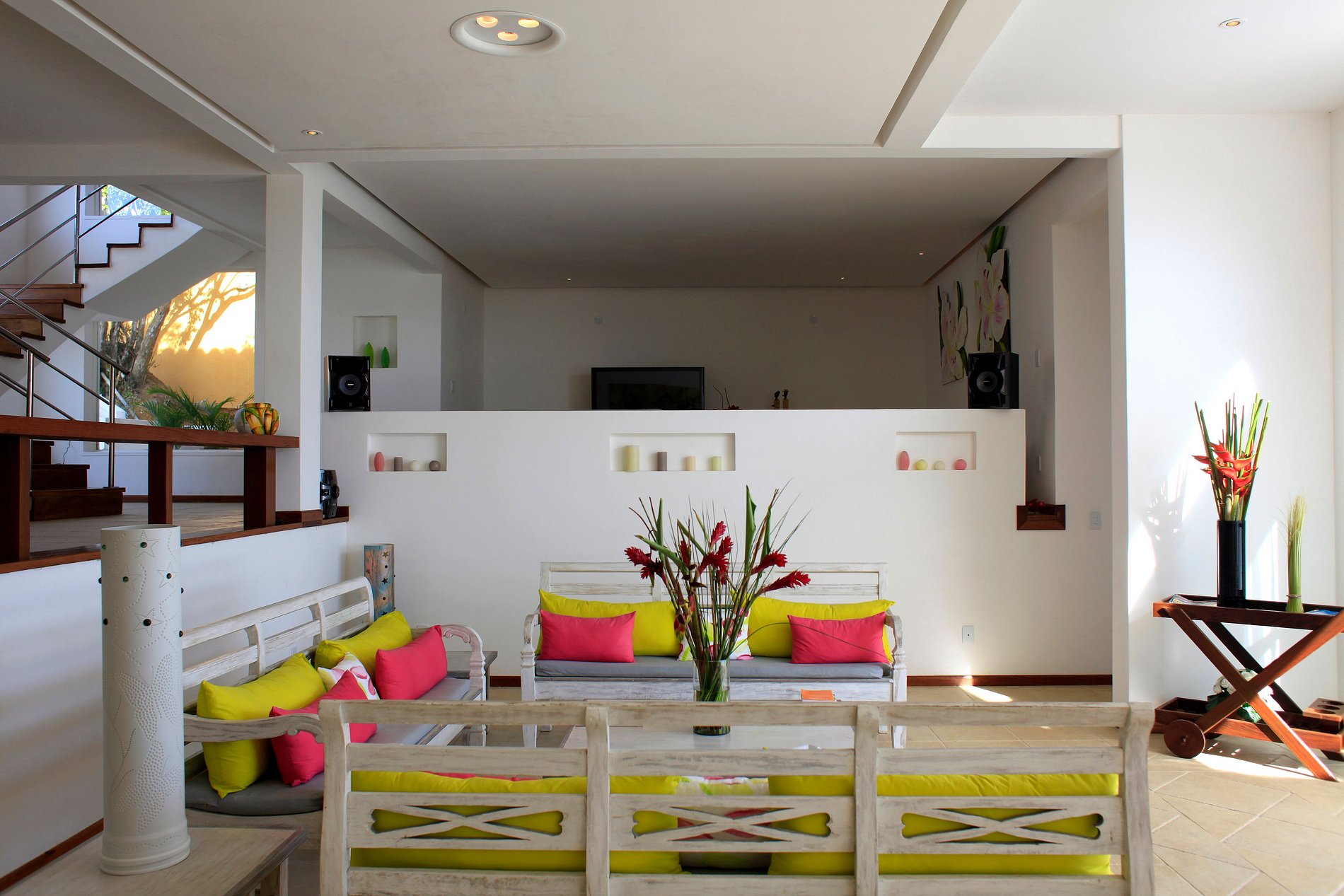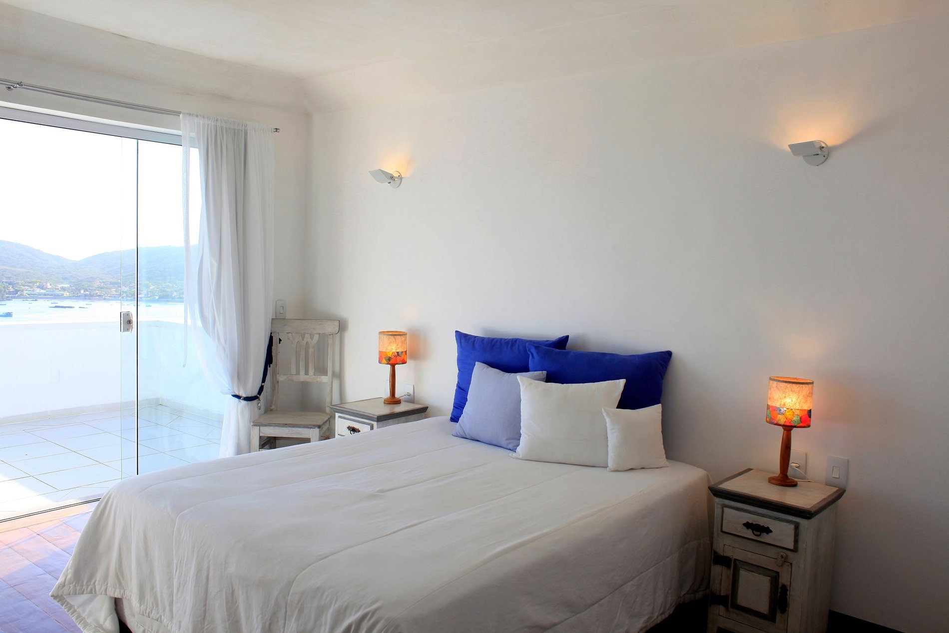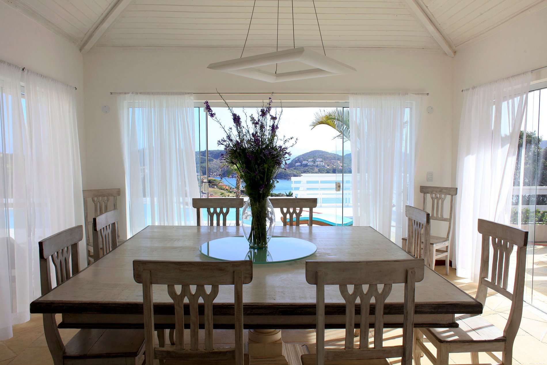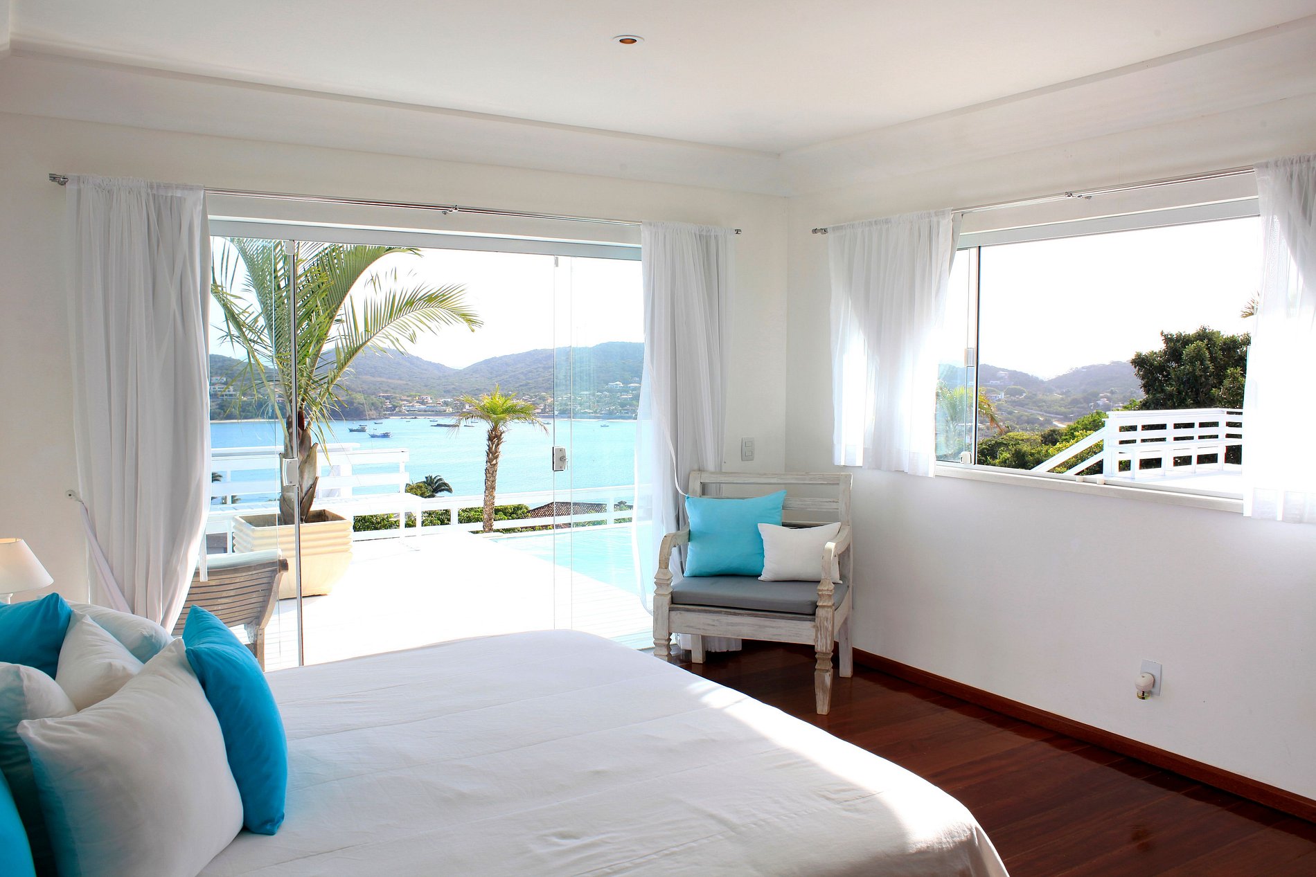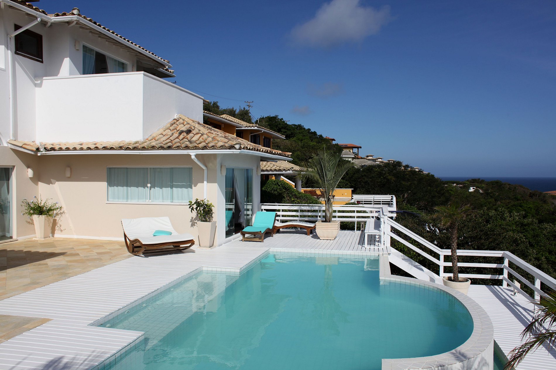 Todas las cuatro suites captura la vista sensacional por debajo de la bahía en herradura. La casa se destaca por la infinita piscina azul, rodeada por un deck de madera blanca con un sentimiento mínimo todavía rústico.