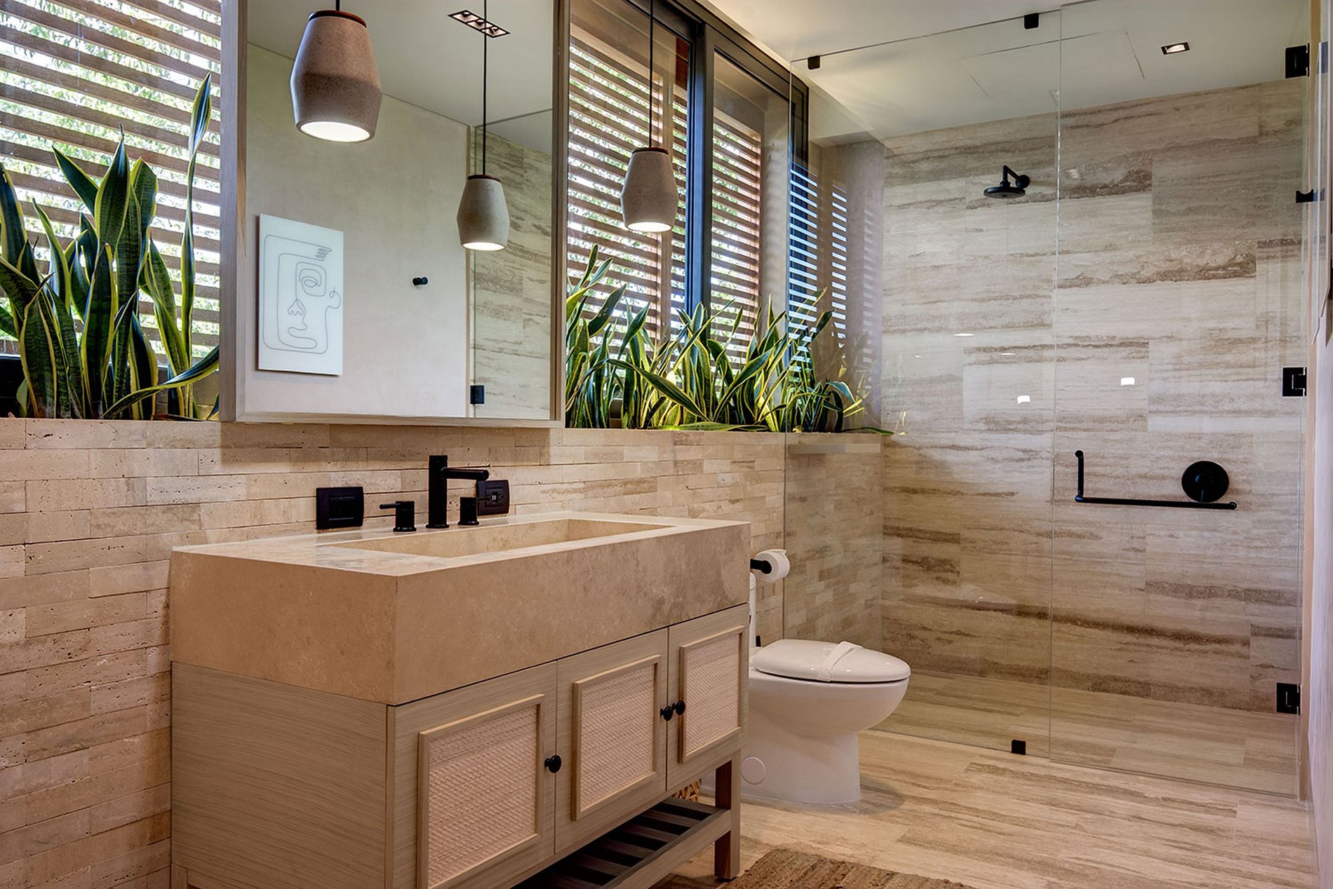 Rodeada de vegetación autóctona, esta residencia presenta un impresionante espacio al aire libre de 900 pies cuadrados, que incluye un salón en la terraza, una elegante piscina de inmersión y amplios balcones. El diseño de la villa en la planta baja combina armoniosamente los interiores modernos con el entorno vibrante, incorporando elementos orgánicos en todas partes. A pesar de su estrecha conexión con la naturaleza, la casa mantiene un ambiente tranquilo y privado, escondido en medio de la vegetación nativa.