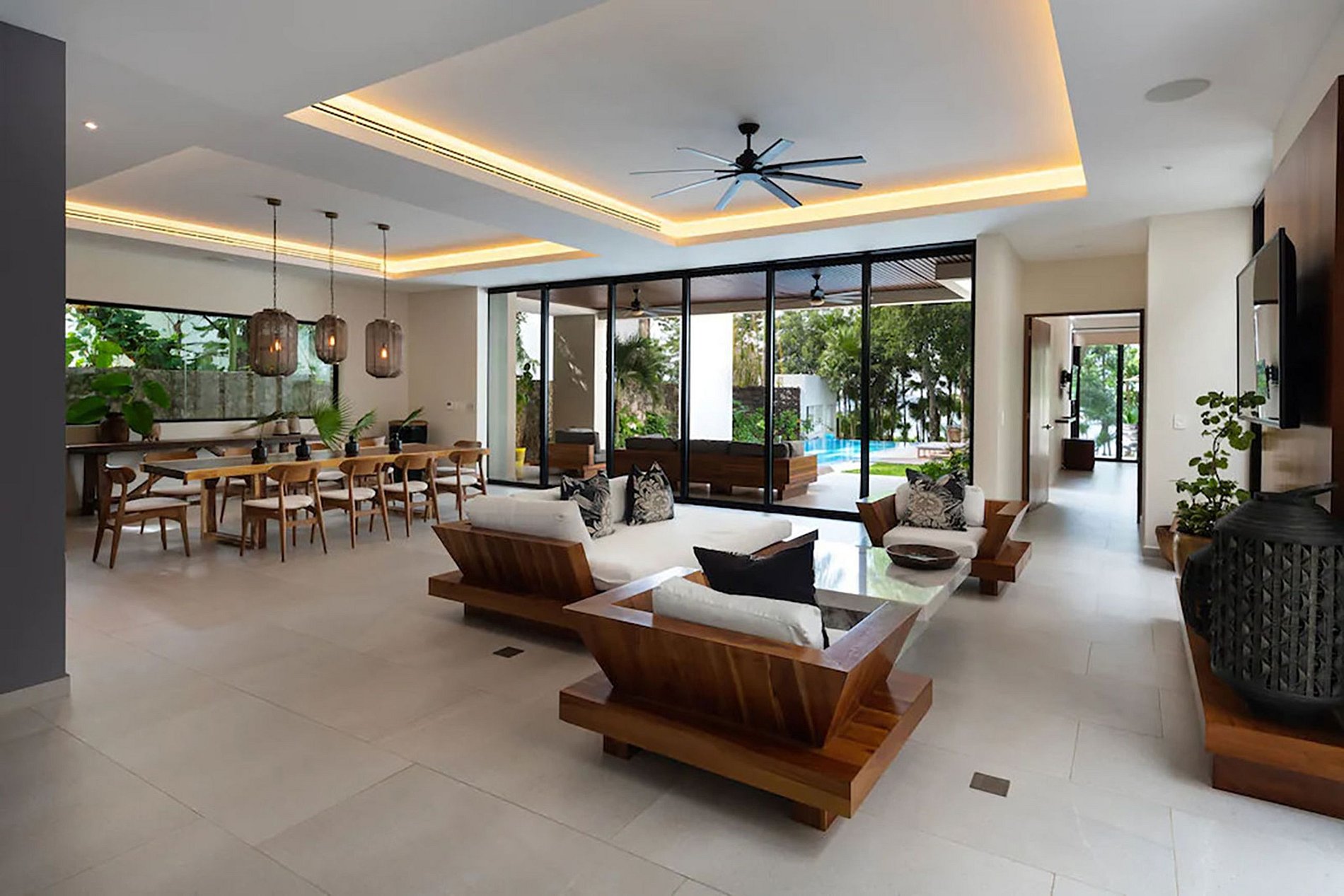 A su llegada, los huéspedes quedan inmediatamente cautivados por la grandeza de la villa, que abarca 7000 pies cuadrados de espacios abiertos y aireados adornados con muebles de diseñador hechos a medida y una decoración elegante contemporánea. Los jardines delanteros, adornados con palmeras que se balancean y abrazados por la exuberante vegetación isleña, brindan una serena bienvenida. A medida que se aventure a la parte trasera de la propiedad, descubrirá la llamativa piscina y dos terrazas con vista al mar amuebladas con cómodos sillones. Estos exclusivos espacios al aire libre ofrecen acceso directo a un tramo tranquilo de la costa, invitándolo a disfrutar de aventuras de natación y esnórquel. Para aquellos que buscan la exploración submarina, los tours de buceo pueden recogerlos convenientemente directamente desde su villa.