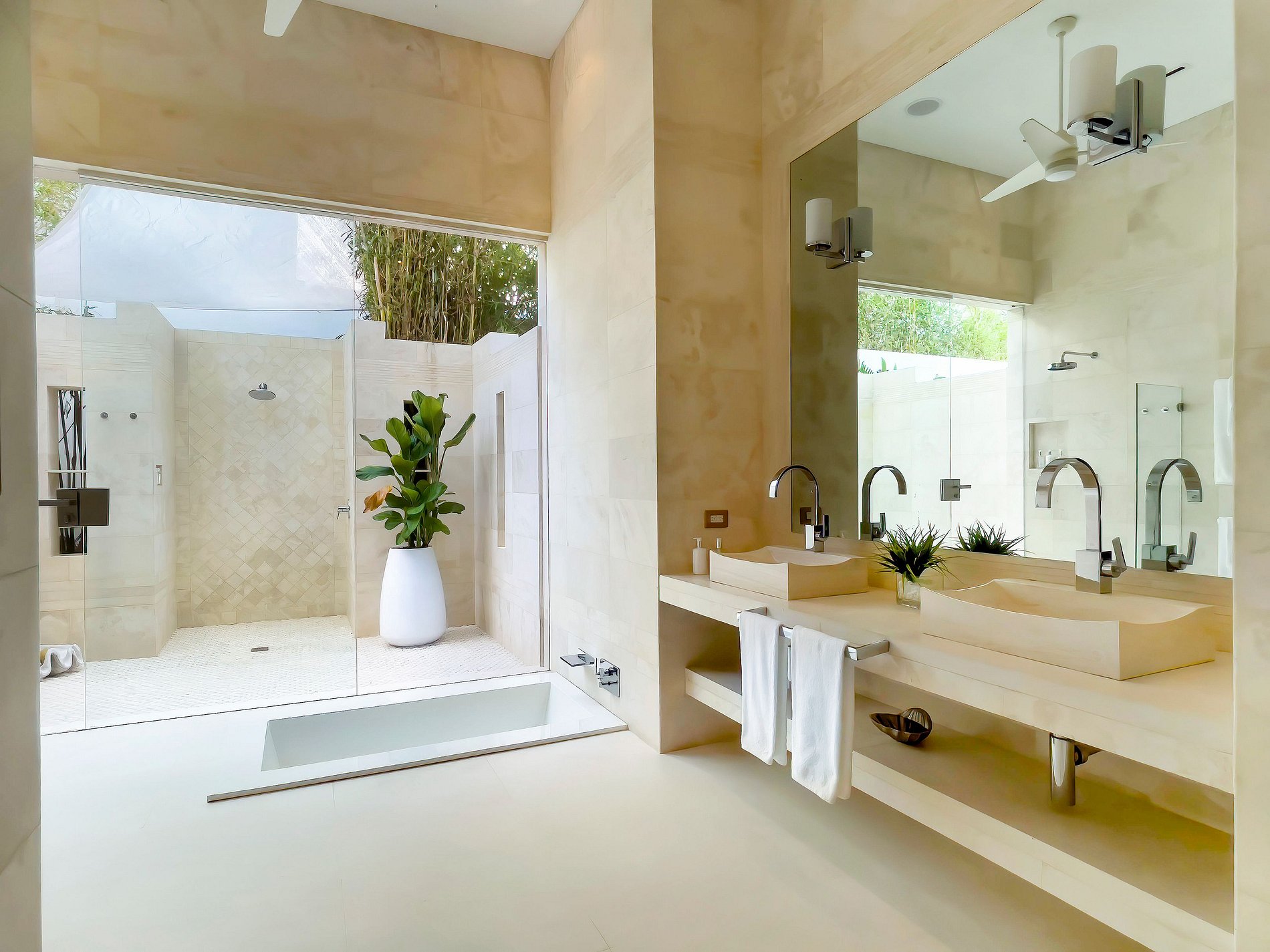 La villa cuenta con un total de ocho habitaciones amplias: siete se encuentran distribuidas en la residencia principal y una en una casa de huéspedes independiente, que ofrece mayor privacidad. Todas las habitaciones tienen camas king-size, baños privados de lujo y vistas al mar, a la piscina o a los jardines. Varios baños incluyen duchas al aire libre, tinas independientes y terrazas privadas.