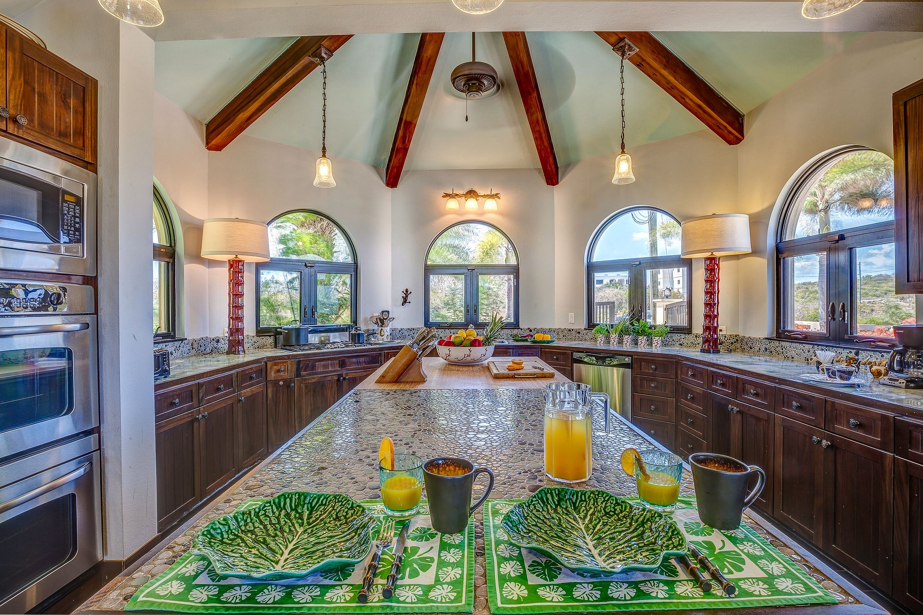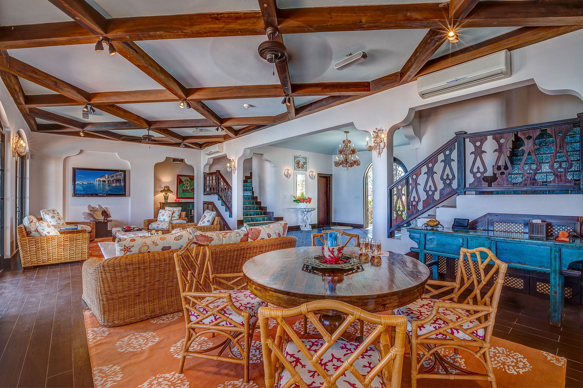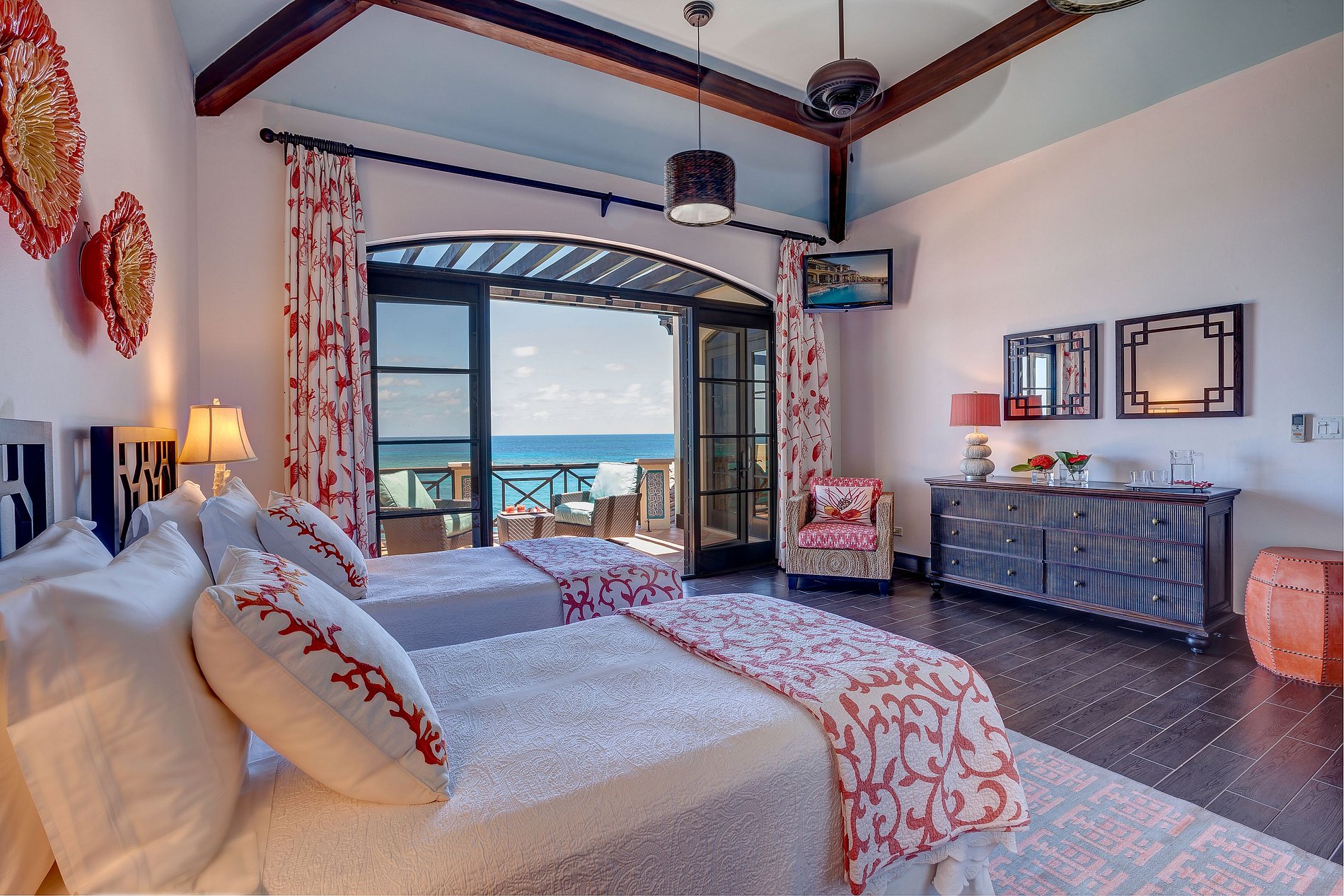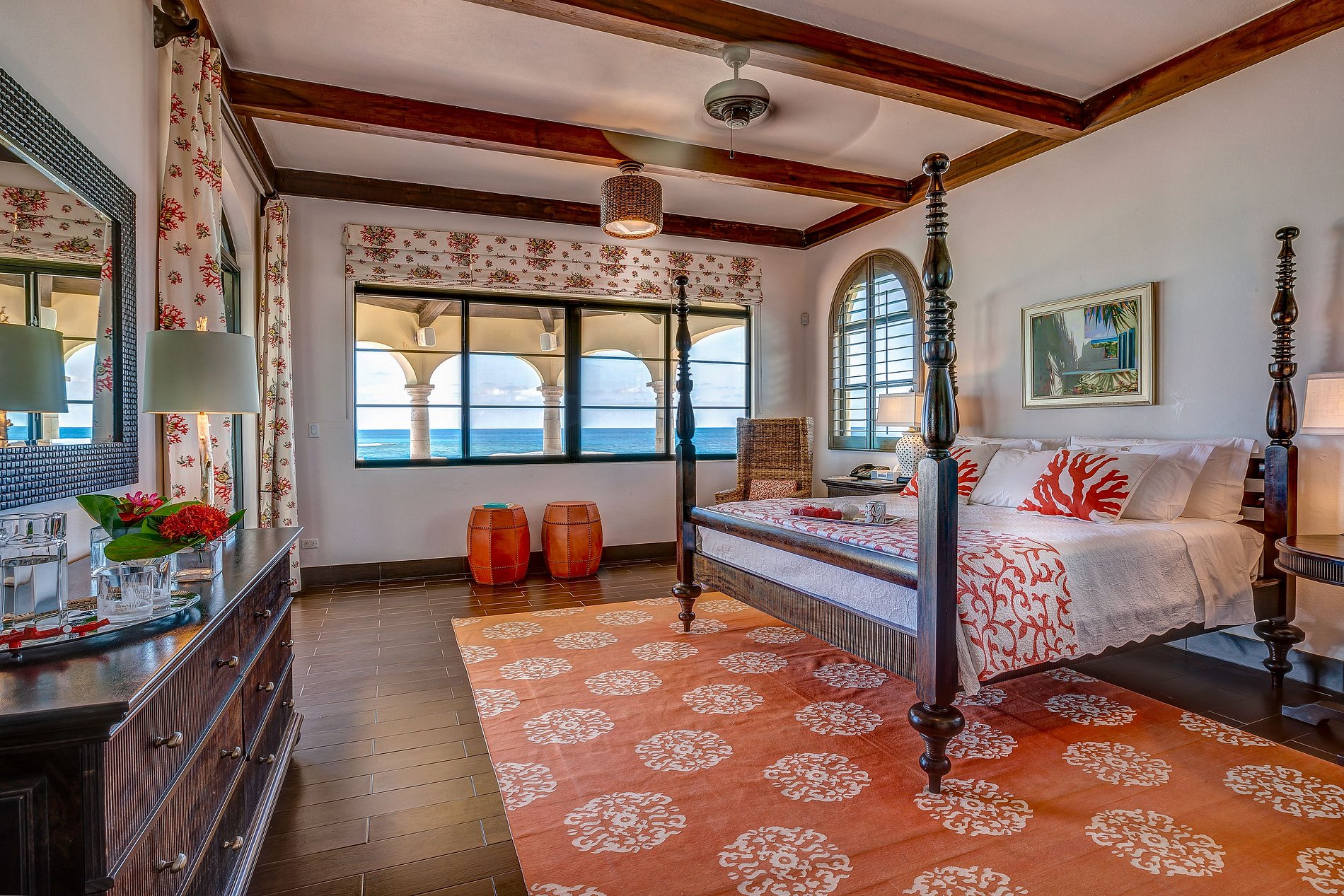 Tras un colorido jardín de entrada, los huéspedes acceden a un gran vestíbulo con vistas abiertas al Atlántico a través de arcos y ventanales. La planta baja tiene un diseño abierto con sala, comedor y cocina integrados que se conectan a la terraza exterior con comedor, bar, jacuzzi y piscina infinita. En este nivel también hay una habitación y una sala de televisión.