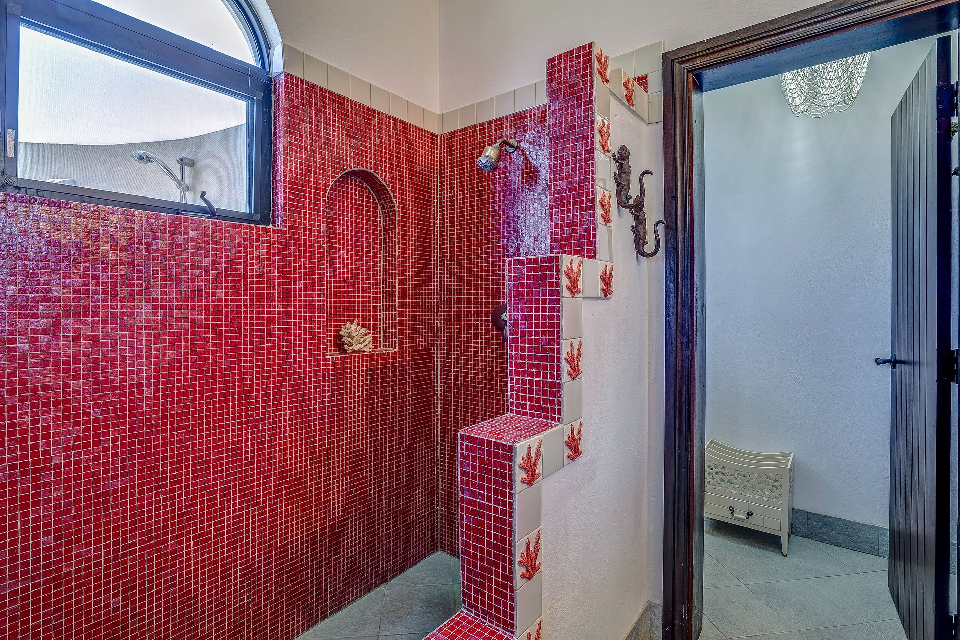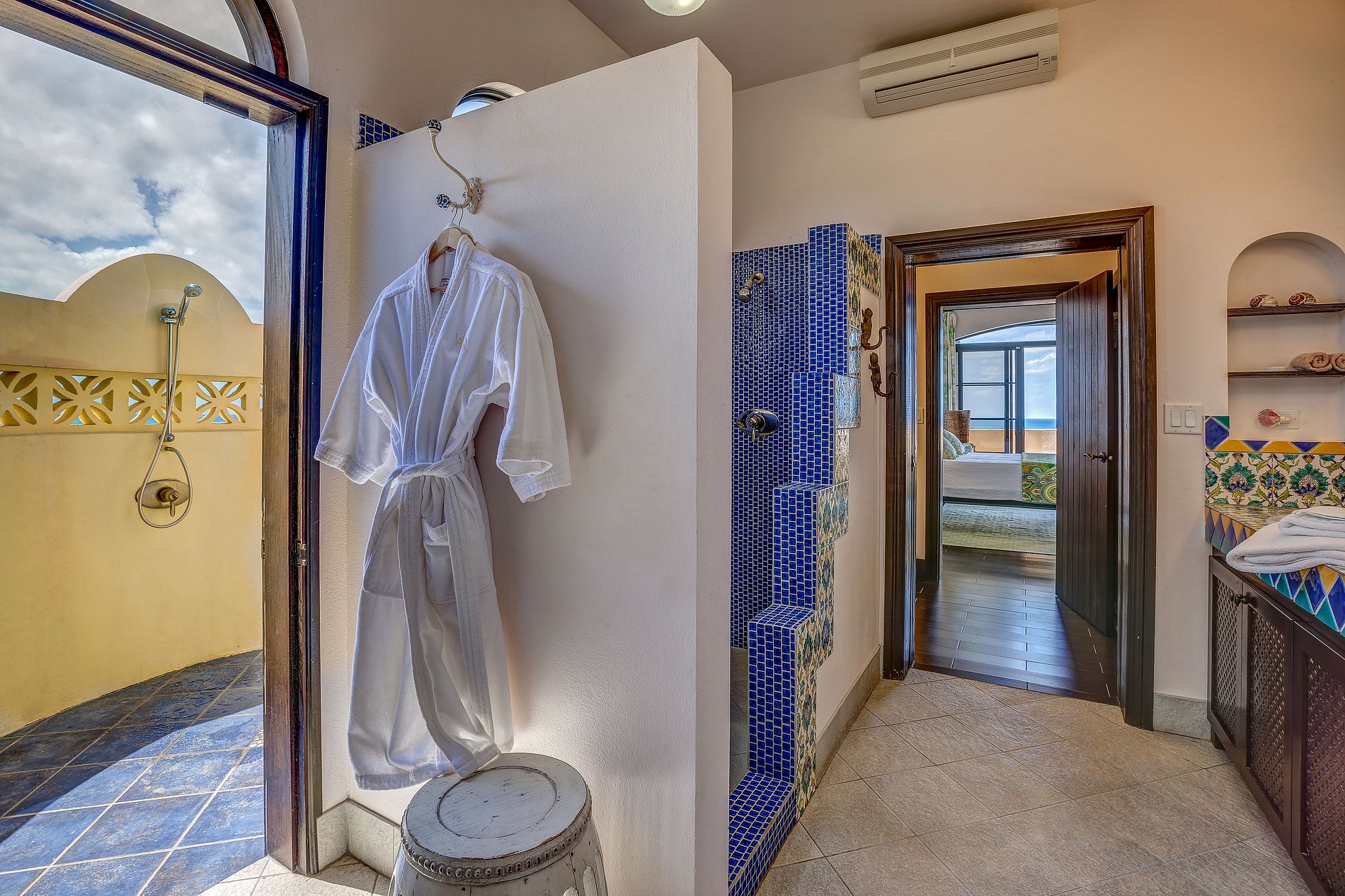En el piso superior, las otras cuatro habitaciones tienen terrazas privadas o compartidas y vistas al océano. Todas cuentan con baños de mármol, y algunas con duchas exteriores para una experiencia única. Un gimnasio independiente al final del camino de entrada está equipado con opciones de cardio y pesas.