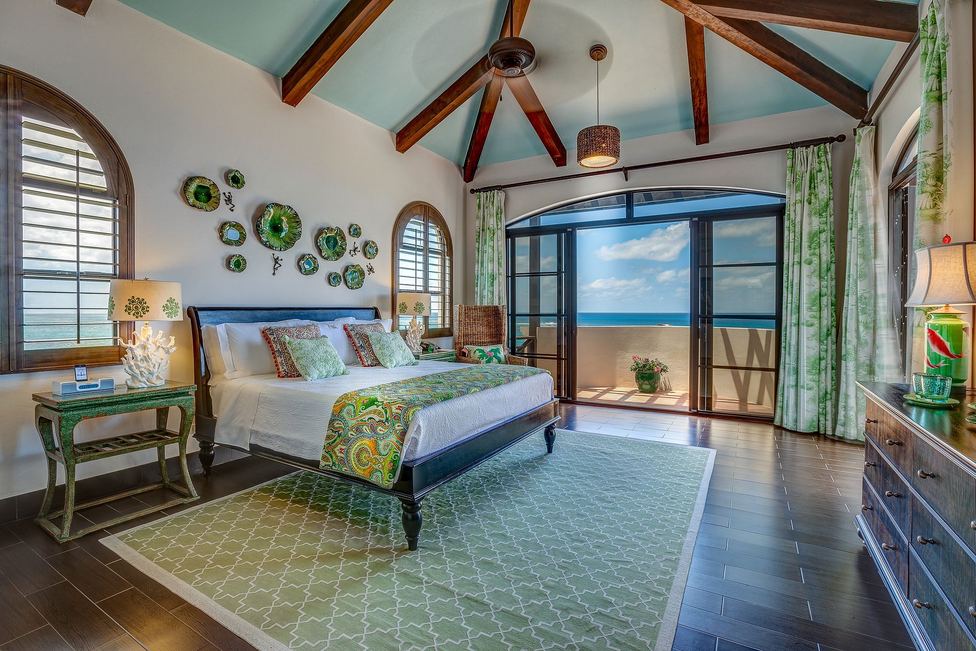 Tras un colorido jardín de entrada, los huéspedes acceden a un gran vestíbulo con vistas abiertas al Atlántico a través de arcos y ventanales. La planta baja tiene un diseño abierto con sala, comedor y cocina integrados que se conectan a la terraza exterior con comedor, bar, jacuzzi y piscina infinita. En este nivel también hay una habitación y una sala de televisión.
