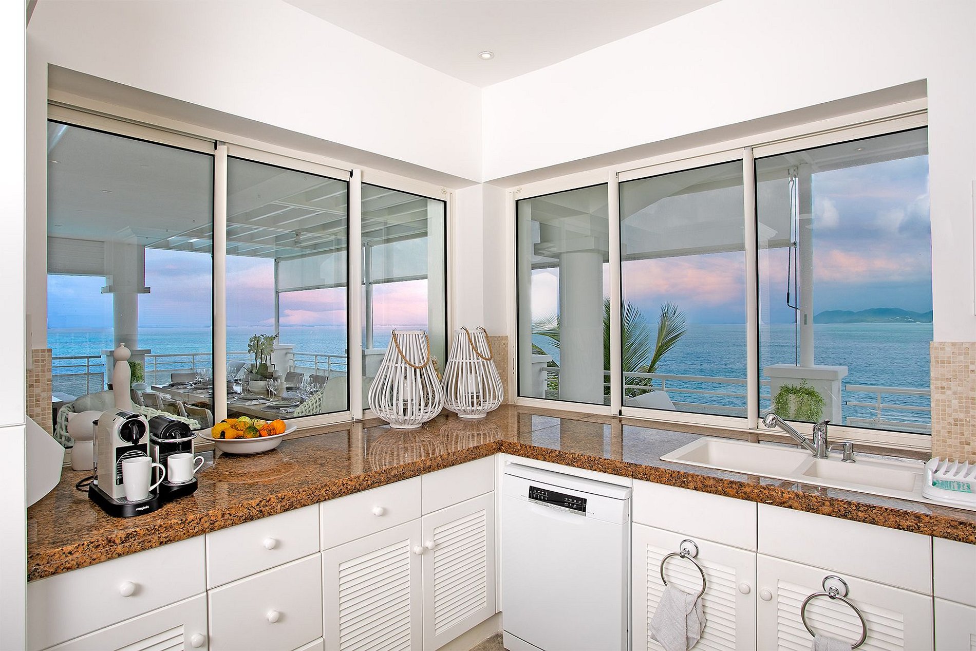 La entrada principal da paso a un vestíbulo abovedado y a un espacio interior luminoso con techos altos, pisos de piedra natural y vistas abiertas al mar a través de puertas de vidrio de piso a techo. El diseño de planta abierta conecta las zonas de comedor interior y exterior, una sala de televisión y una cocina gourmet con electrodomésticos profesionales y vistas al océano. La amplia terraza lleva a una piscina asimétrica sobre el acantilado, mientras que una segunda piscina con camastros integrados y gazebo se encuentra justo sobre la playa.