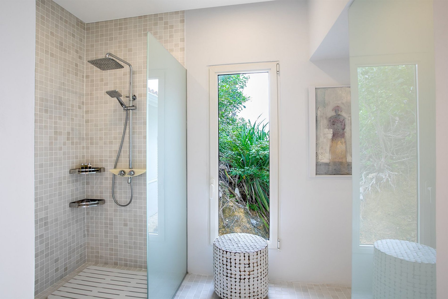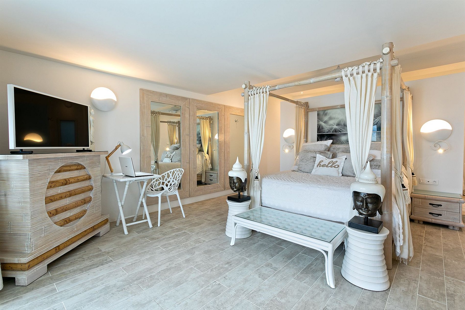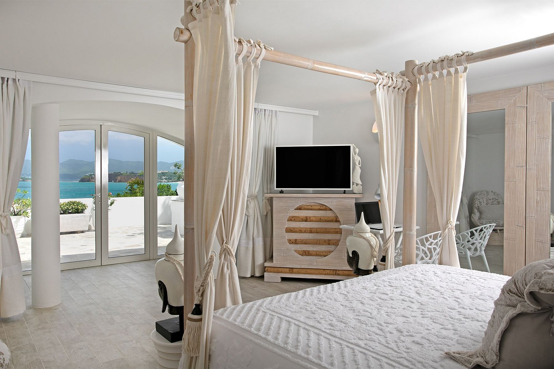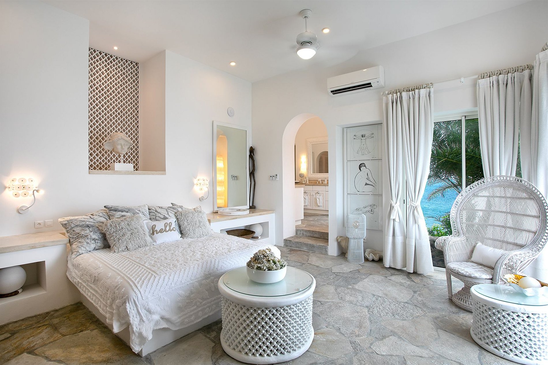 Las seis habitaciones tienen vista al mar y baño privado, camas king, TV, caja fuerte y Wi-Fi. Tres son suites principales: una con terraza y bañera de hidromasaje; otra con ducha al borde del acantilado y bañera circular; y una tercera con cama de dosel y vista directa al mar. Cada baño está diseñado con detalles tipo spa y acabados sofisticados.