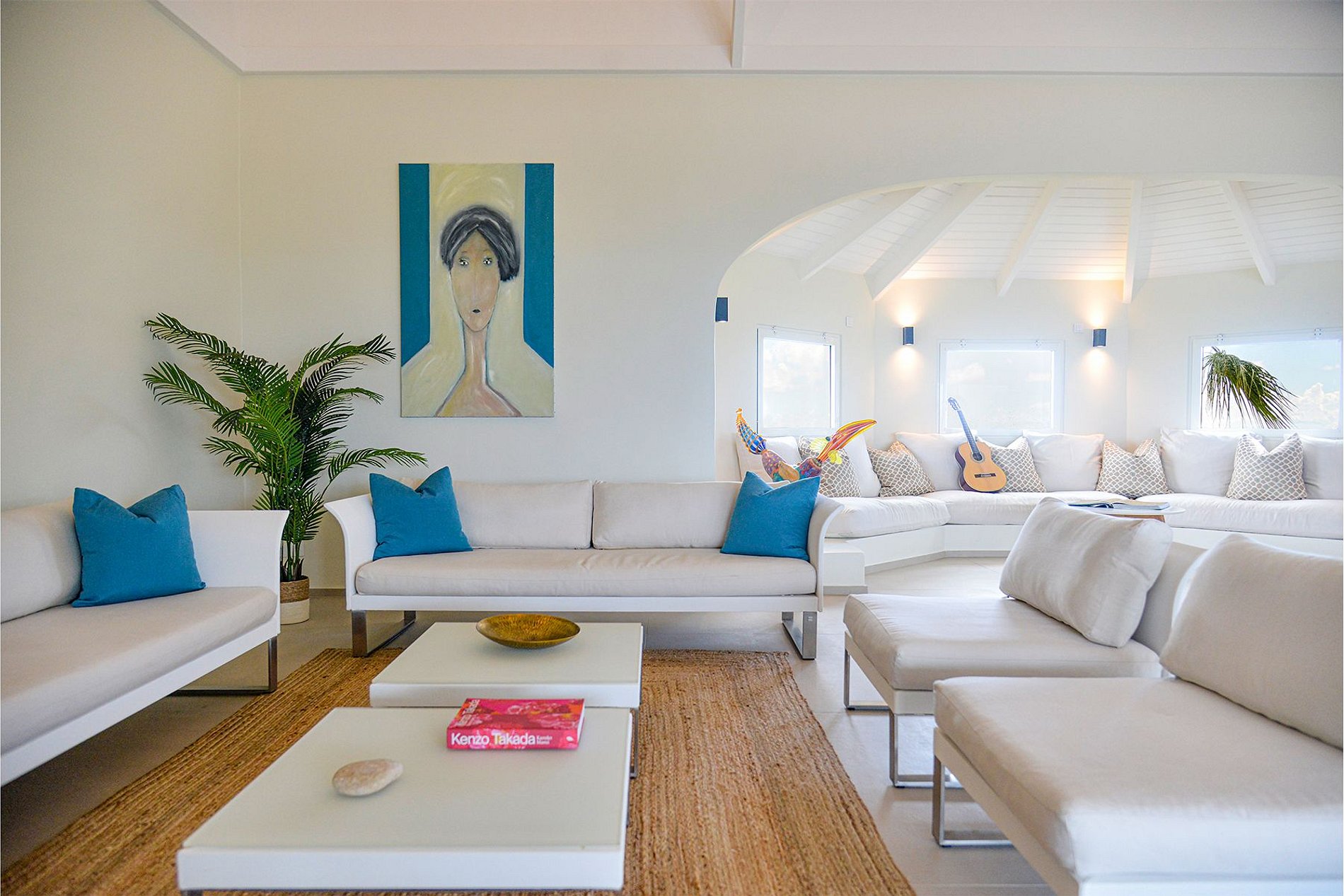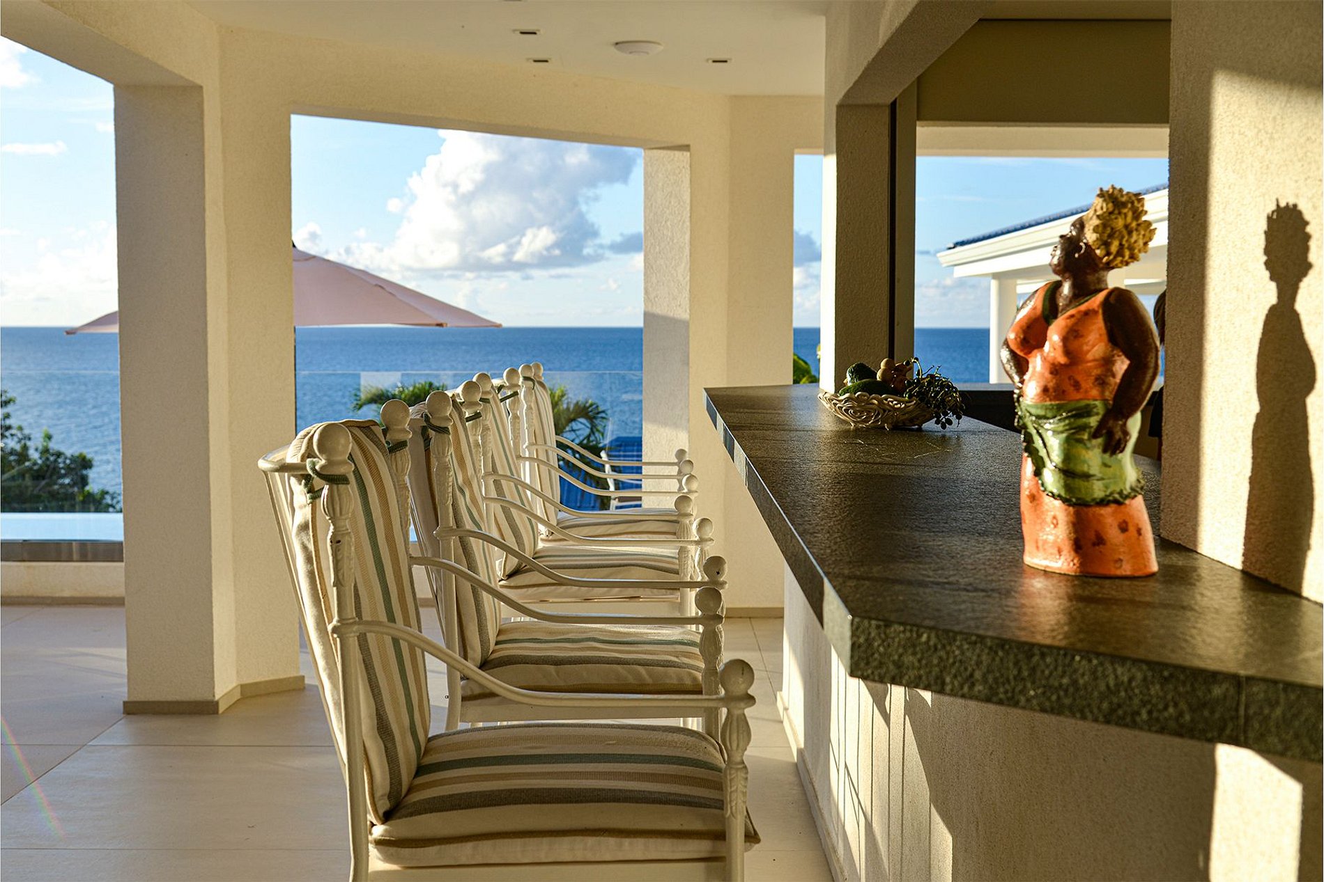 La villa se organiza en torno a un área social central y una cocina con gabinetes de madera, encimeras de granito, máquina Nespresso y doble refrigeración. Un comedor y un rincón de desayuno ofrecen vistas amplias hacia La Belle Creole y están decorados con obras de la artista local Natalie Lepine. La terraza rodea los espacios principales con múltiples zonas para tomar el sol, descansar en el gazebo o sentarse en silencio frente al mar.