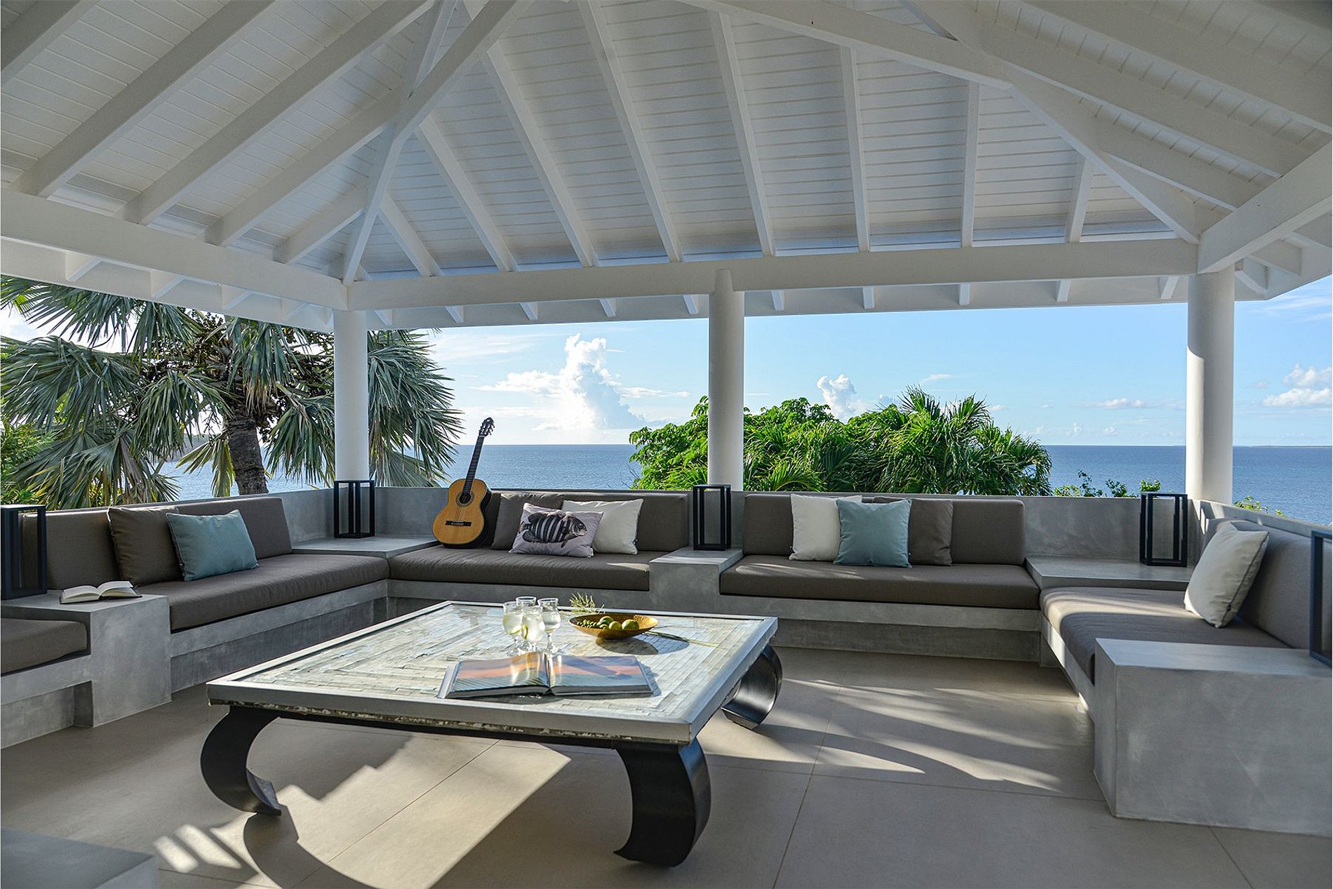 La villa se organiza en torno a un área social central y una cocina con gabinetes de madera, encimeras de granito, máquina Nespresso y doble refrigeración. Un comedor y un rincón de desayuno ofrecen vistas amplias hacia La Belle Creole y están decorados con obras de la artista local Natalie Lepine. La terraza rodea los espacios principales con múltiples zonas para tomar el sol, descansar en el gazebo o sentarse en silencio frente al mar.