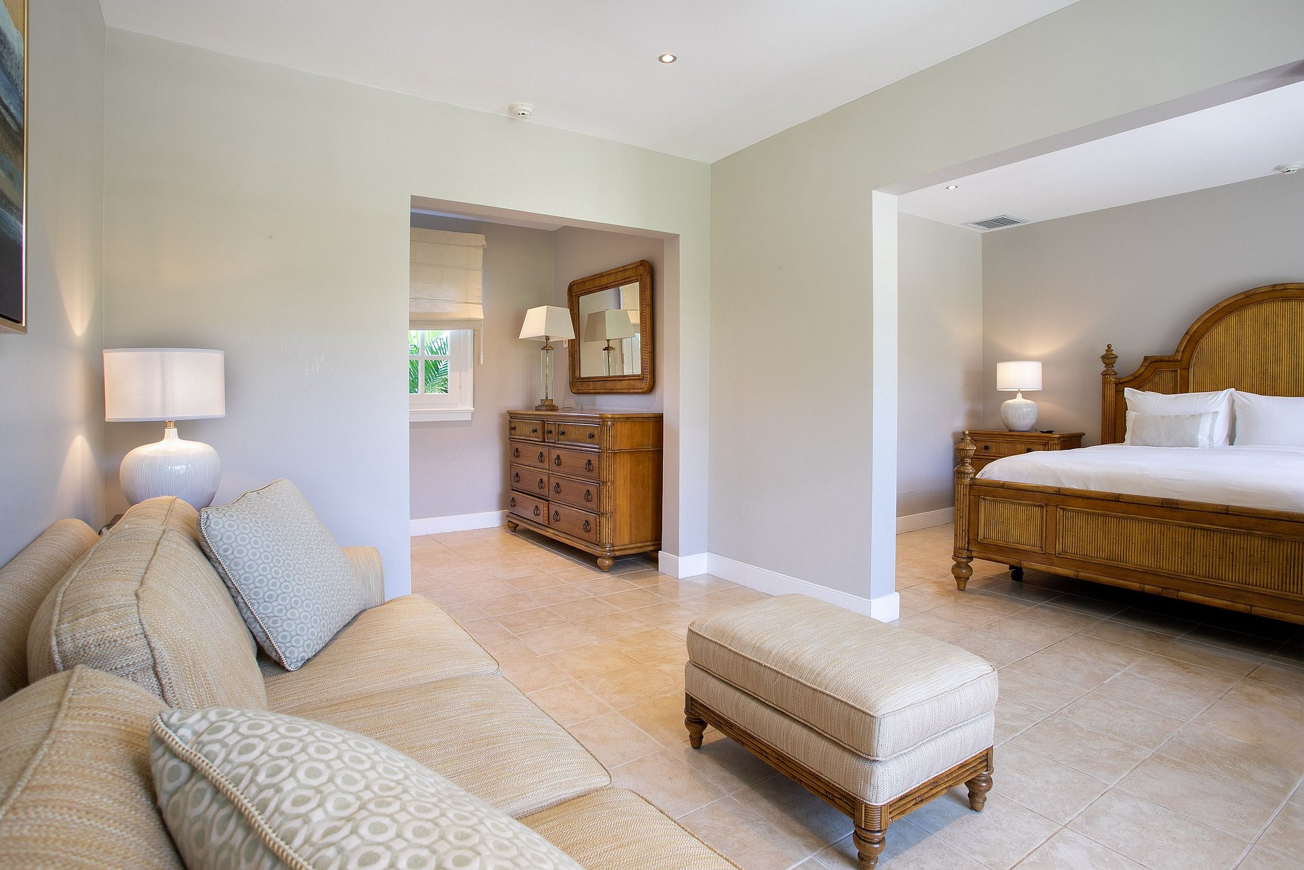 La villa frente al mar cuenta con seis habitaciones con cama king y baño en suite, incluida una suite principal de dos niveles con jacuzzi, dos balcones y vistas al océano. Las áreas sociales incluyen sala, comedor formal, comedor exterior informal, sala de TV y una cocina completamente equipada. La casa del jardín ofrece cuatro habitaciones más, una sala acogedora, comedor y cocina profesional de tipo industrial.