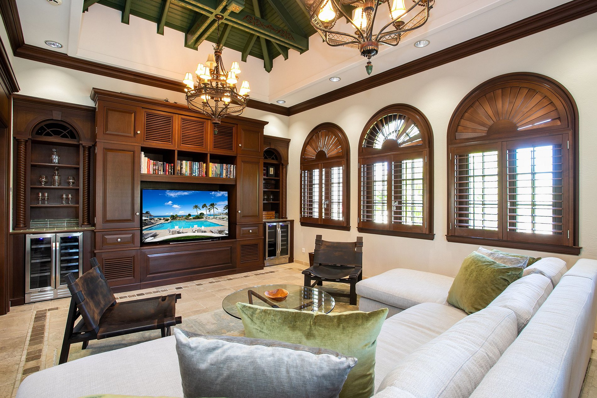 La villa frente al mar cuenta con seis habitaciones con cama king y baño en suite, incluida una suite principal de dos niveles con jacuzzi, dos balcones y vistas al océano. Las áreas sociales incluyen sala, comedor formal, comedor exterior informal, sala de TV y una cocina completamente equipada. La casa del jardín ofrece cuatro habitaciones más, una sala acogedora, comedor y cocina profesional de tipo industrial.