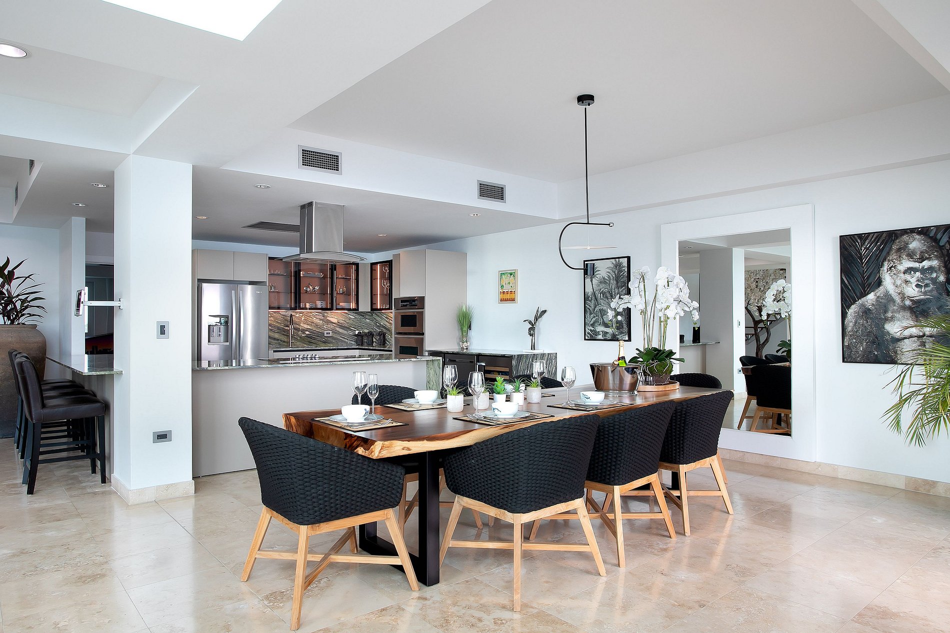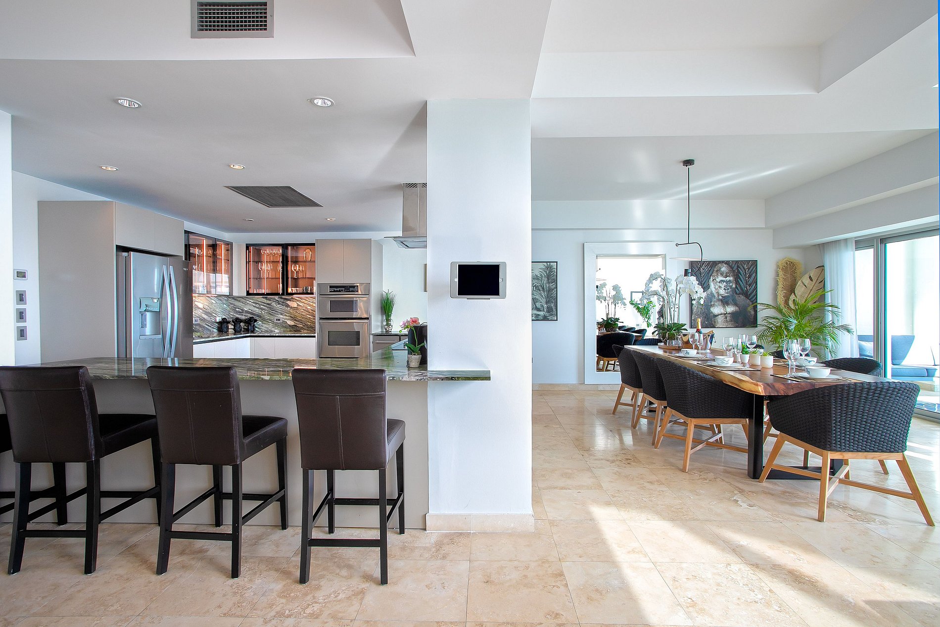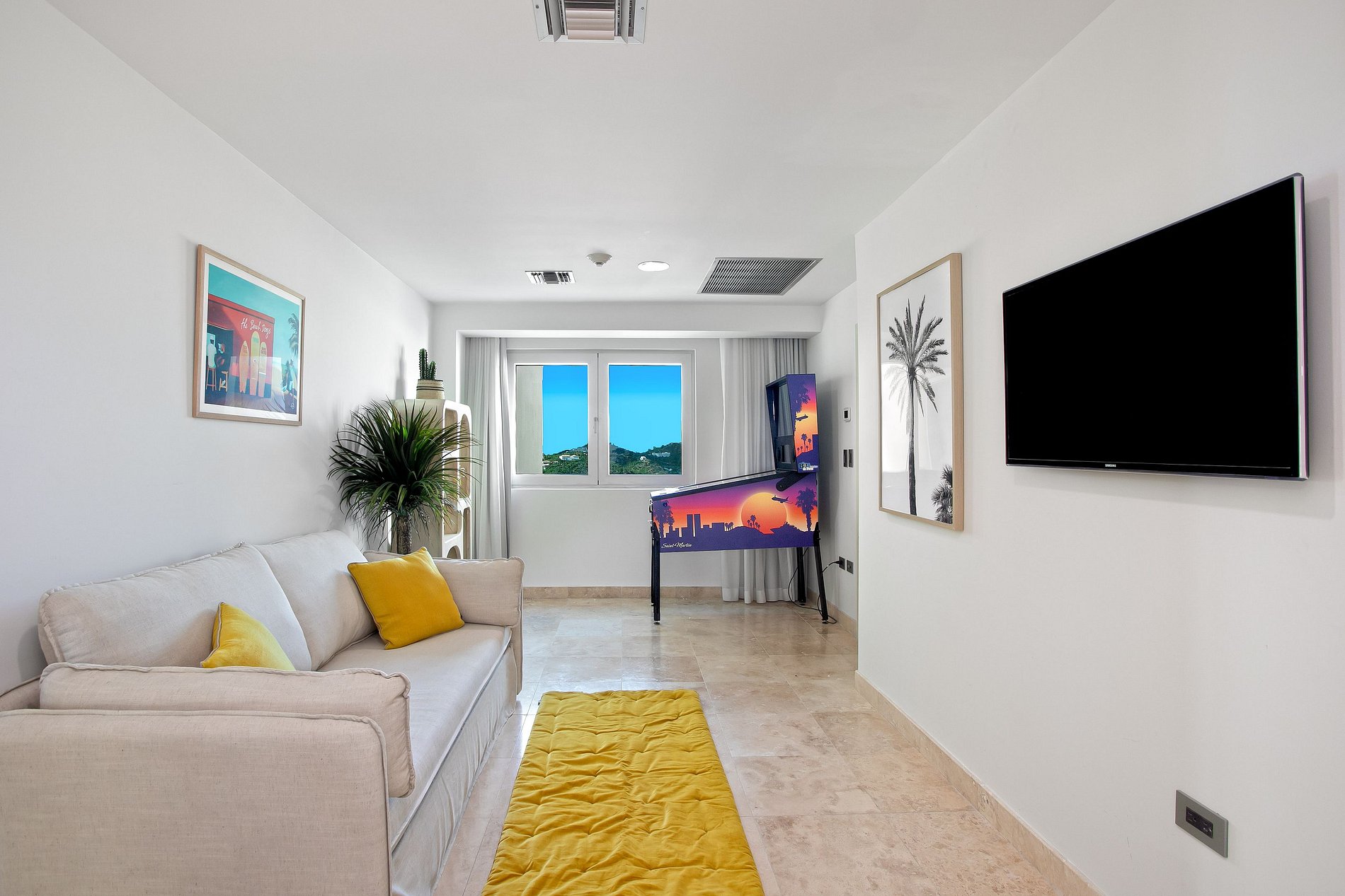 El penthouse tiene cuatro habitaciones, cada una con baño en suite y terraza privada. La principal incluye además un cuarto anexo con litera doble, ideal para niños. Las áreas sociales están decoradas con arte seleccionado, e incluyen una sala de juegos con máquina de pinball, perfecta para familias.
