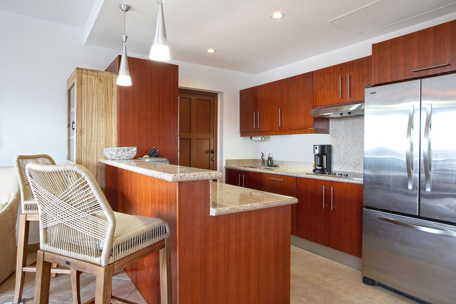 La habitación cuenta con cama king y un amplio baño en suite con lavamanos dobles, ducha tipo walk-in y bañera ideal para baños largos y relajantes. La cocina abierta, en roble rojo, está completamente equipada y se integra a una sala y comedor llenos de luz natural.