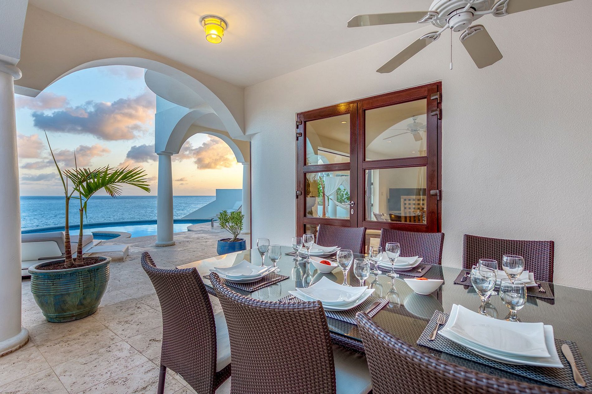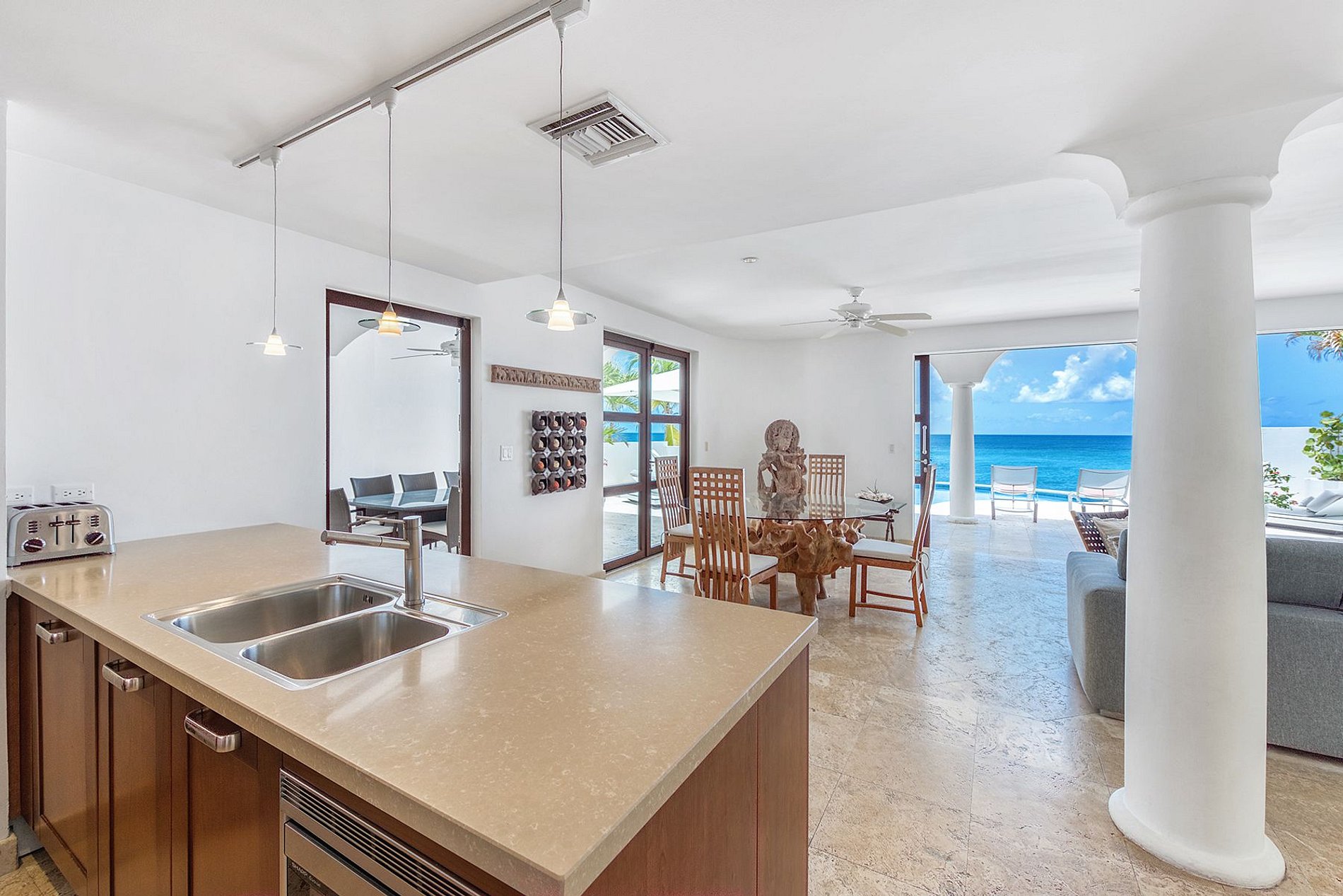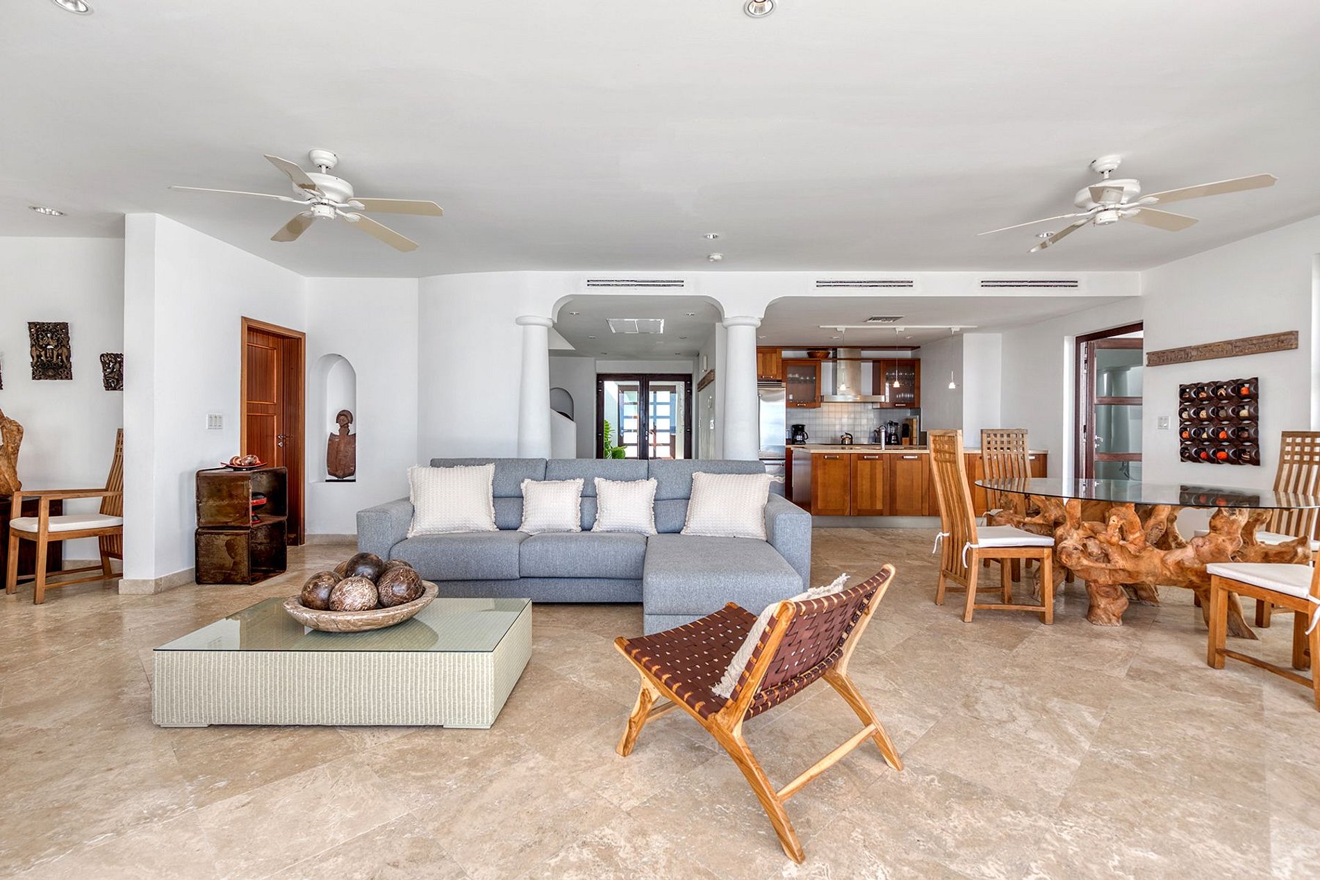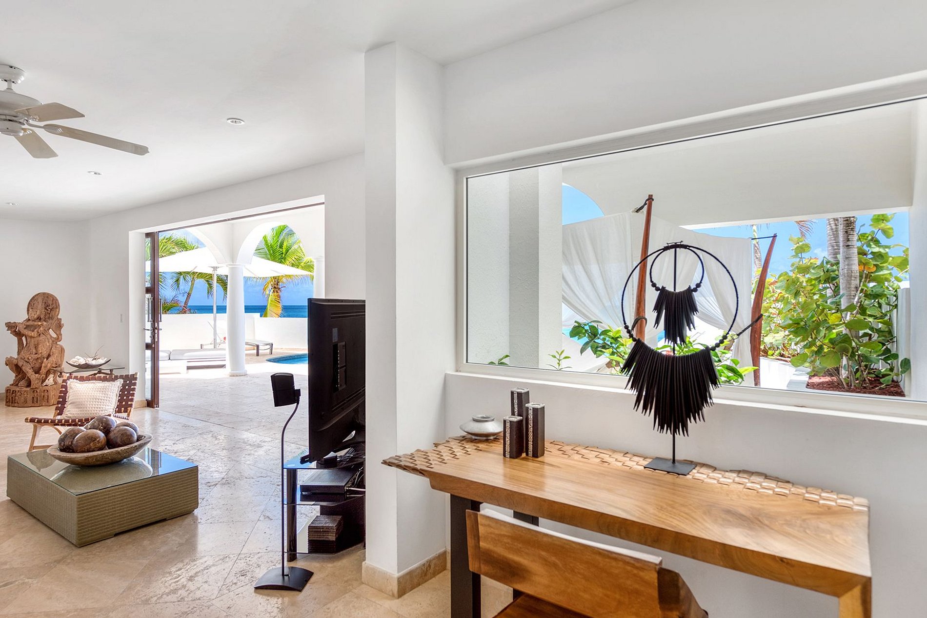 El espacio interior se conecta sin interrupciones con la terraza cubierta, la piscina infinita y la entrada privada a la playa. Los interiores presentan tonos neutros y texturas naturales, acentuados por elementos asiáticos y africanos. El diseño de planta abierta incluye una cocina totalmente equipada con electrodomésticos de lujo, un comedor con mesa de vidrio y madera flotante, una sala de medios y una zona de descanso con hamaca exterior.