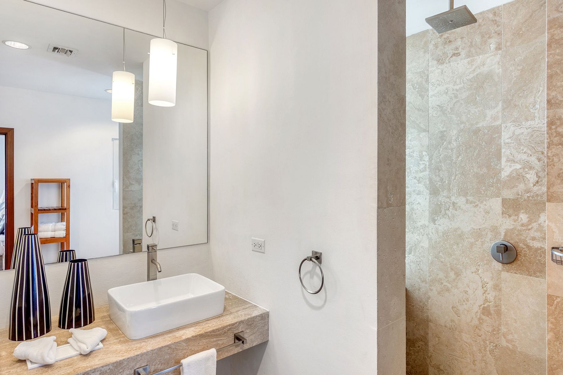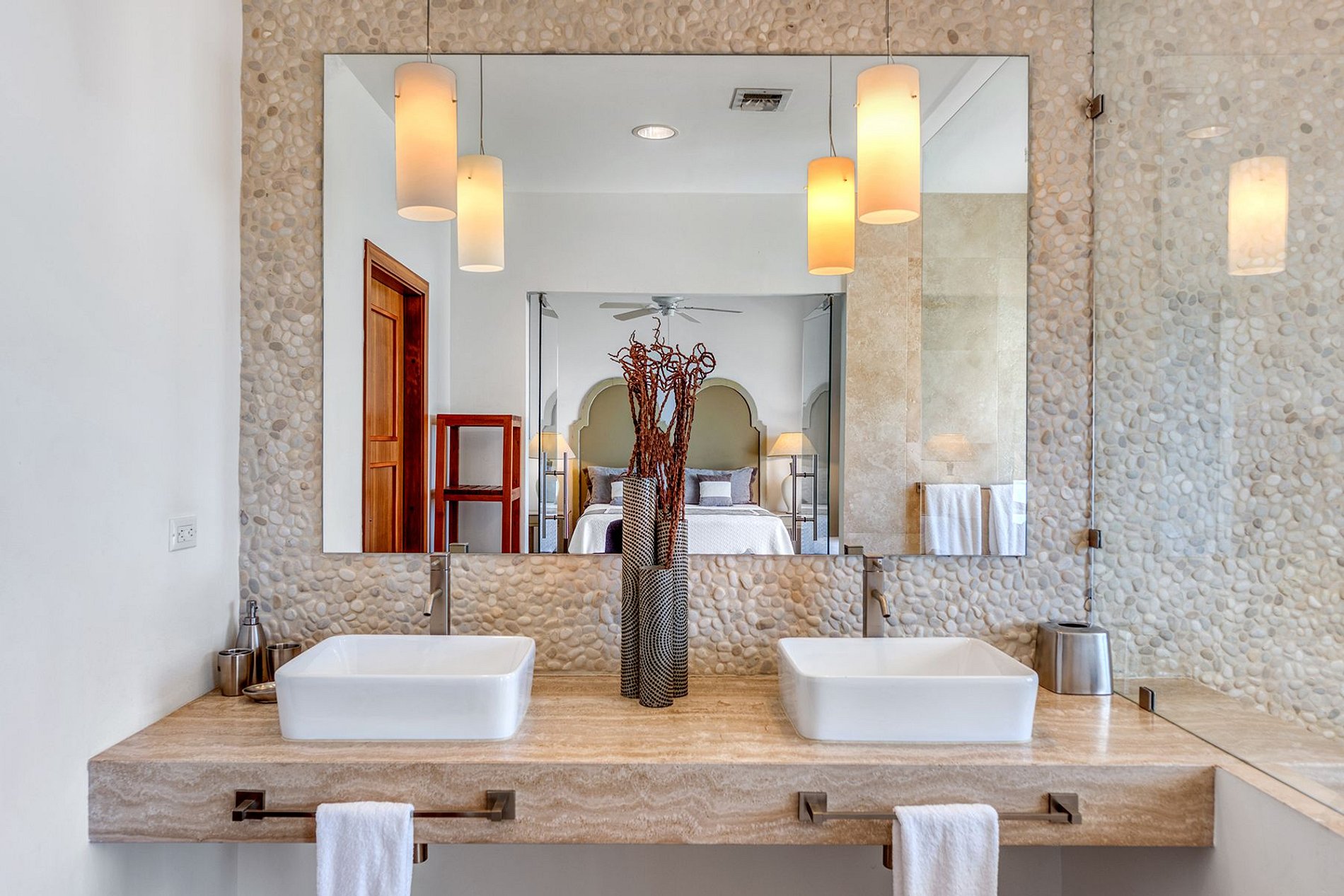 Las tres habitaciones con cama king tienen vista al mar, área de descanso privada y baño estilo spa con duchas tipo walk-in. Dos suites están en el nivel superior, separadas por un pasillo para mayor privacidad, y la tercera en el nivel principal, con acceso directo a la terraza de la piscina. Todas cuentan con clósets a medida, televisores y textiles y obras de arte seleccionadas.