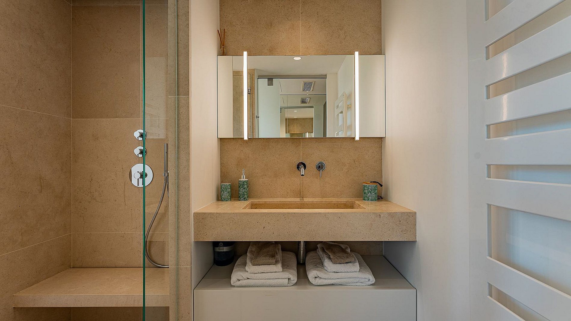 - Habitación 2 (Suite Principal): Cama doble (200cm), baño con ducha y bañera, WC, vestidor amplio, terraza con vistas a la piscina y al mar.