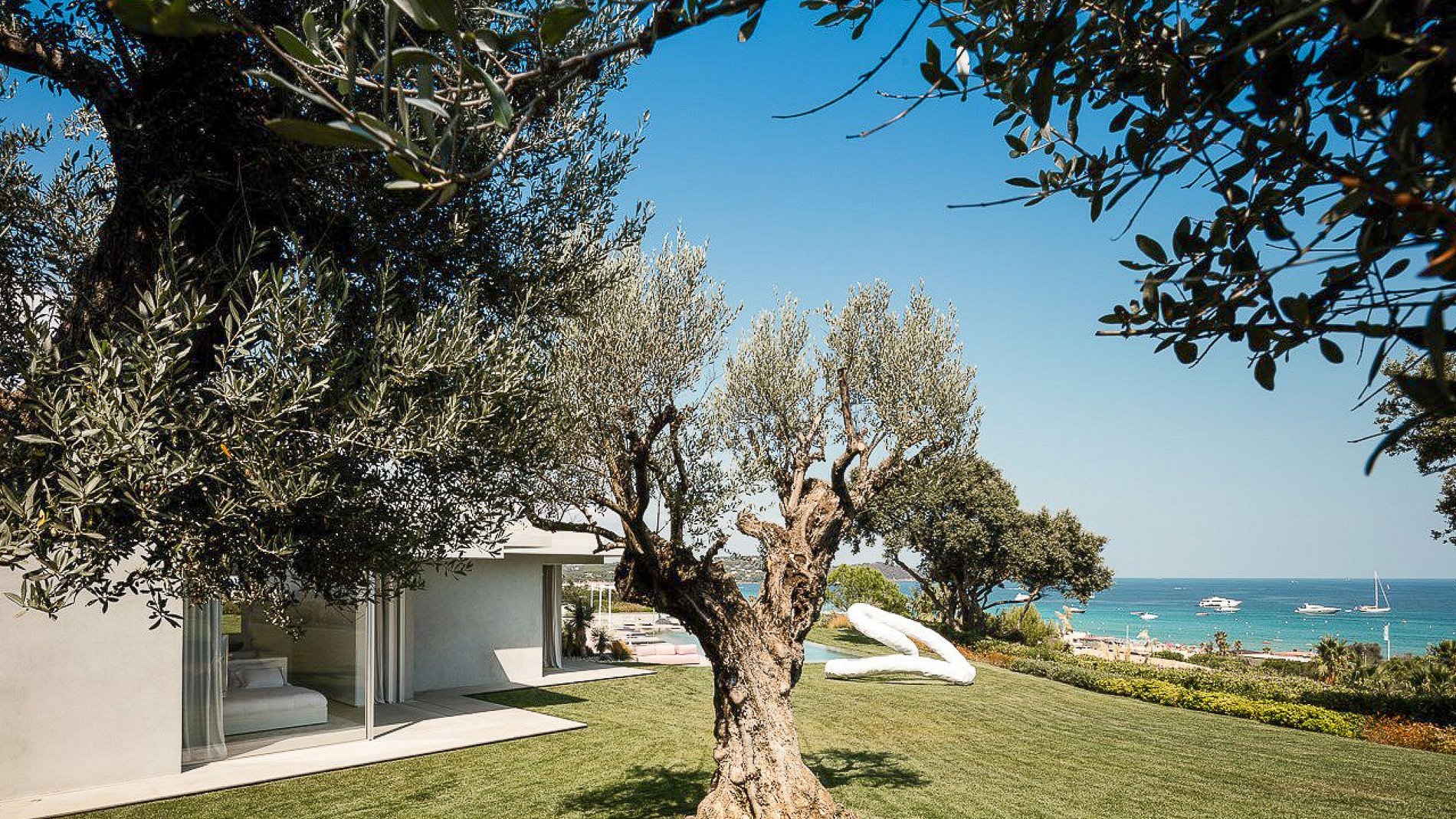 Rodeada por un jardín mediterráneo con olivos centenarios, la villa se abre hacia una impresionante piscina espejo climatizada, tumbonas en tonos rosa empolvado y un área exterior ideal para disfrutar del sol de la Costa Azul. Entre sus comodidades adicionales se encuentran un cine privado, garaje y helipuerto, garantizando llegadas y salidas discretas.