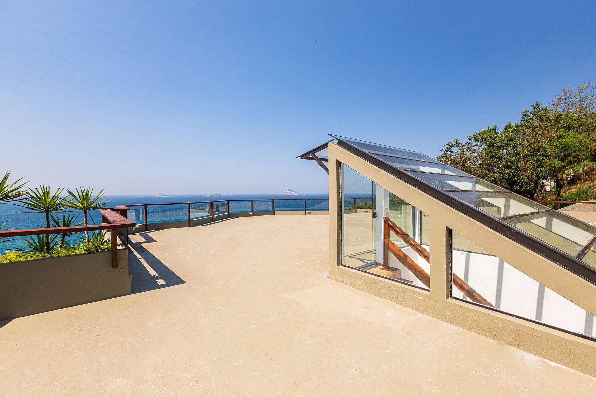 La terraza de la casa está compuesta por un gran espacio para eventos al aire libre, parrilla, alberca y una vista panorámica que va desde el barrio de São Conrado hasta el mar hasta donde alcanza la vista.