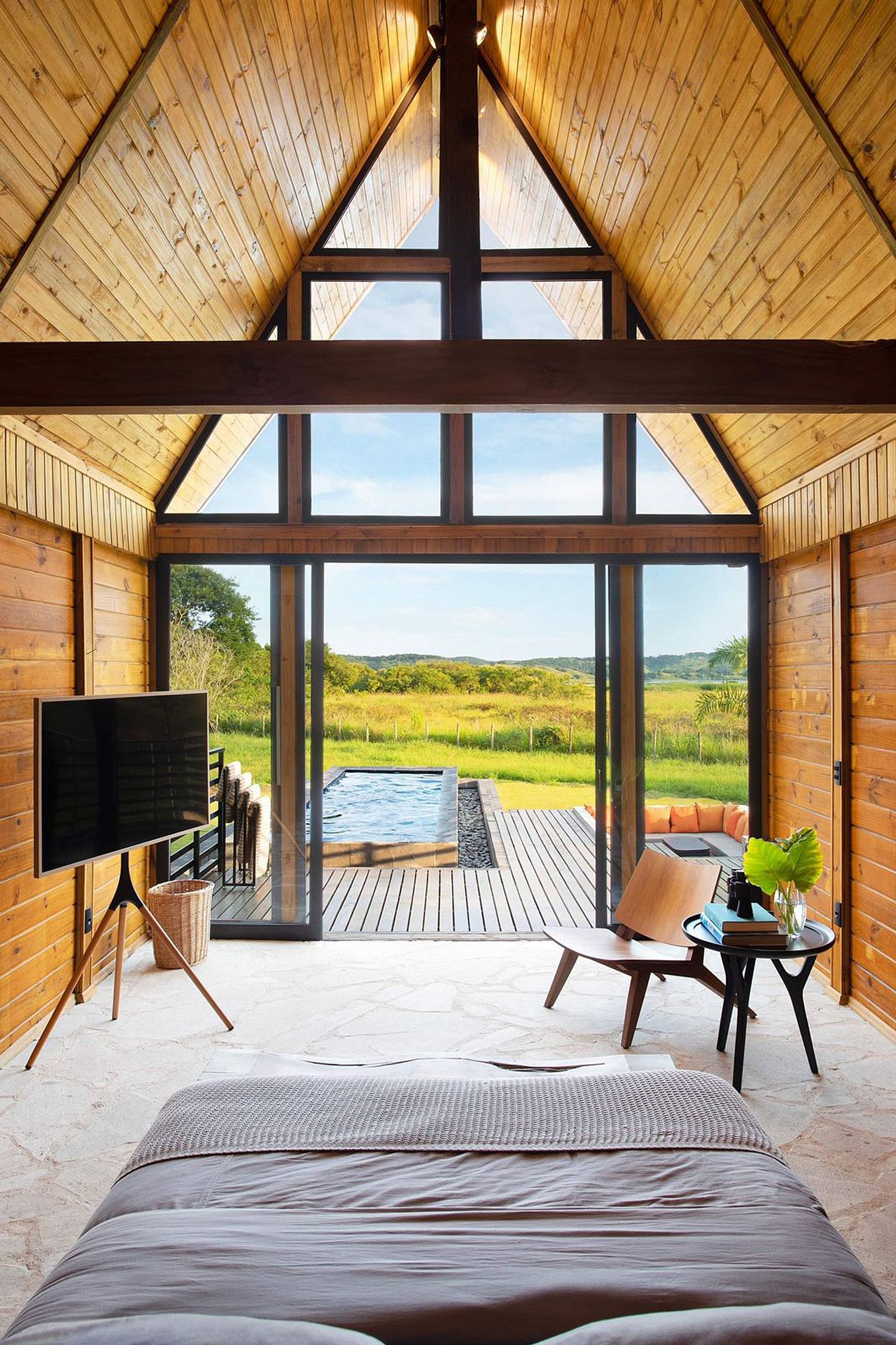 En el exterior, los huéspedes son recibidos por una espaciosa y acogedora terraza de madera, que ofrece una vista impresionante del campo, el bosque y las majestuosas montañas al fondo. La cubierta es perfecta para disfrutar de puestas de sol o disfrutar de una cena al aire libre.