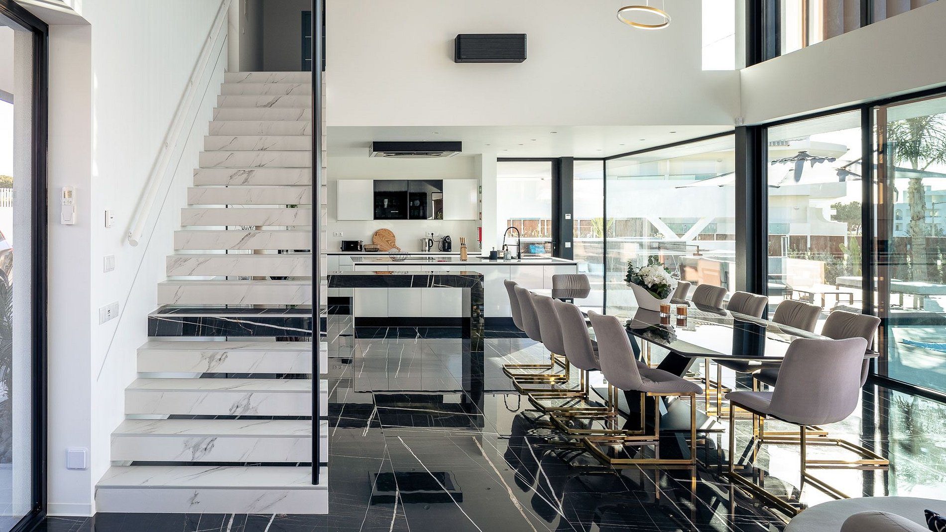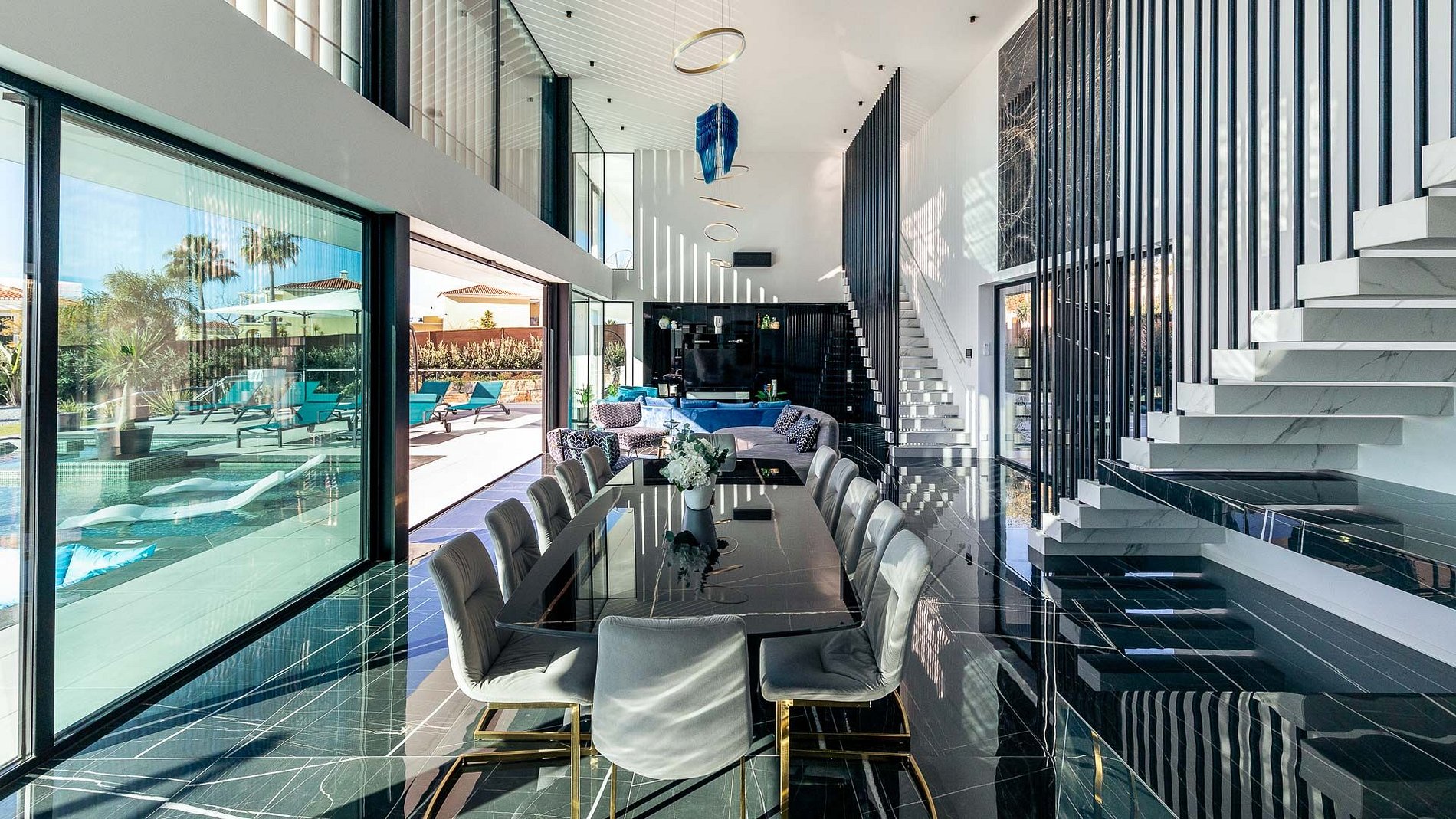 En el interior, el diseño de interiores contemporáneo y la iluminación moderna crean un ambiente cómodo para relajarse o disfrutar de comidas en compañía. Esta moderna villa con vistas al mar en el Algarve es una elección ideal para familias y grupos que buscan comodidad contemporánea cerca de las playas.