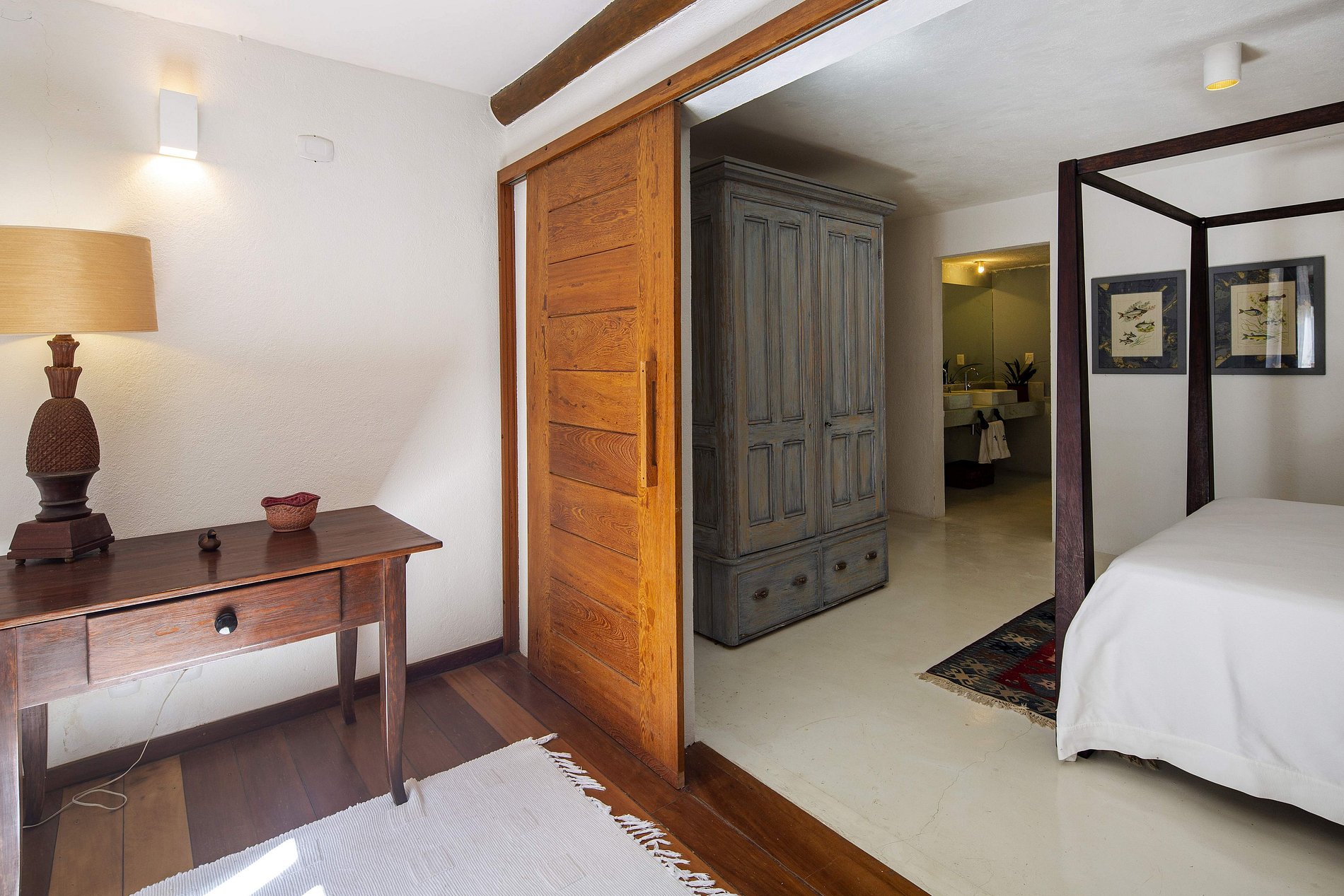 Suite 4: cama queen, aire acondicionado, doble lavabo, balcón con vista al jardín.