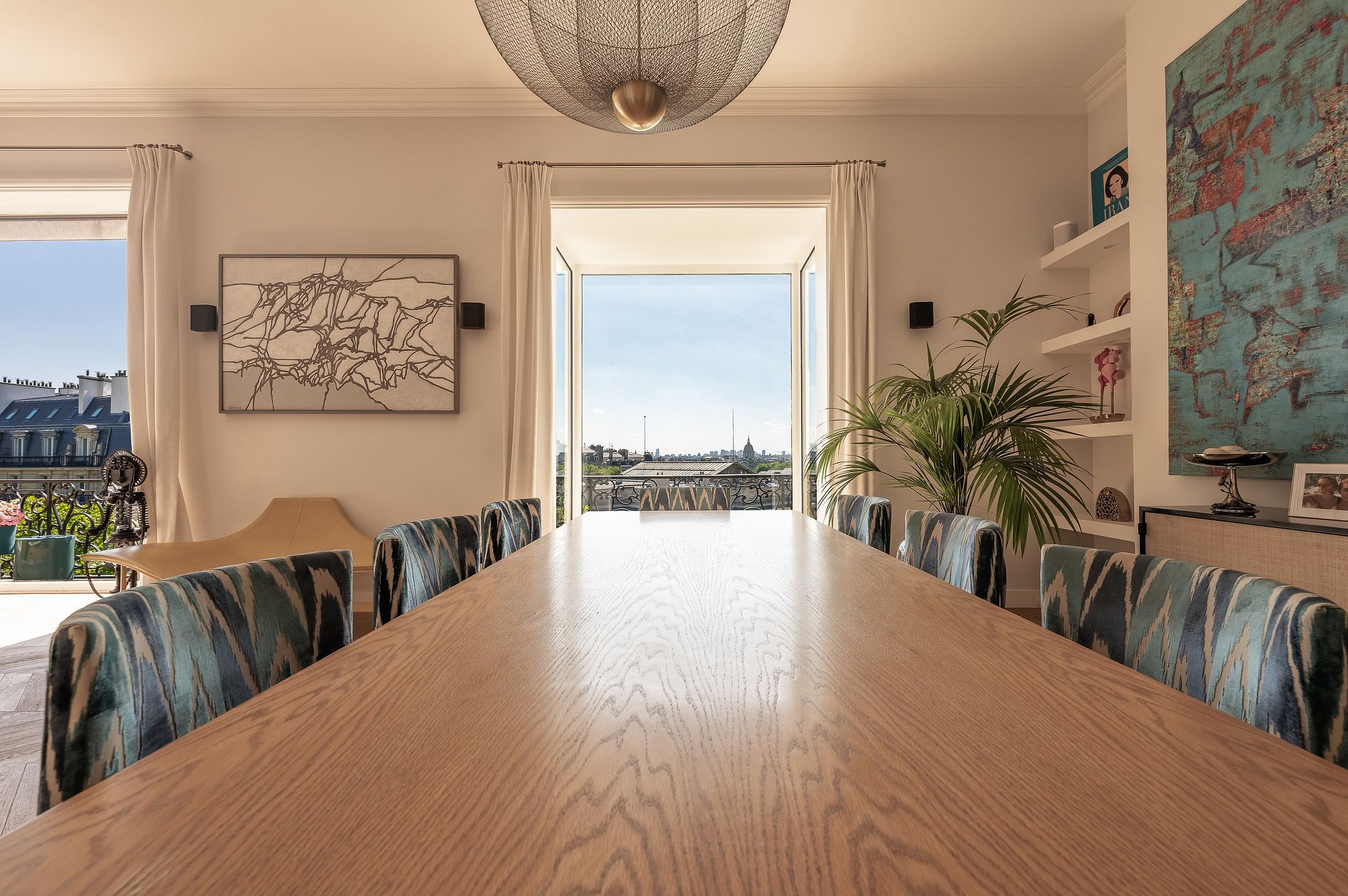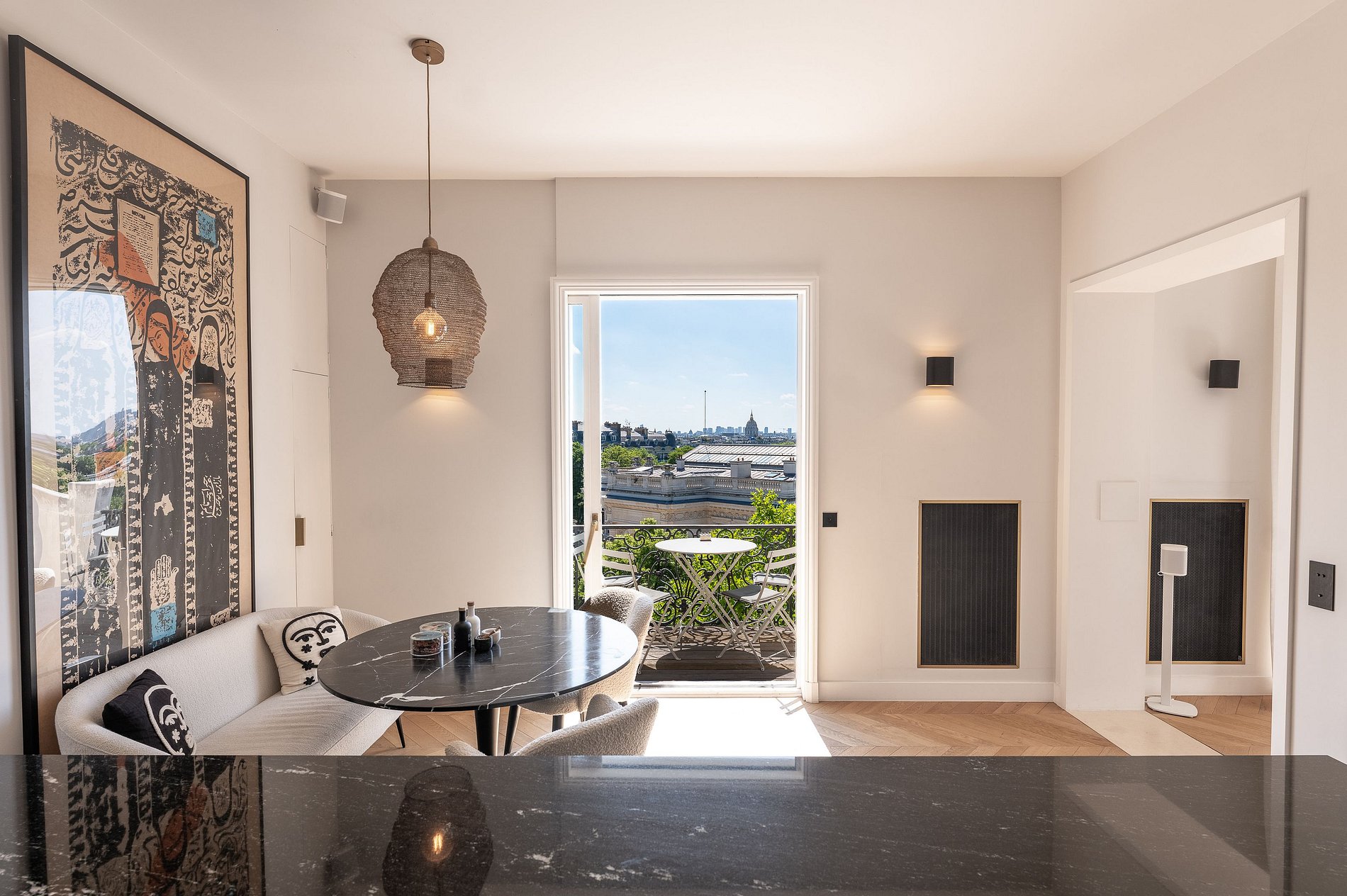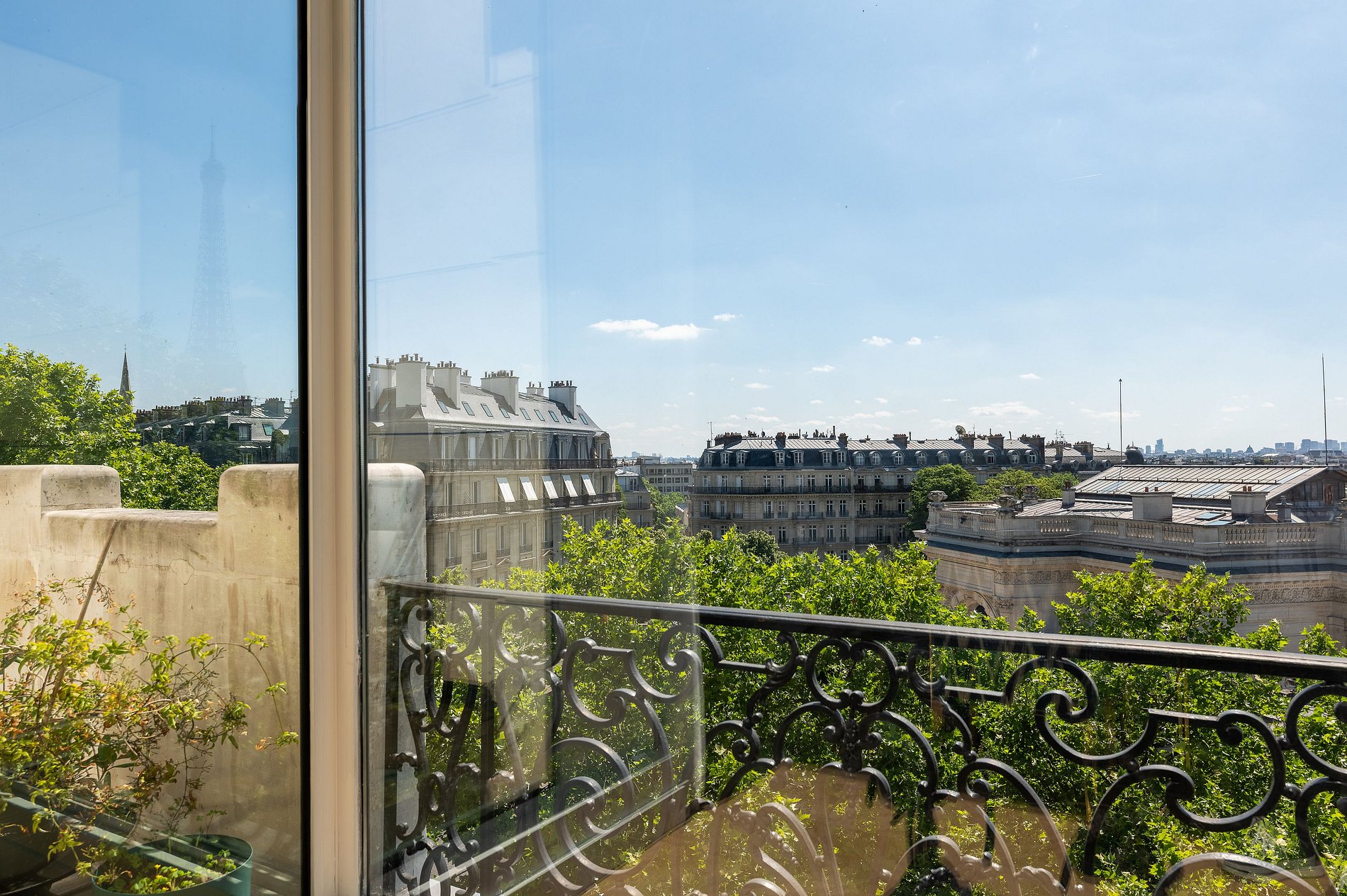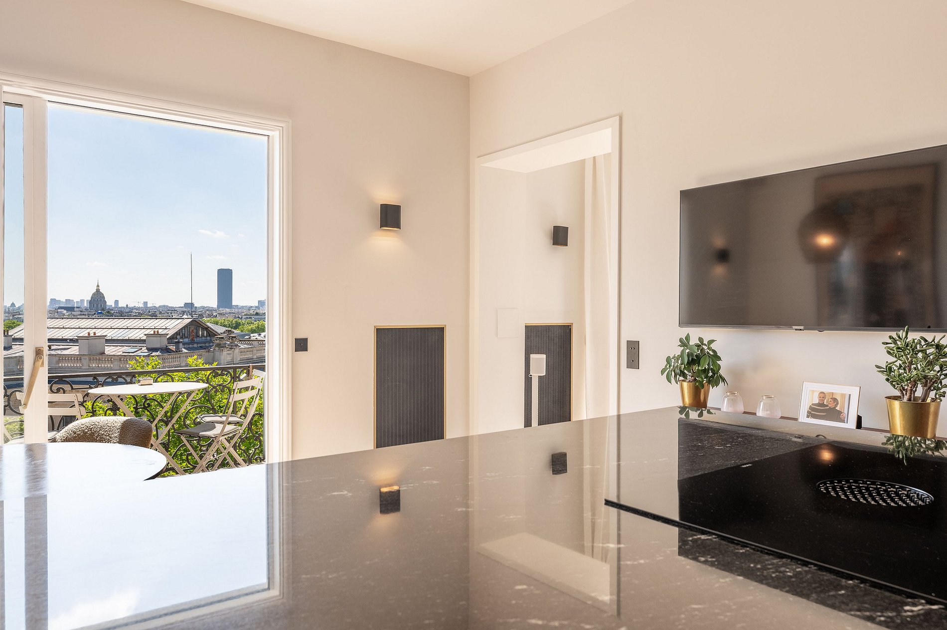 La sala de estar, el comedor y la cocina totalmente equipada se abren directamente a un amplio balcón que recorre toda la fachada. Lo suficientemente espacioso como para desayunar o tomar un aperitivo al atardecer, este balcón ofrece una vista panorámica de ensueño: la Torre Eiffel, Los Inválidos, el Panteón, el Palais de Tokyo, y justo enfrente, el majestuoso Palais Galliera.