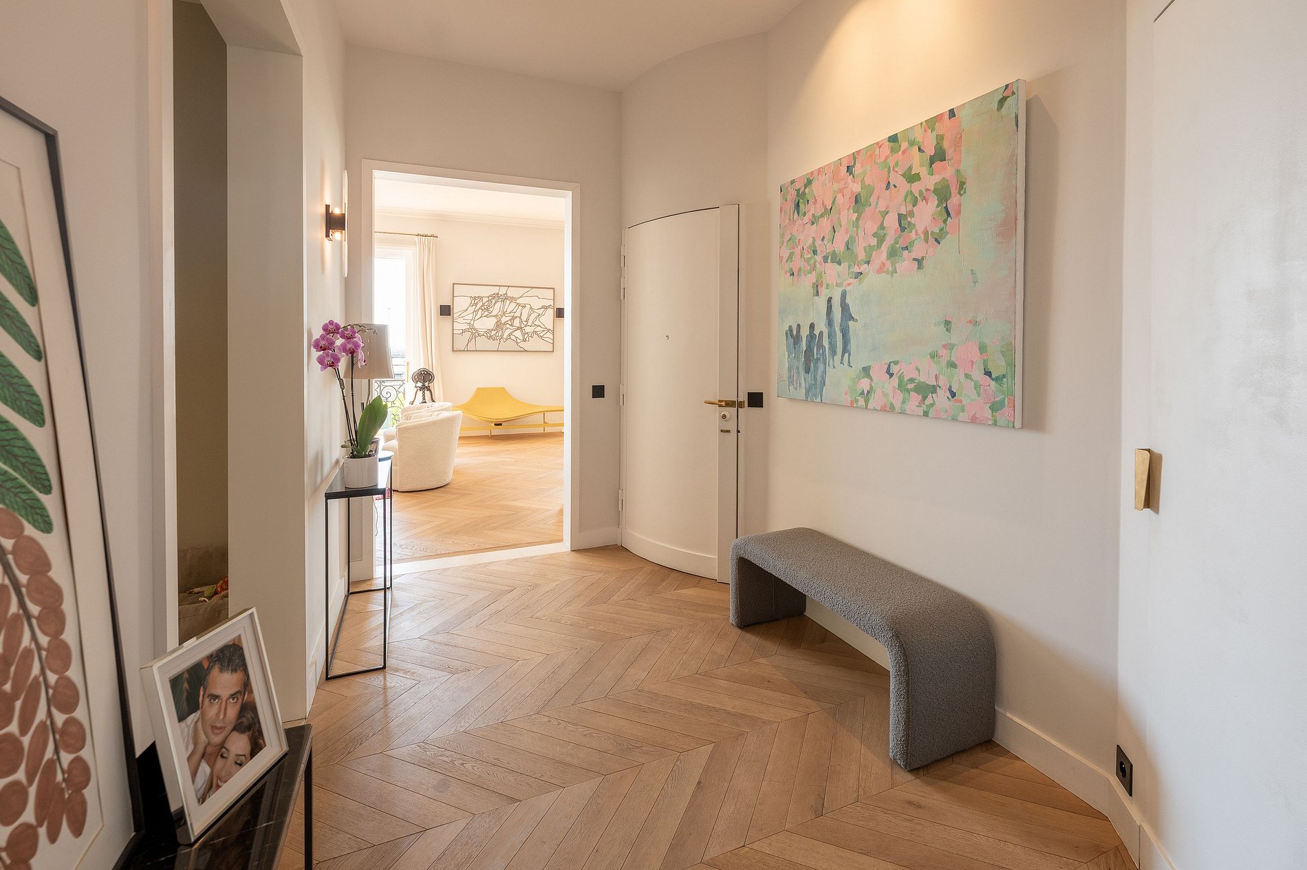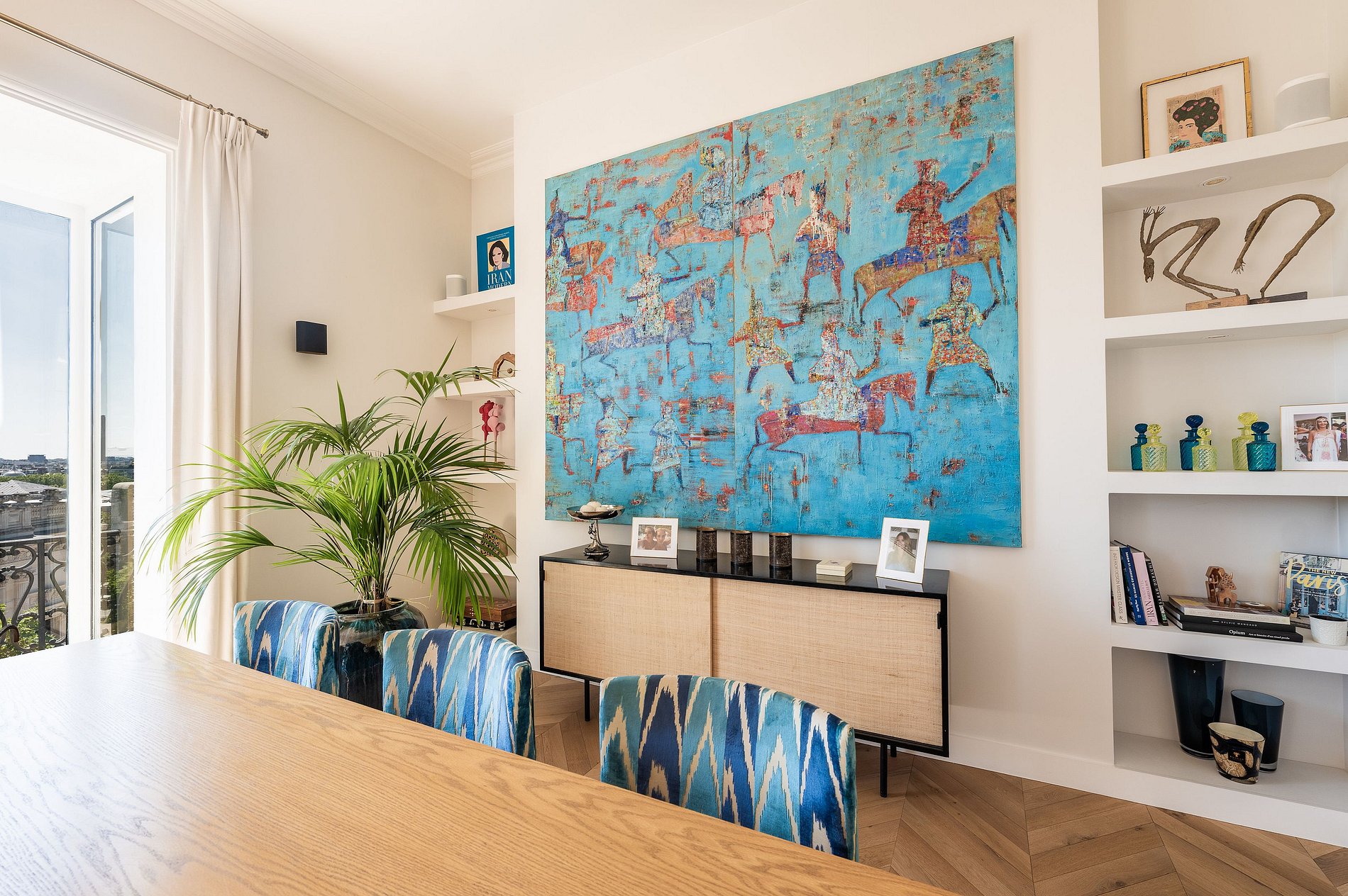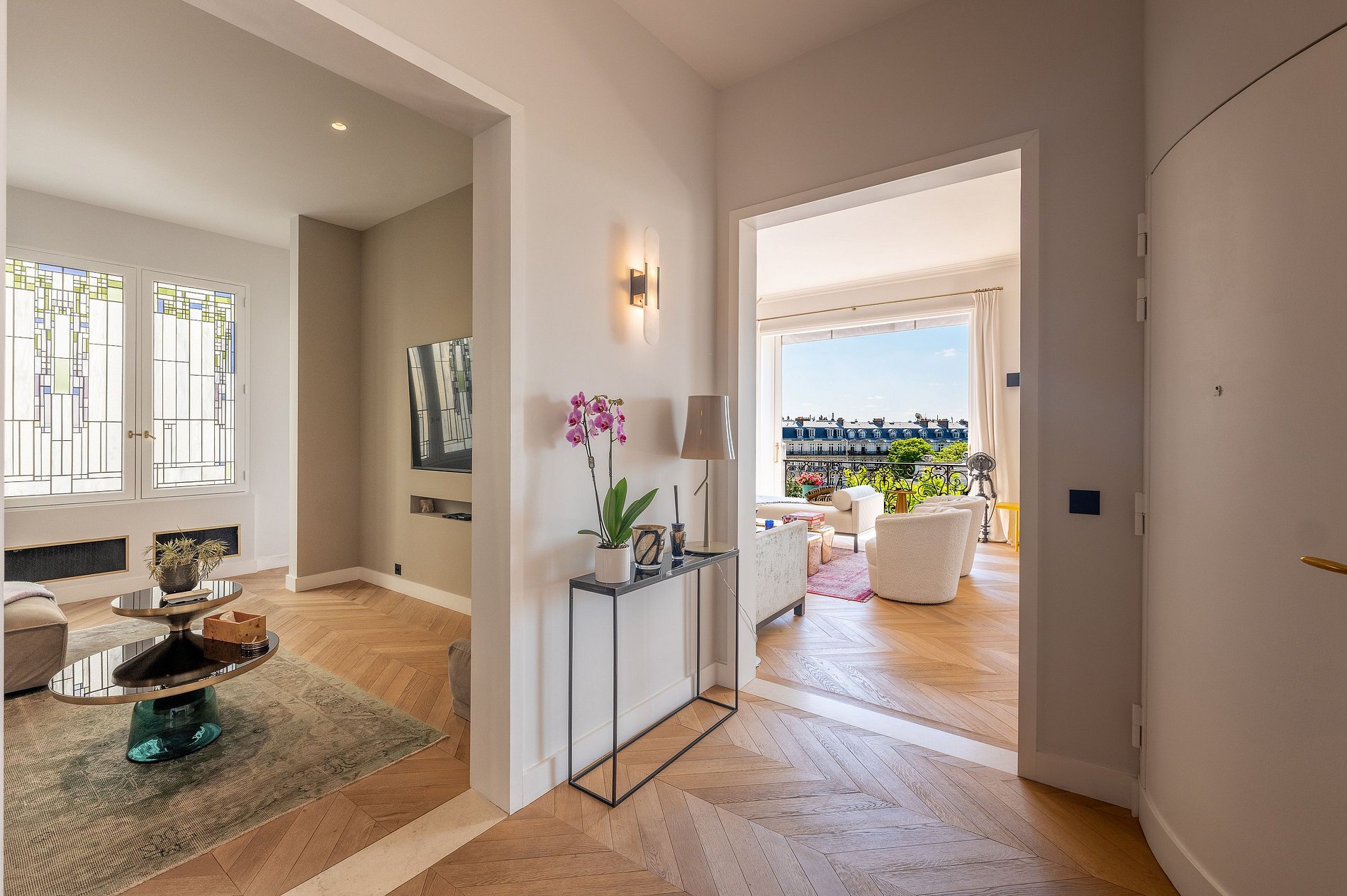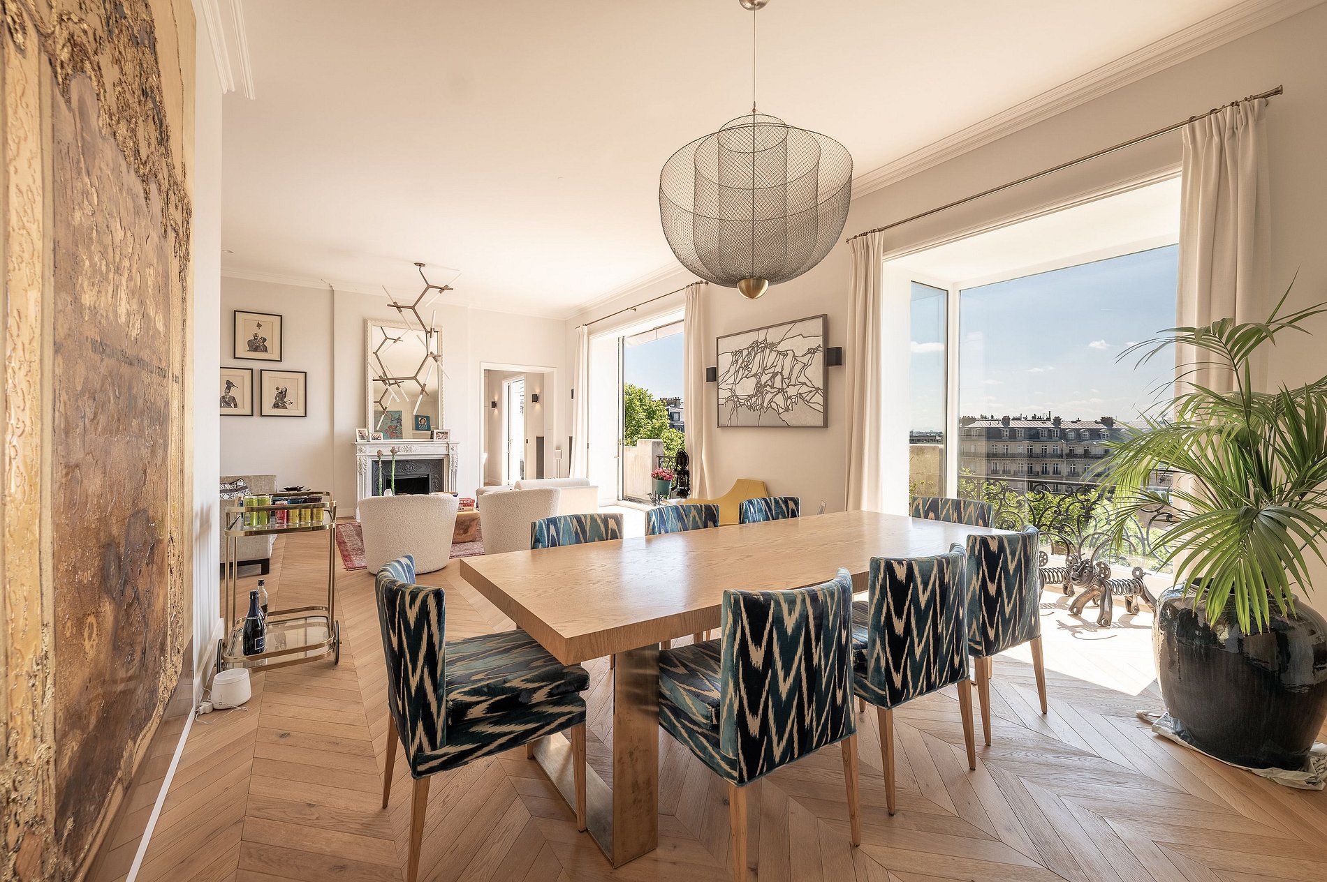 La sala de estar, el comedor y la cocina totalmente equipada se abren directamente a un amplio balcón que recorre toda la fachada. Lo suficientemente espacioso como para desayunar o tomar un aperitivo al atardecer, este balcón ofrece una vista panorámica de ensueño: la Torre Eiffel, Los Inválidos, el Panteón, el Palais de Tokyo, y justo enfrente, el majestuoso Palais Galliera.