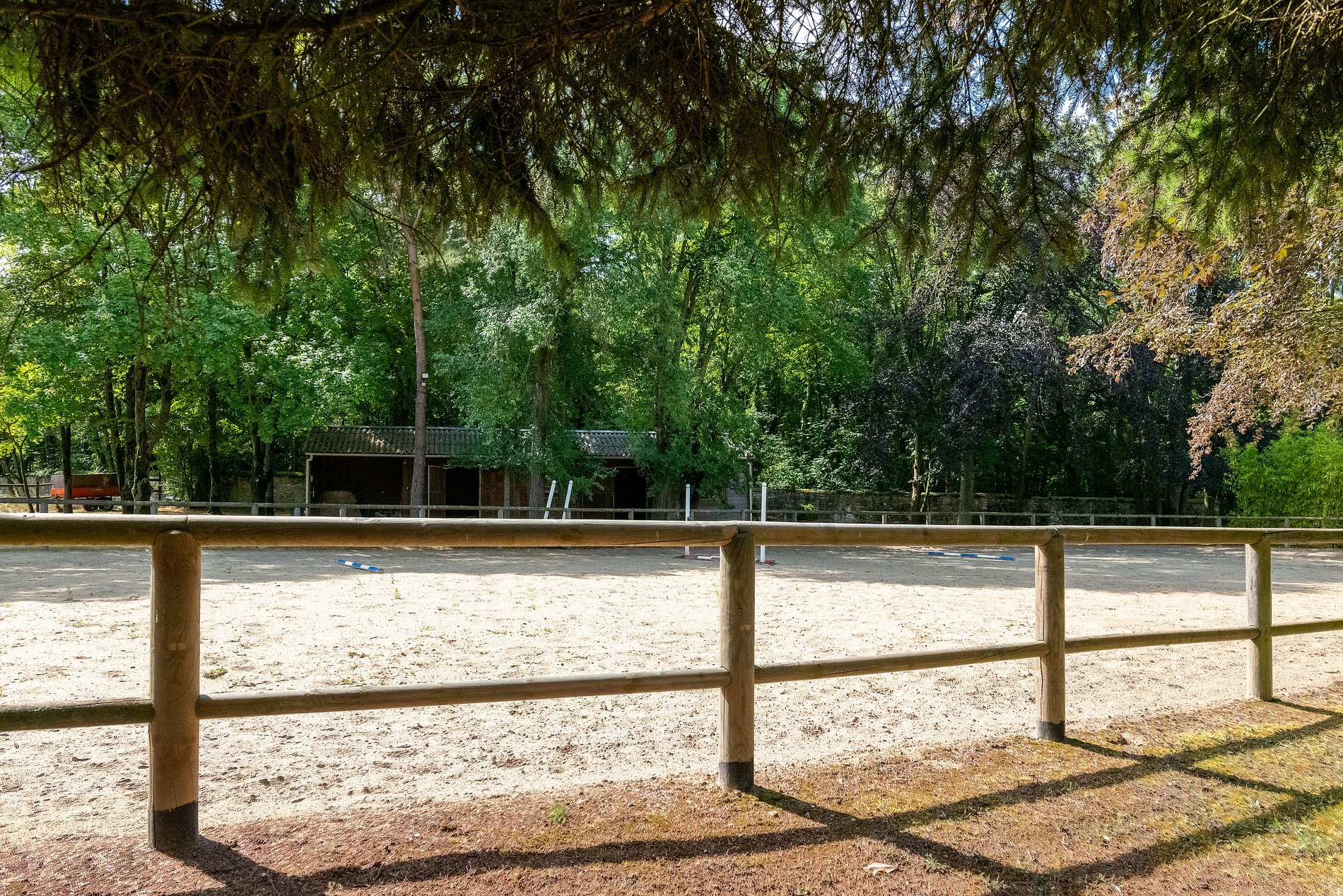Contando con un vasto parque ajardinado, esta finca única está equipada con una elegante piscina al aire libre, tres establos modernos para alojamiento de caballos, un parque paisajístico meticulosamente mantenido que exuda tranquilidad, y una pista de tenis privada para el deleite de los amantes del deporte.