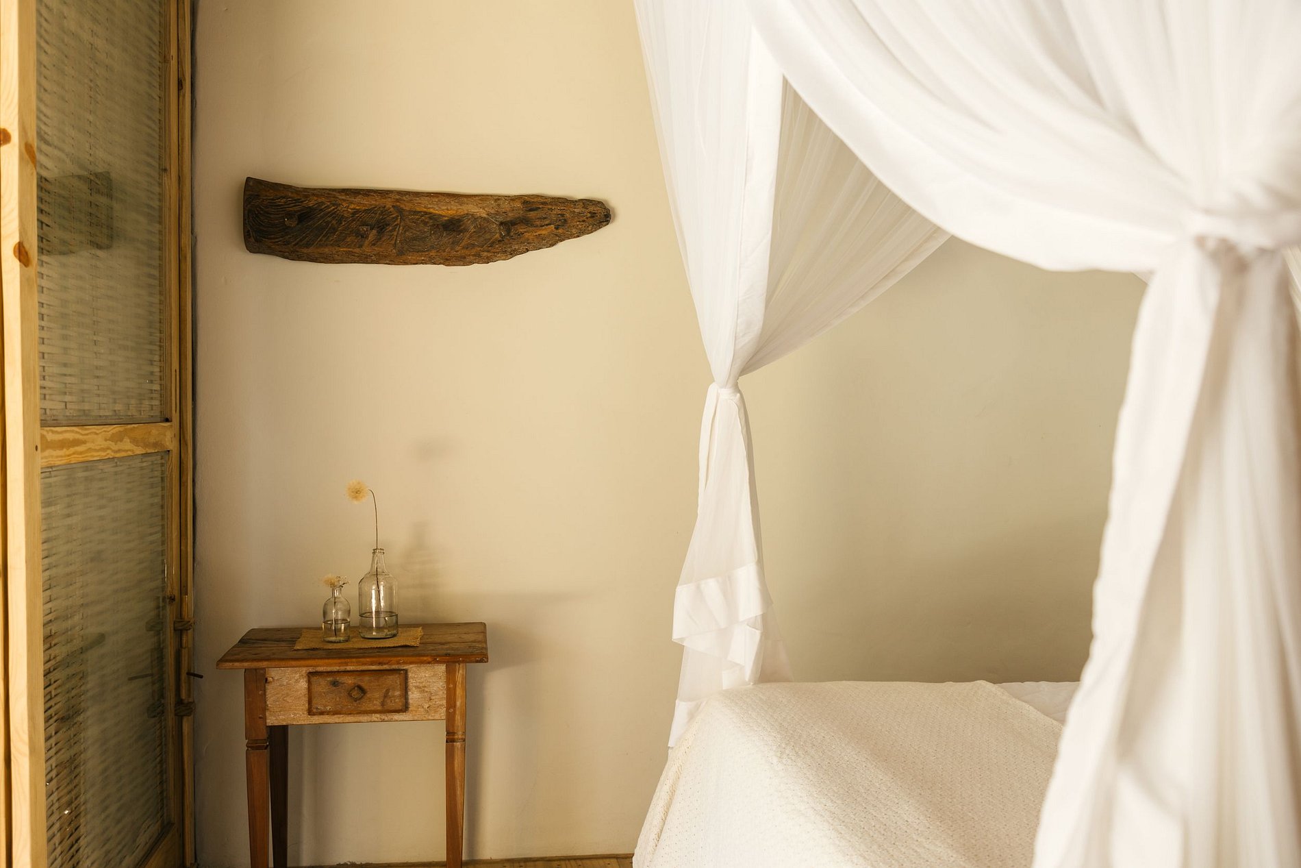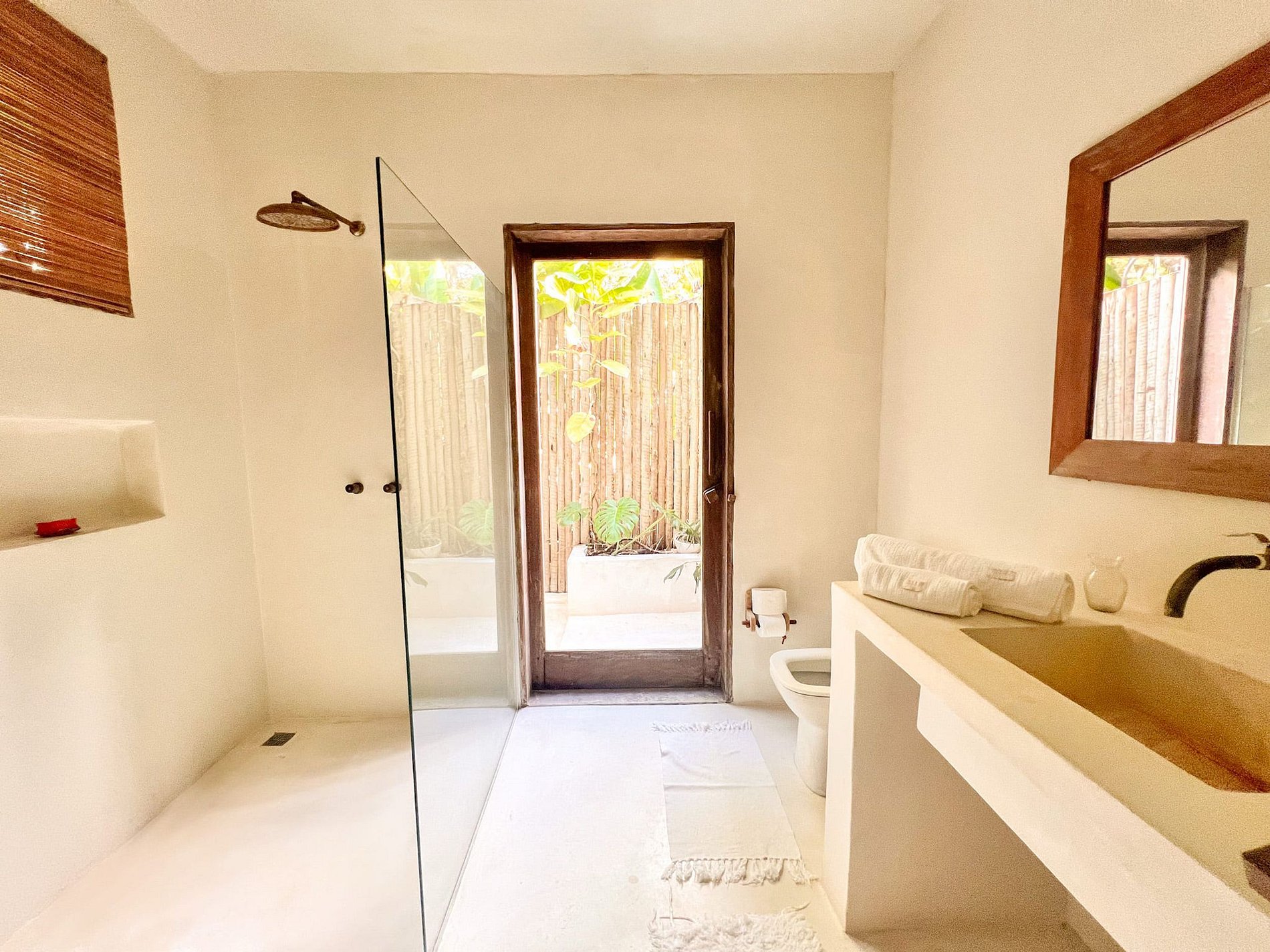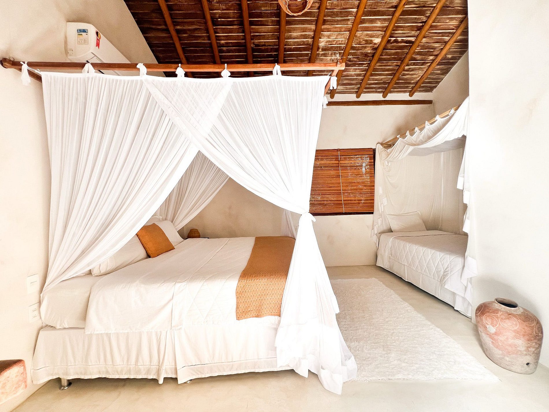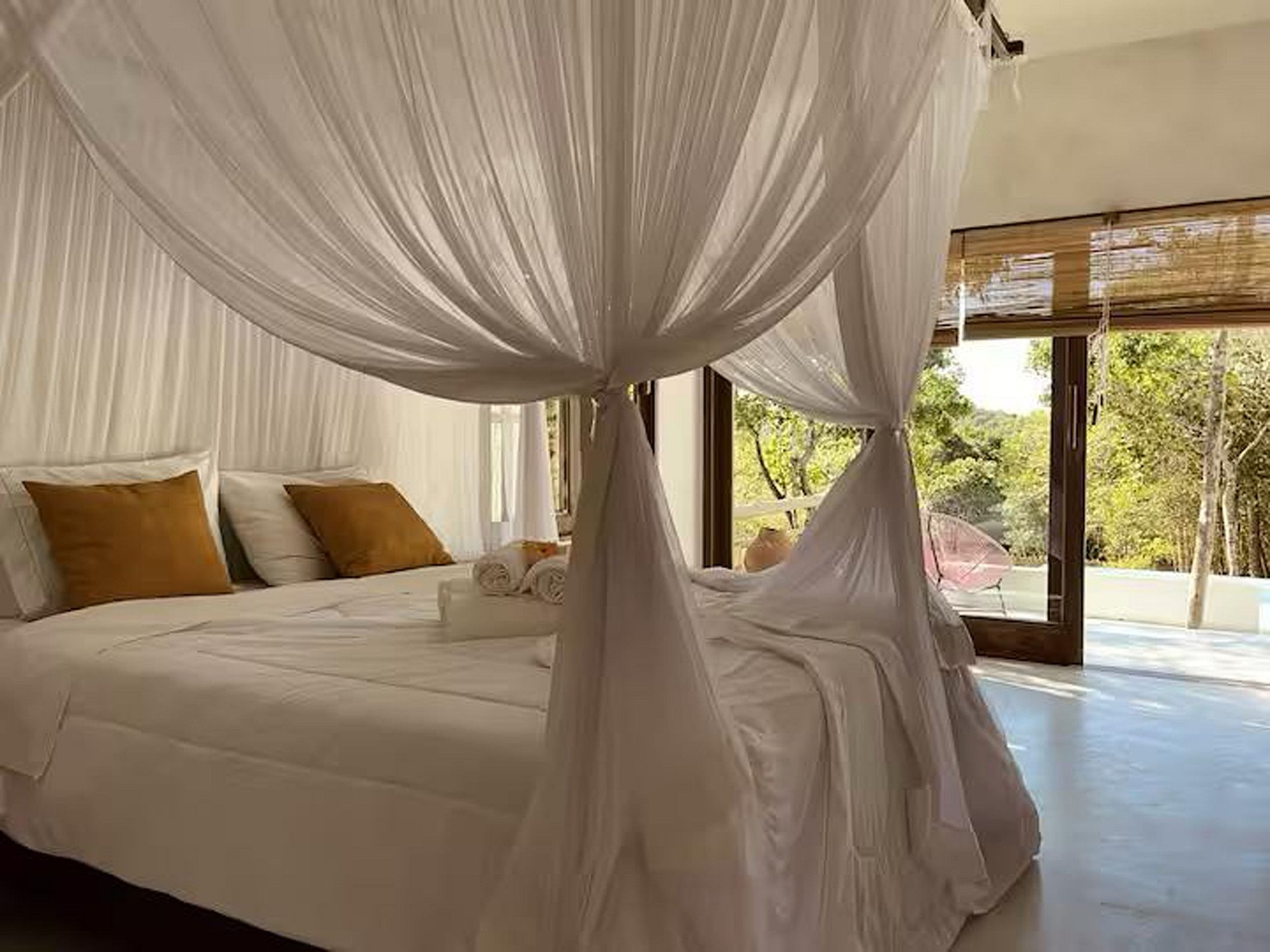 La casa principal cuenta con tres suites con hermosos baños, todos equipados y completos. Junto a la piscina, la casa cuenta con dos bungalows con mucho encanto. Todas las habitaciones tienen mosquiteras.