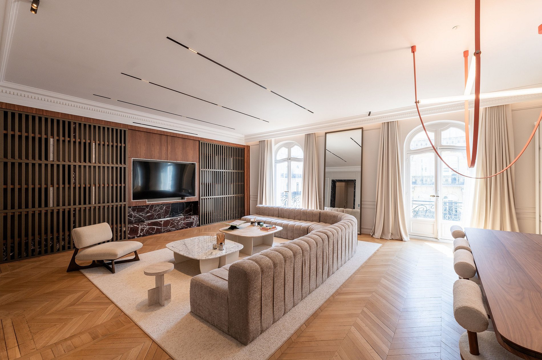 Situado en un edificio Haussmanniano de alto nivel con refinadas prestaciones, este apartamento destaca por su notable diseño arquitectónico, especialmente por su espectacular pasillo con un techo único en forma de ola espejada, una verdadera maravilla estética.