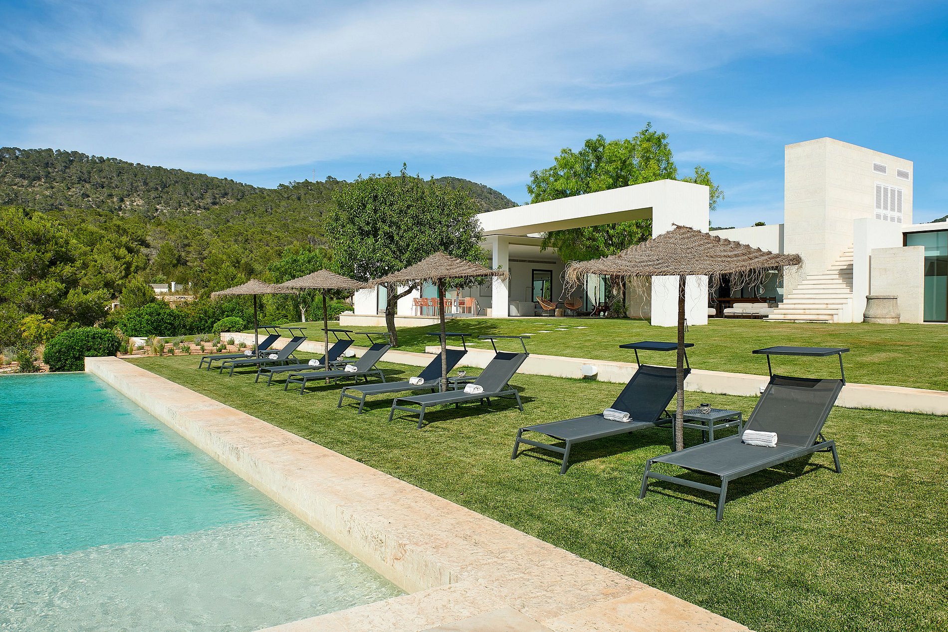La villa cuenta con seis dormitorios con baño privado, incluyendo una majestuosa Suite Principal con una zona de estar privada y dos vestidores. Cada dormitorio dispone de duchas exteriores y acceso directo al jardín, fusionando comodidad y naturaleza. Una espectacular terraza en la azotea de 150 m² y una piscina de 18 metros ofrecen los espacios perfectos para la relajación y para disfrutar del ambiente mediterráneo.