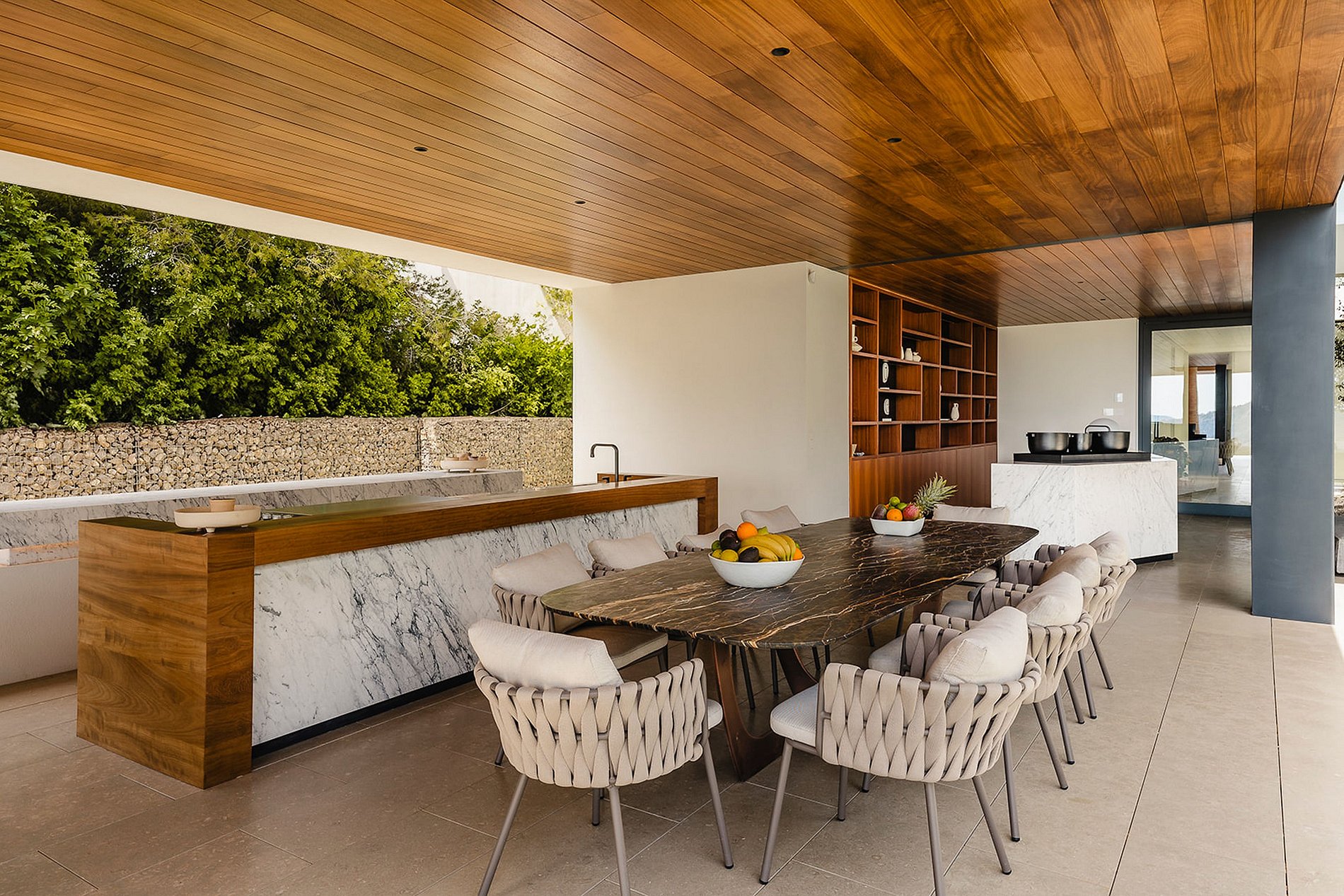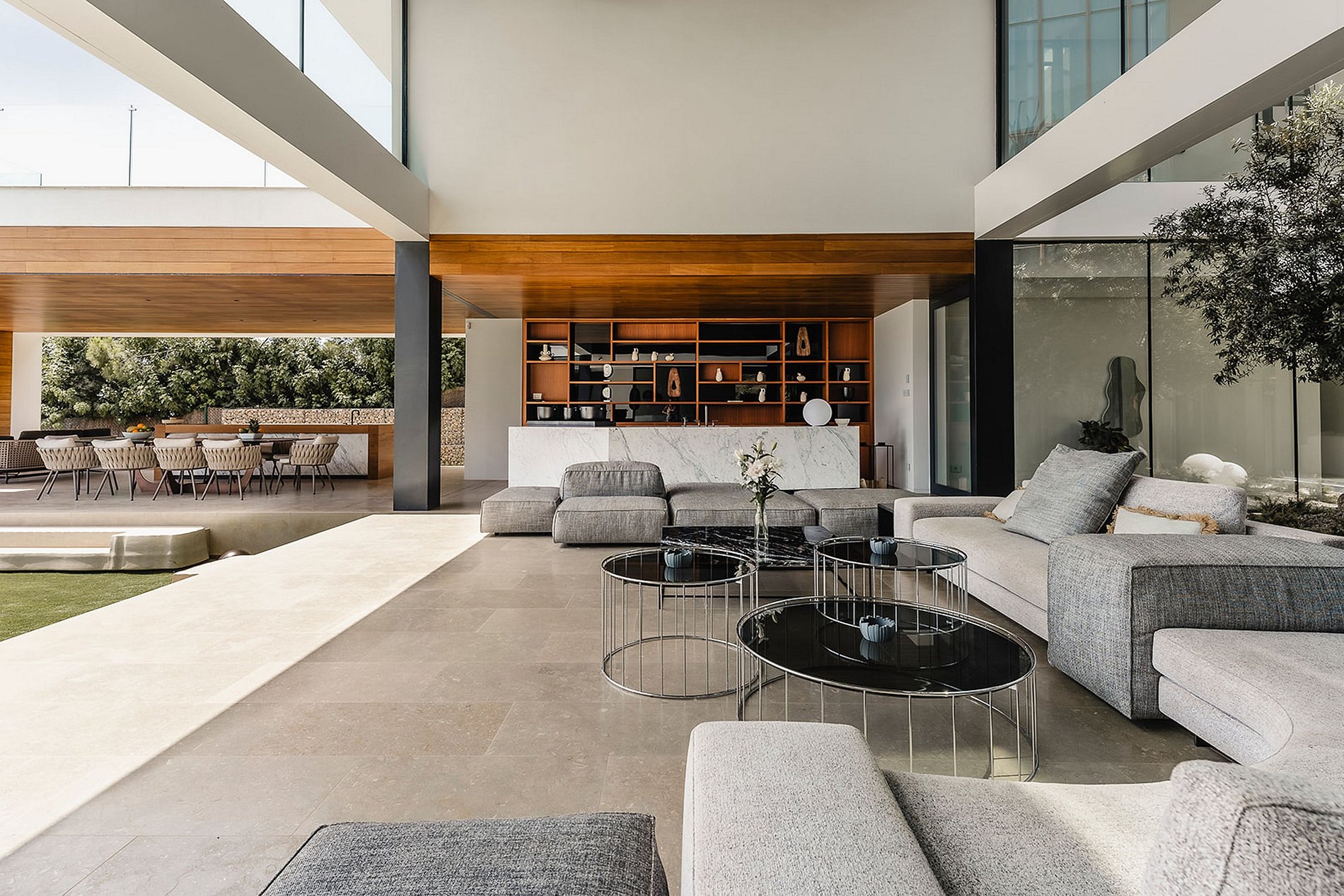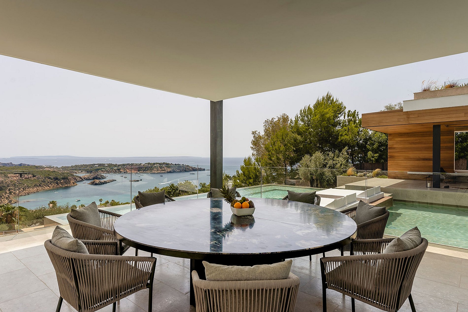 Los espacios comunes están diseñados tanto para entretener como para relajarse. El salón principal, elegante y luminoso, se conecta sin esfuerzo con la terraza exterior con comedor al aire libre, ideal para almuerzos frente al mar o cócteles al atardecer.