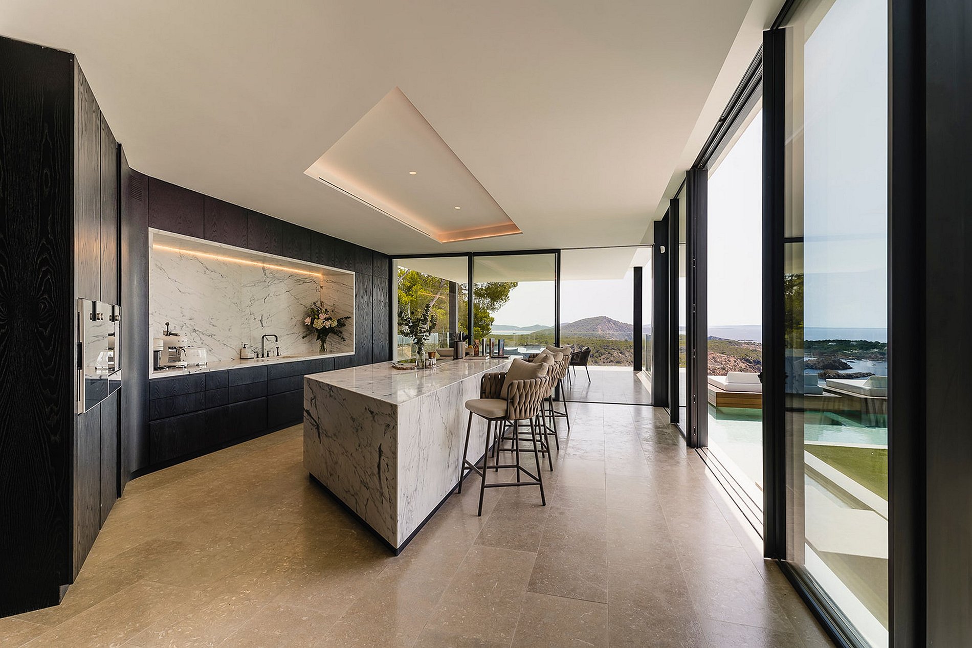 En el exterior, la piscina infinita parece fundirse con el mar, rodeada por una elegante zona de solárium y jardines mediterráneos perfectamente cuidados. Todo invita a la desconexión, la contemplación y el placer.
