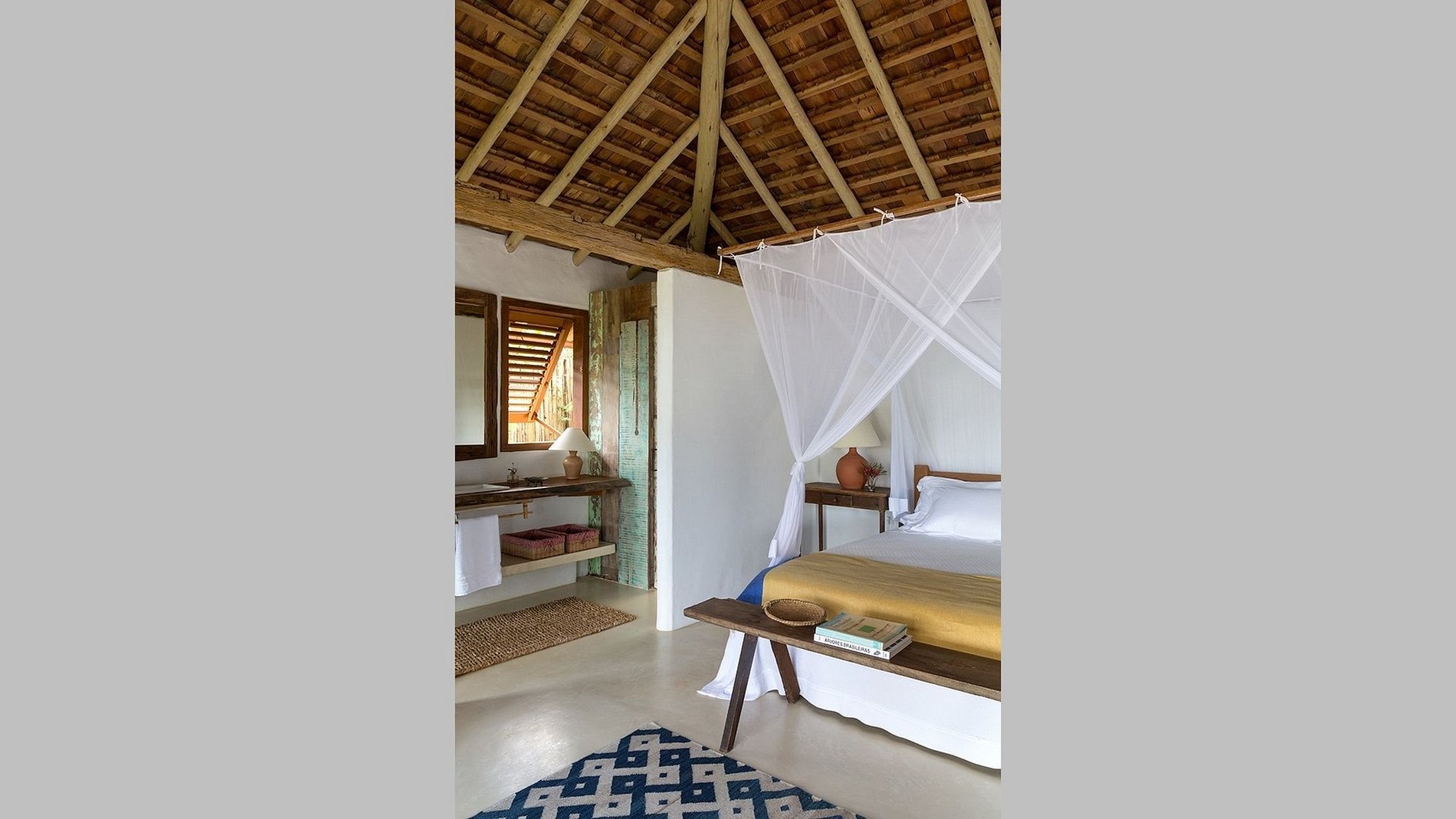 Buena parte de la madera de ley usada en la obra vino del reaprovechamiento de una antigua caja de agua de la hacienda de la familia de los propietarios. Puertas y ventanas, provenientes de demolición, fueron elegidas en el interior de Bahía. Elementos locales están presentes en las alfombras de fibras naturales, las cestas y muebles de carpintería de Randolph, Dati y Ricardo Salem, y hacen contraste con la plata del siglo 19 heredó la familia portuguesa.
