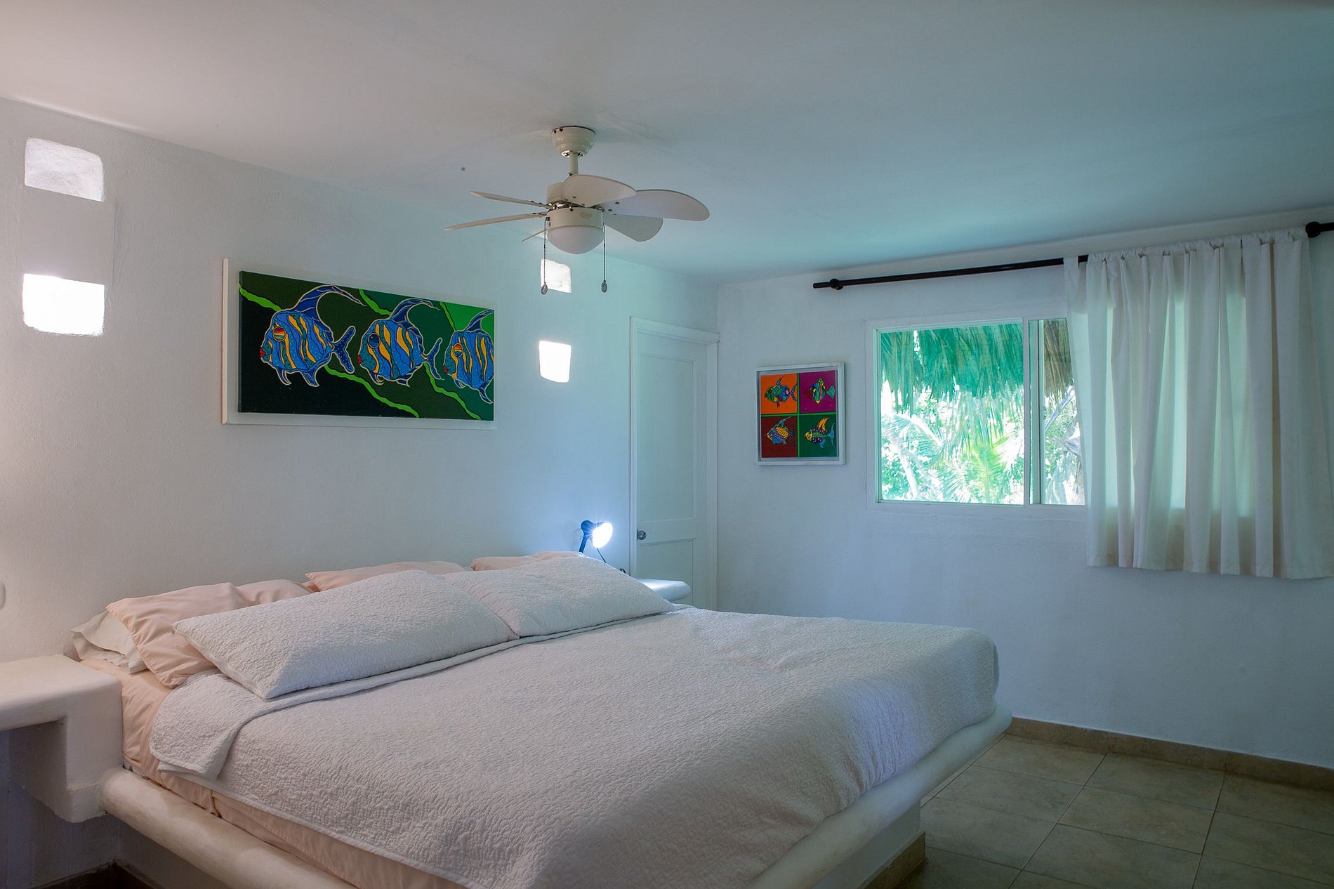 El área de los cuartos se distribuye a lo largo del pasillo; en total hay 4 habitaciones, dos con camas king size y baño privado y 2 habitaciones con 3 camas individuales. Todos los dormitorios tienen aire acondicionado.
