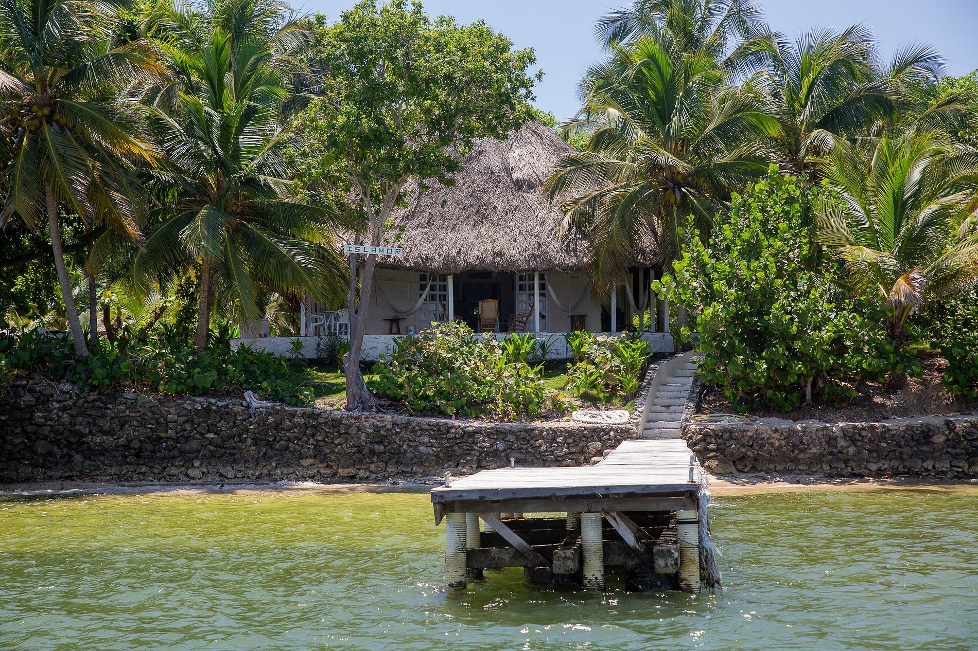 La casa tiene un muelle para amarrar barcos y una hermosa escalera hasta la casa. El balcón tiene hamacas para relajarse en un ambiente ideal, al son de la naturaleza y las olas del mar.