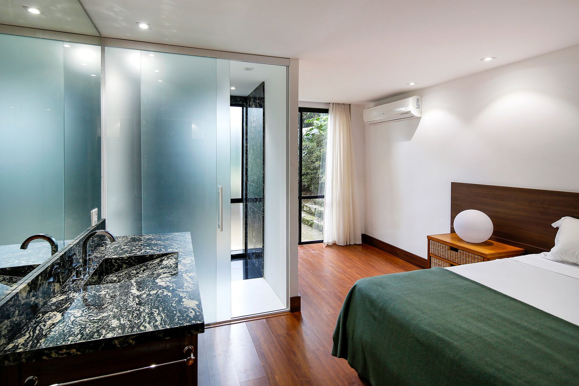 Esta hermosa Villa está situada al lado del Golf & Country Club Gavea, a la entrada del elegante barrio de Joatinga en un conjunto cerrado con seguridad las 24 horas y una grandiosa vista que da hacia las famosas playas de Pepino en San Conrado.La Villa de 900m2 está llena de luz natural, debido a que tiene paredes y techo de cristal, un diseño único e innovador que le da un gran encanto a la propiedad.