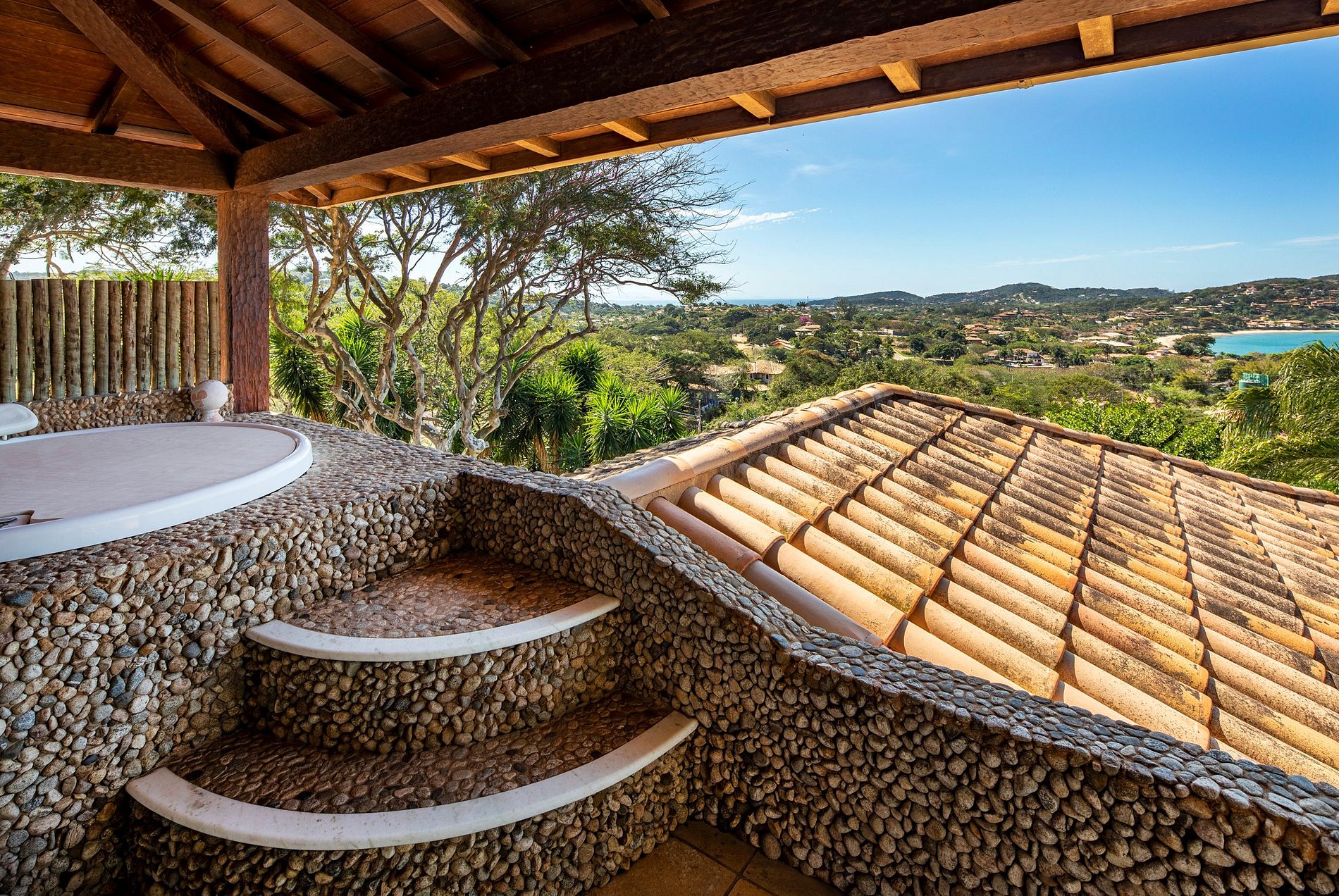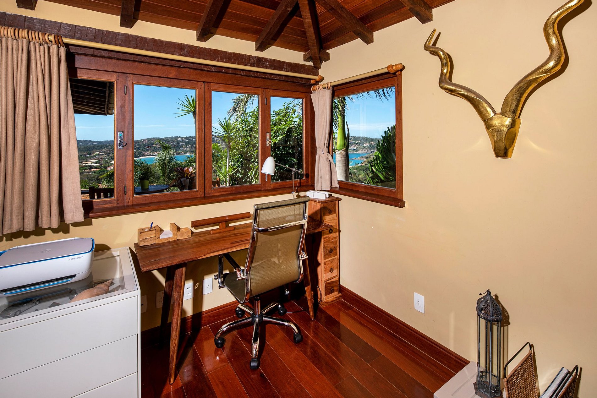 La sala de estar principal está decorado en un estilo tradicional de Búzios, con muebles de madera oscura ornamentada y suelos de baldosas. Las amplias puertas y ventanas aprovechan al máximo las espectaculares vistas que inundan el interior con luz natural. Se puede ver desde un extremo de la propiedad a través de la otra y fuera a través de la bahía.
