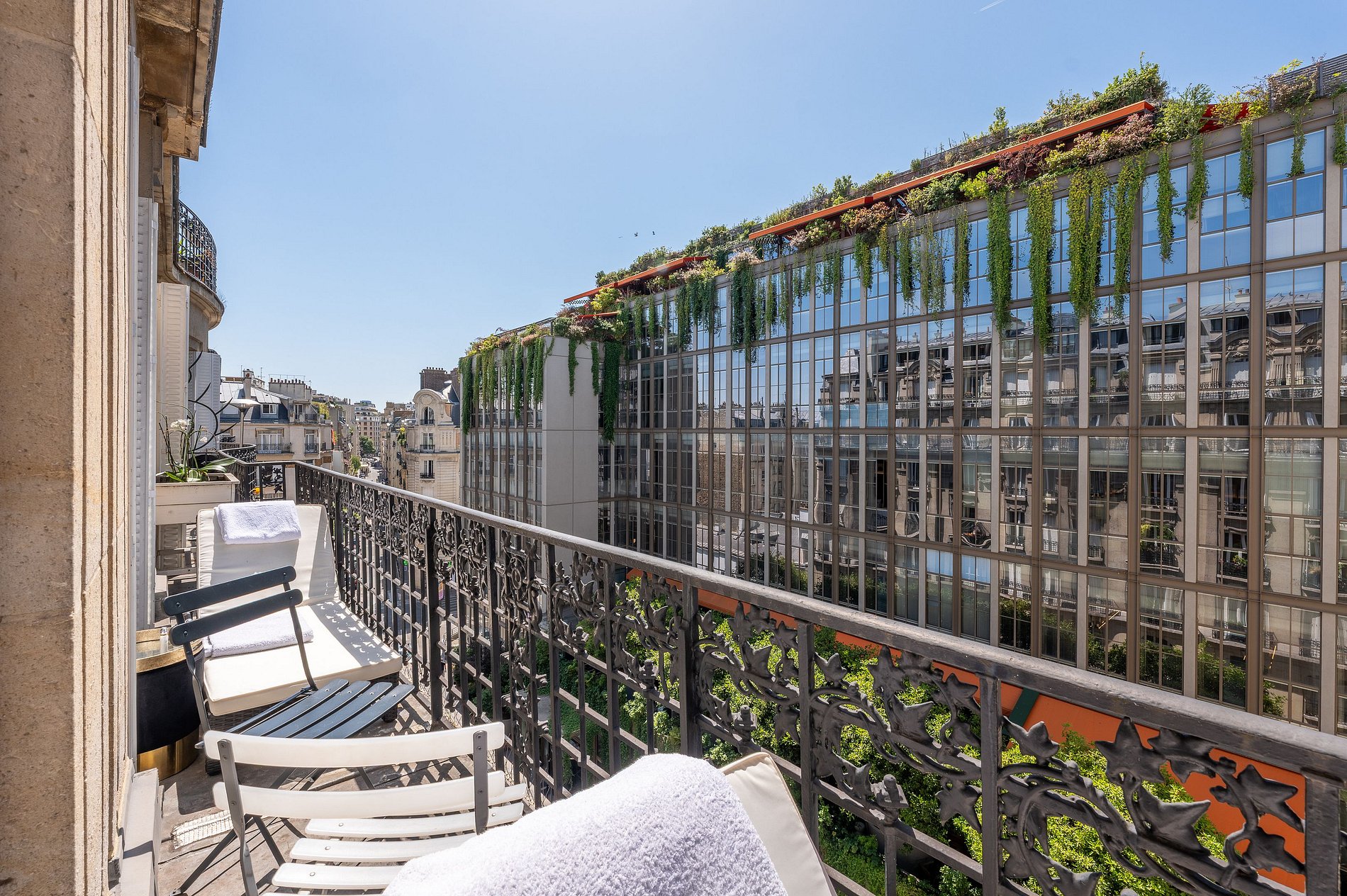Con espacios generosos y bañado por luz natural, el apartamento combina a la perfección el encanto clásico parisino con comodidad moderna. La amplia terraza, accesible desde el salón principal, está equipada con tumbonas y una mesa exterior, ideal para disfrutar de una copa mientras se contempla la arquitectura contemporánea del hotel Brach.