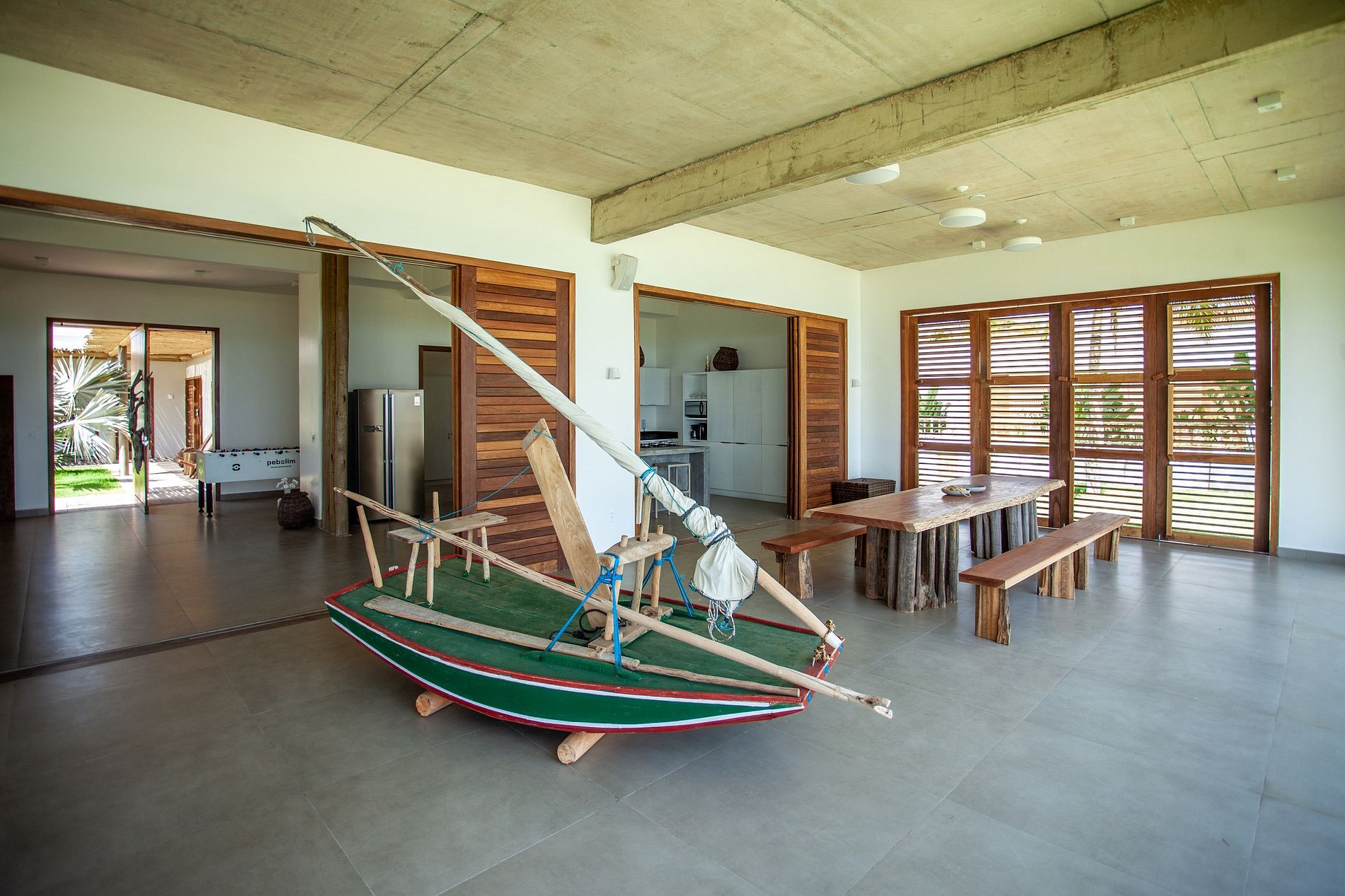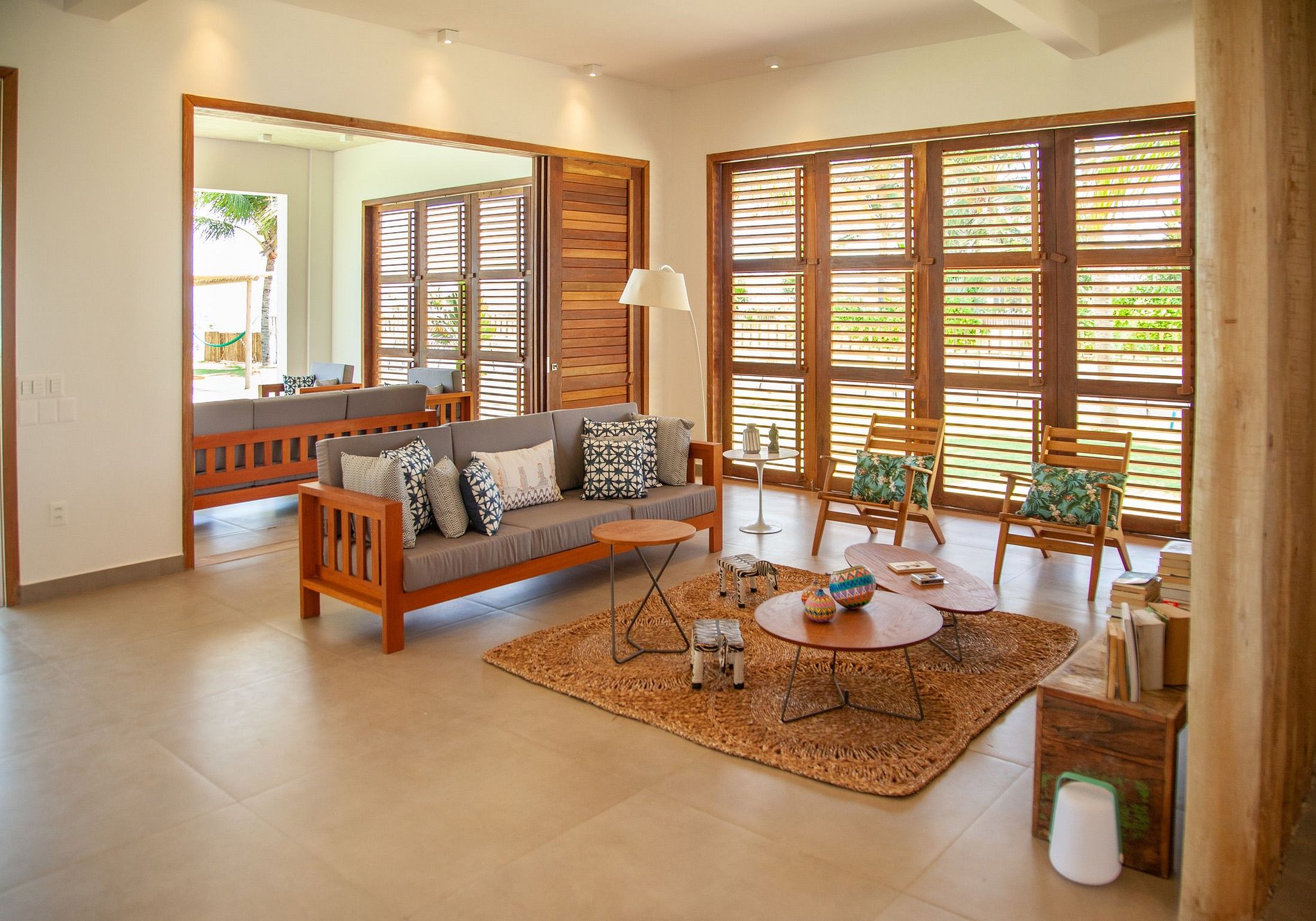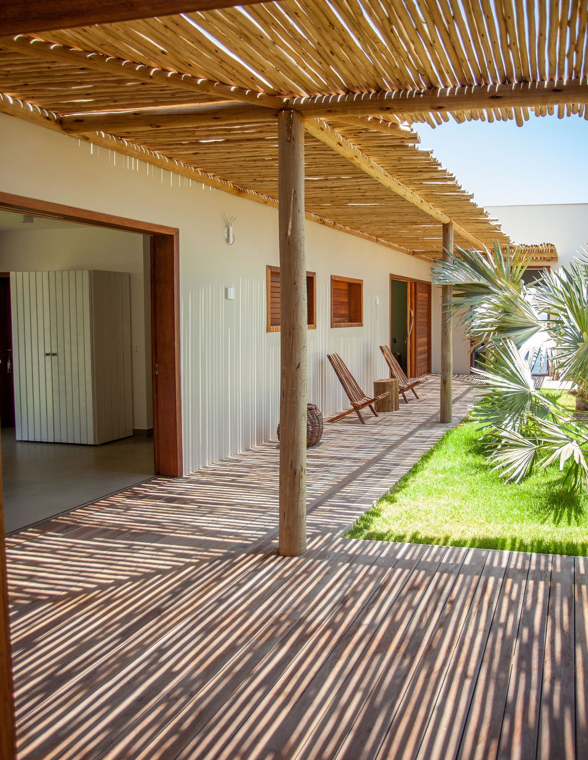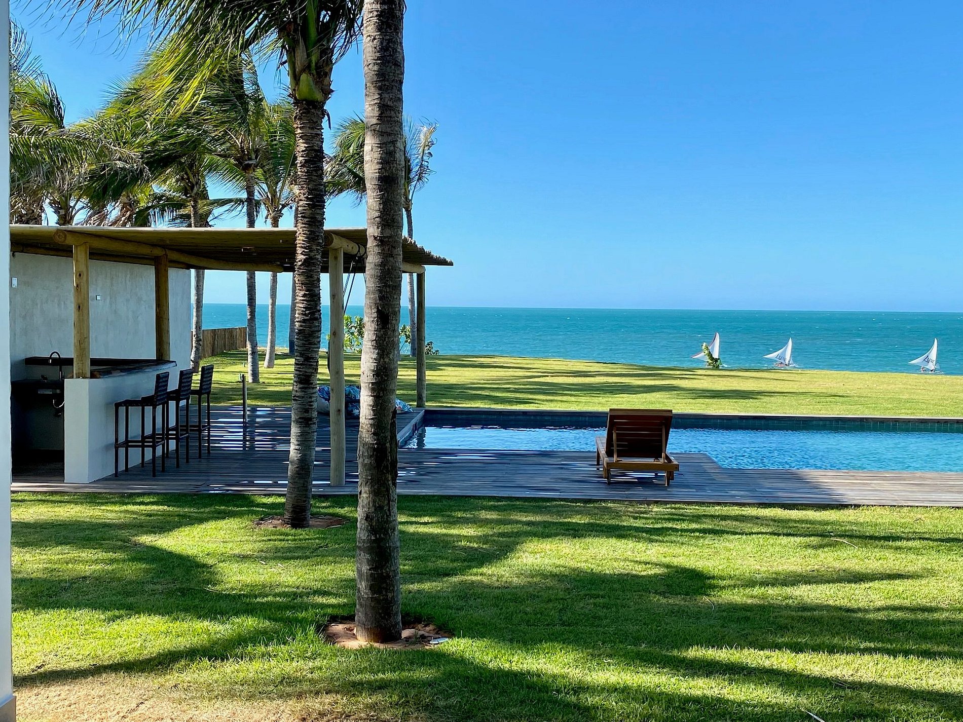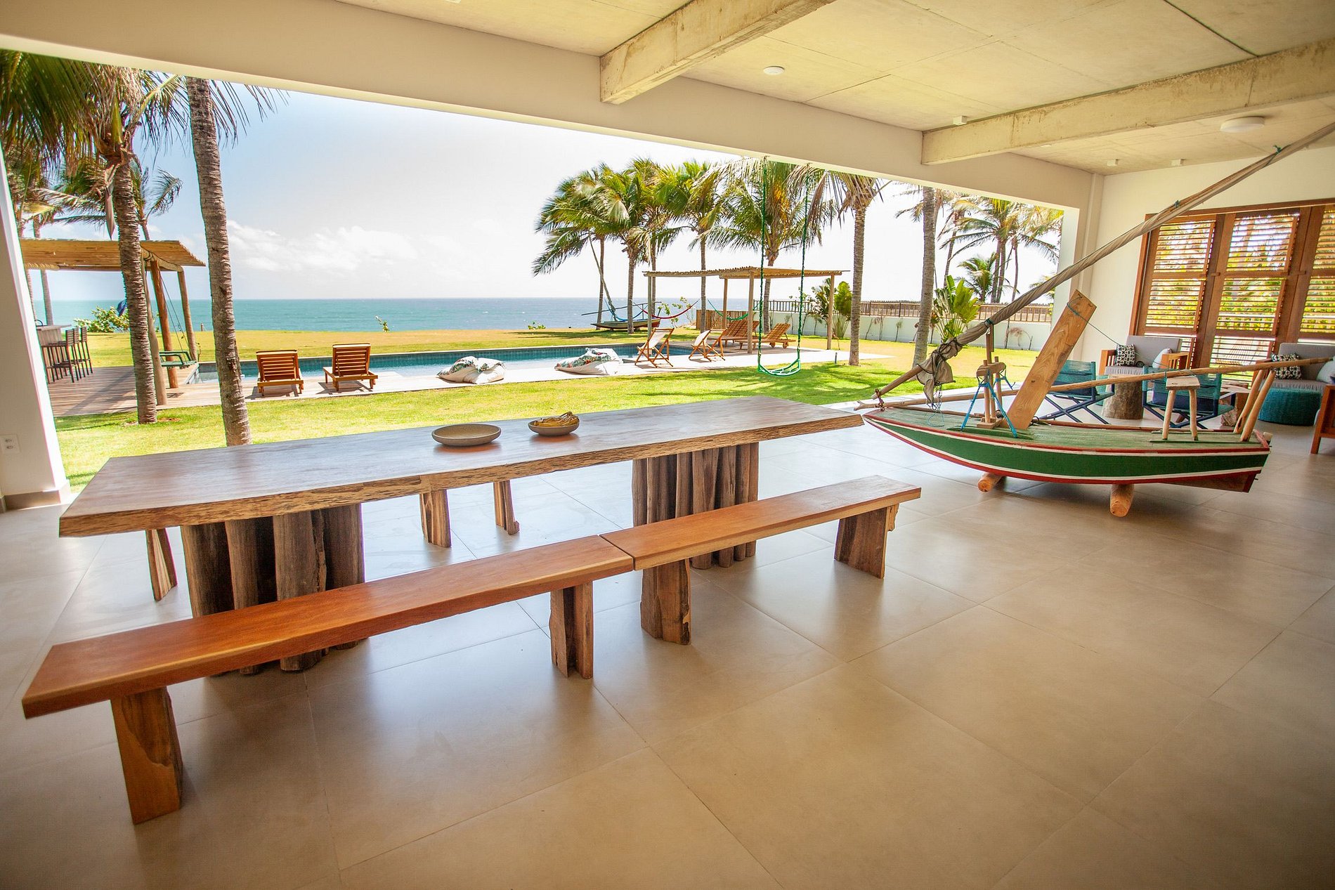 El área exterior es una invitación al dolce far niente. Un extenso césped llega hasta la arena, bordeado por cocoteros y una piscina con deck de madera, reposeras y hamacas que se mecen bajo la sombra. También hay una terraza con sillones amplios y una vista 360º hipnotizante – ideal para ver el atardecer con un trago en la mano. Para los más activos, la casa ofrece acceso directo para practicar kitesurf desde la propiedad y hasta una cancha de beach tennis. ¿Y si la idea es relajarse? Una buena opción es disfrutar un agua de coco en el jardín o leer un libro con el sonido del mar de fondo.