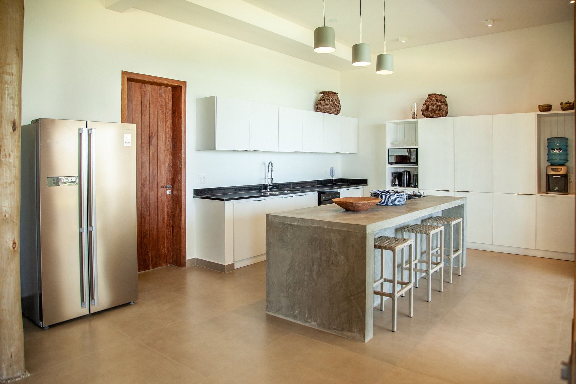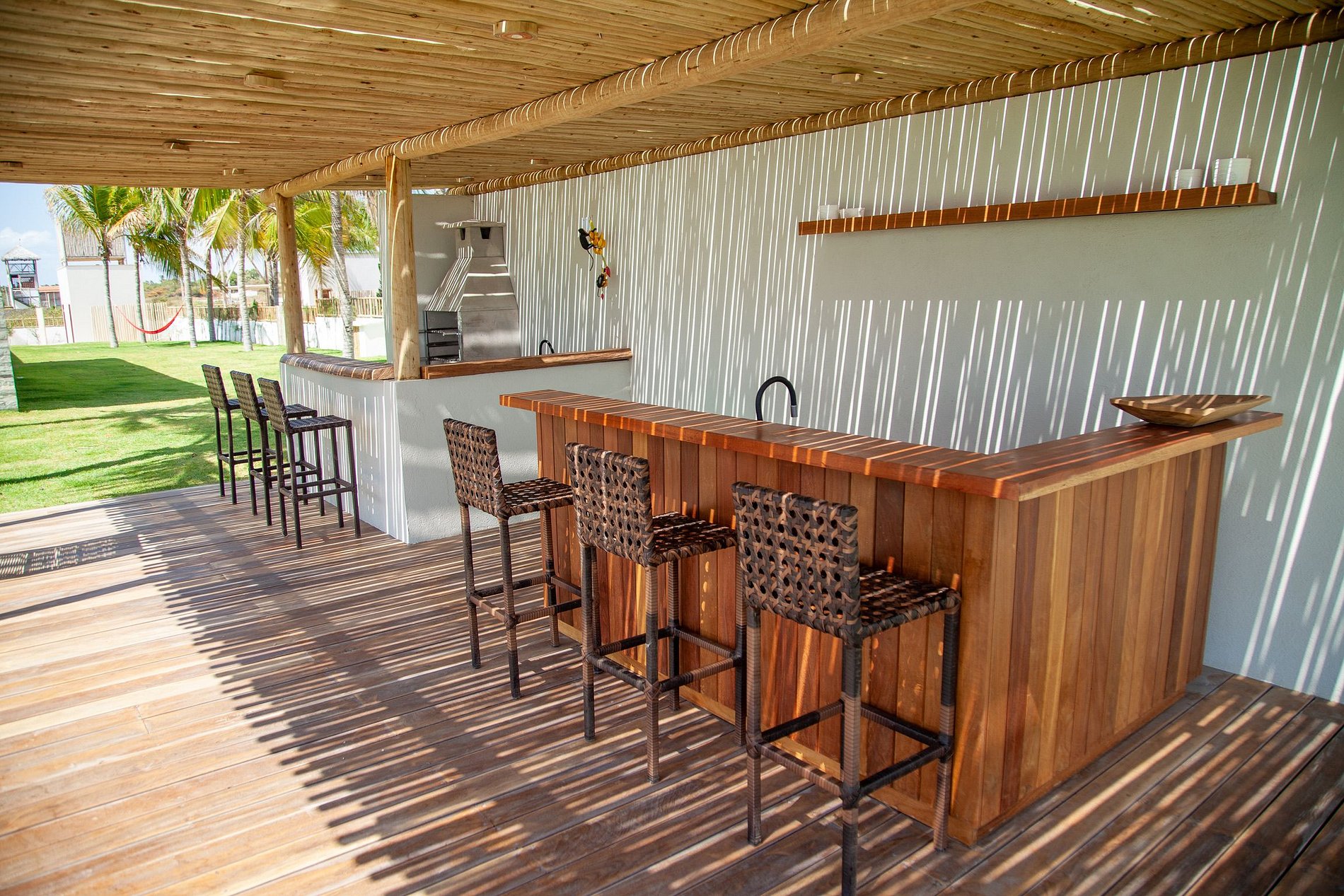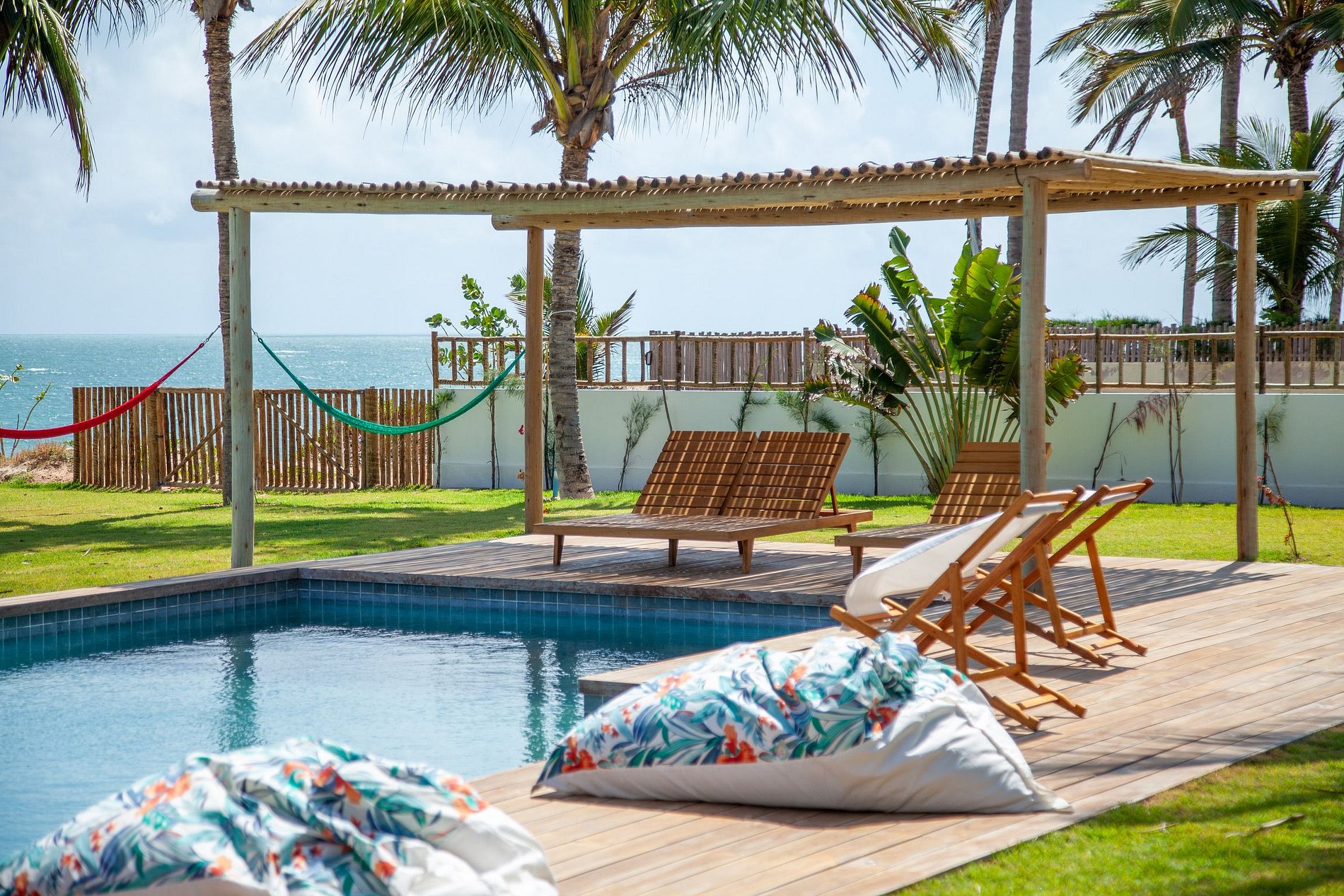 El área exterior es una invitación al dolce far niente. Un extenso césped llega hasta la arena, bordeado por cocoteros y una piscina con deck de madera, reposeras y hamacas que se mecen bajo la sombra. También hay una terraza con sillones amplios y una vista 360º hipnotizante – ideal para ver el atardecer con un trago en la mano. Para los más activos, la casa ofrece acceso directo para practicar kitesurf desde la propiedad y hasta una cancha de beach tennis. ¿Y si la idea es relajarse? Una buena opción es disfrutar un agua de coco en el jardín o leer un libro con el sonido del mar de fondo.