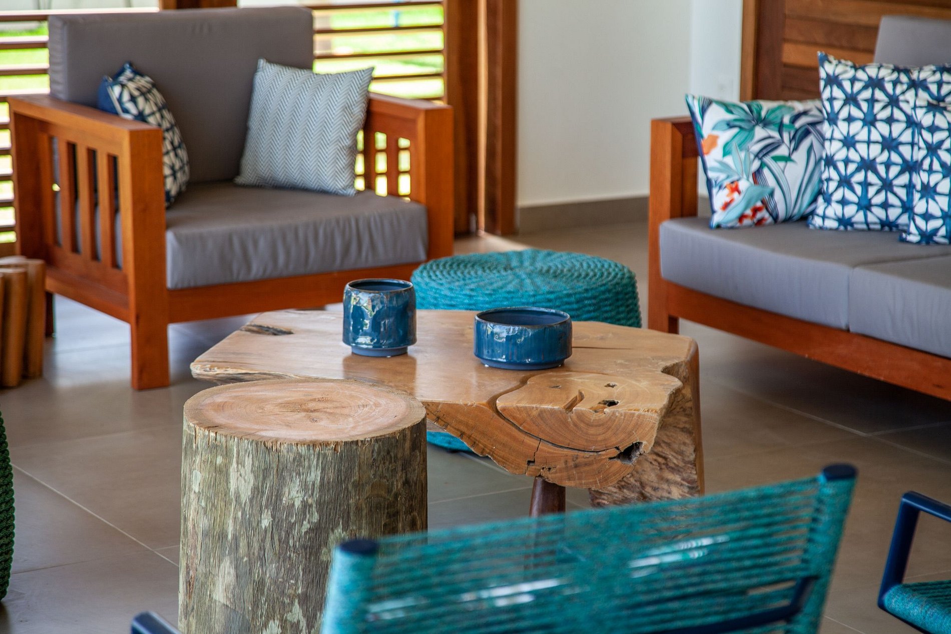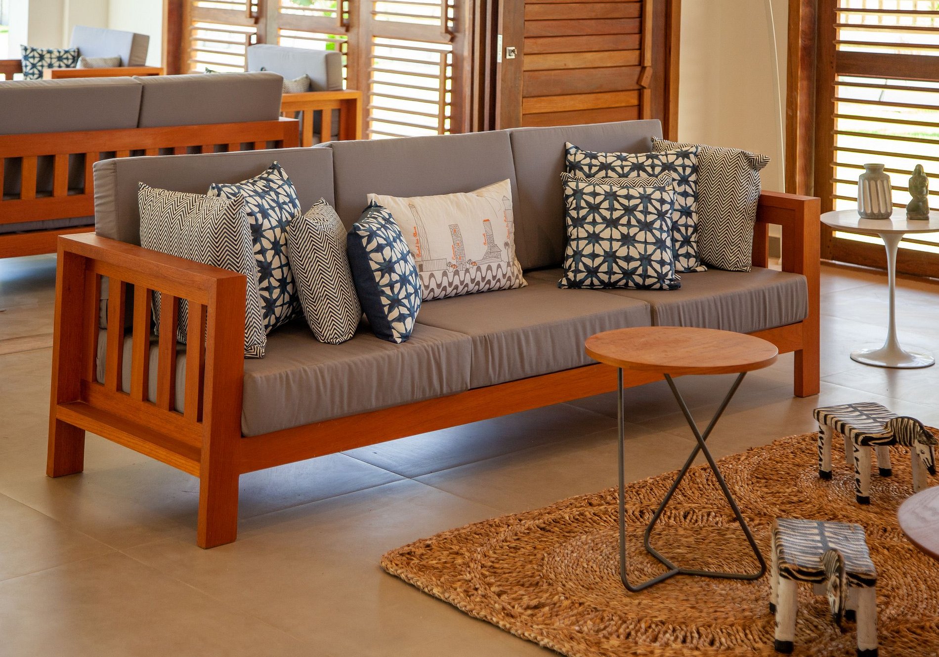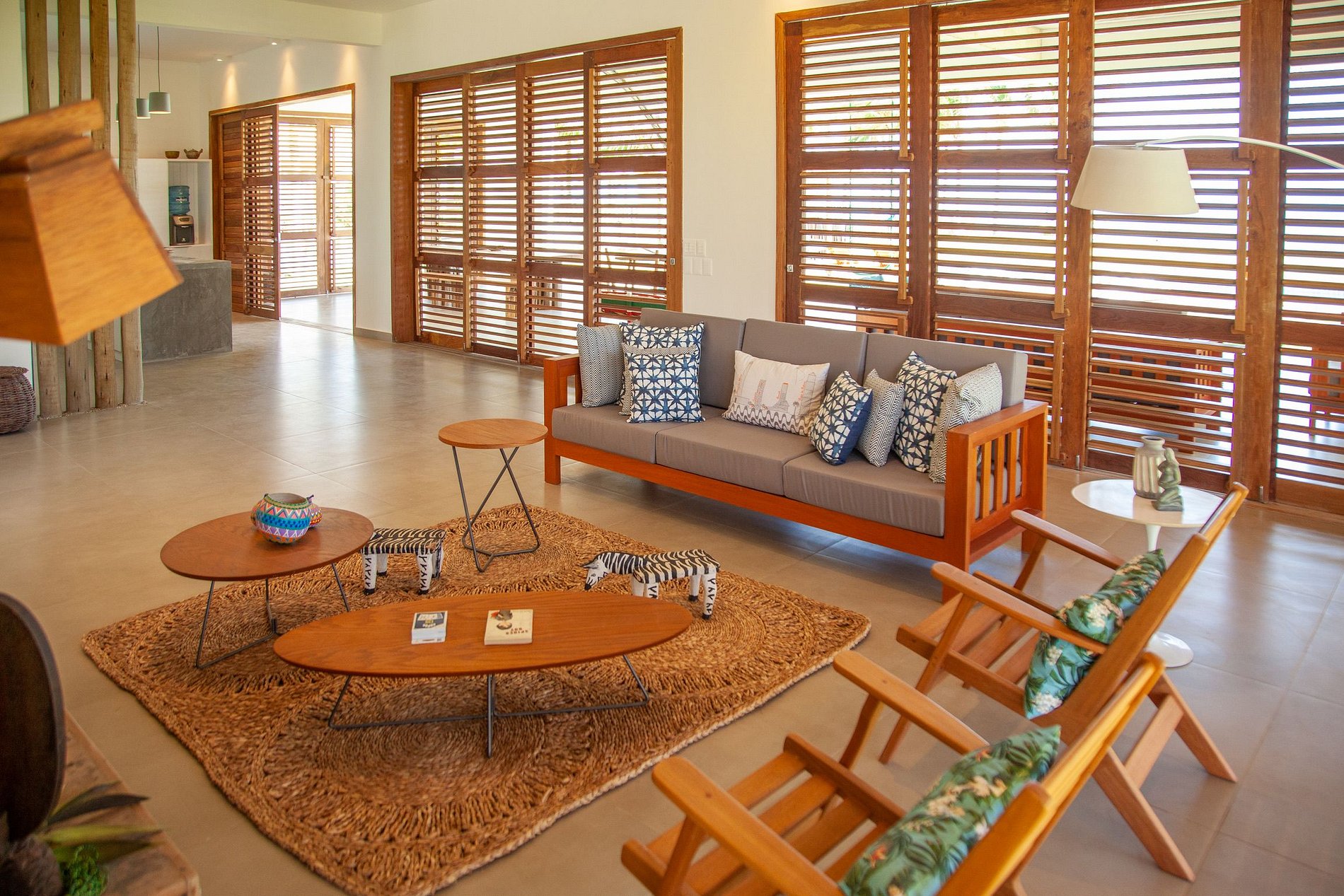 El área exterior es una invitación al dolce far niente. Un extenso césped llega hasta la arena, bordeado por cocoteros y una piscina con deck de madera, reposeras y hamacas que se mecen bajo la sombra. También hay una terraza con sillones amplios y una vista 360º hipnotizante – ideal para ver el atardecer con un trago en la mano. Para los más activos, la casa ofrece acceso directo para practicar kitesurf desde la propiedad y hasta una cancha de beach tennis. ¿Y si la idea es relajarse? Una buena opción es disfrutar un agua de coco en el jardín o leer un libro con el sonido del mar de fondo.