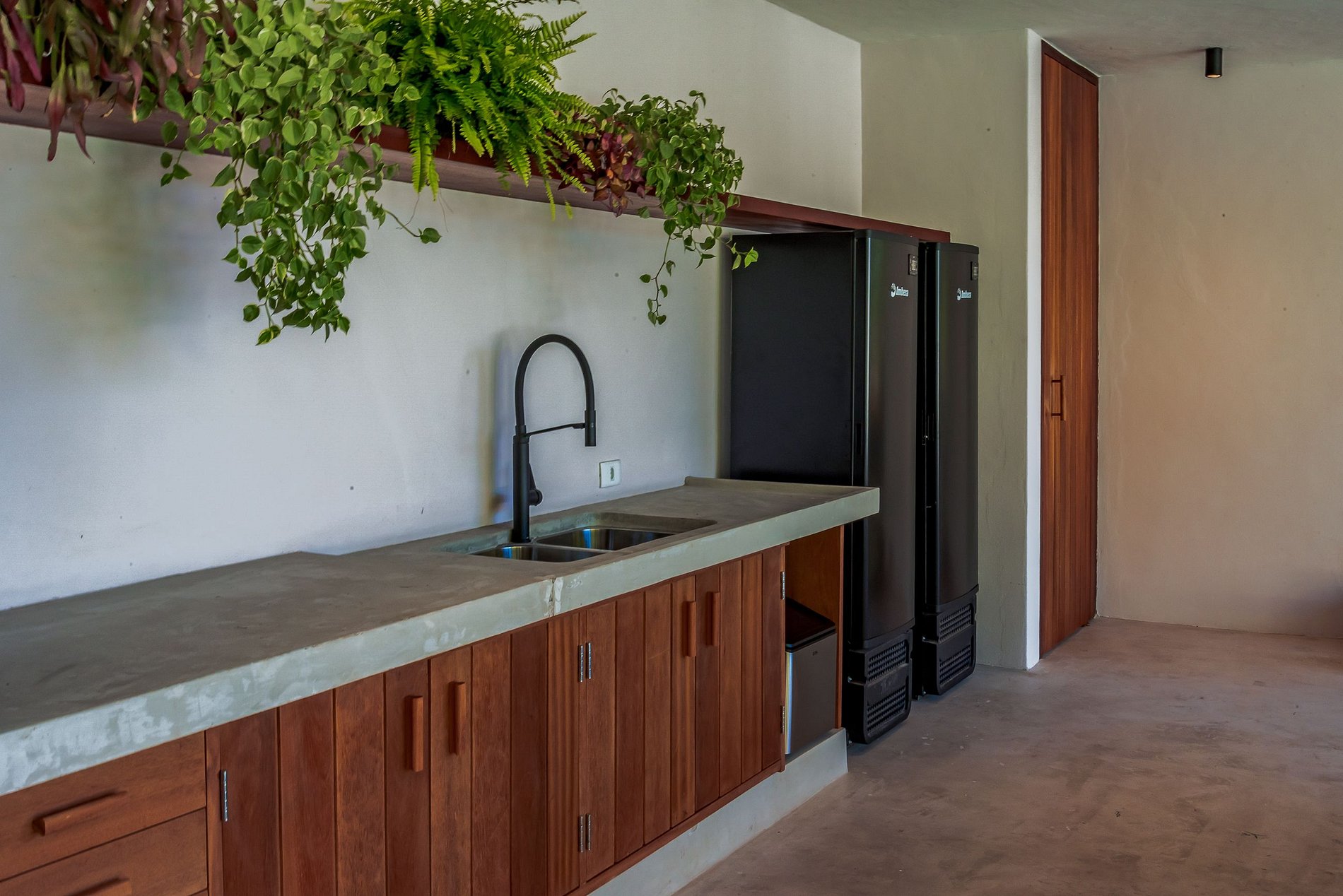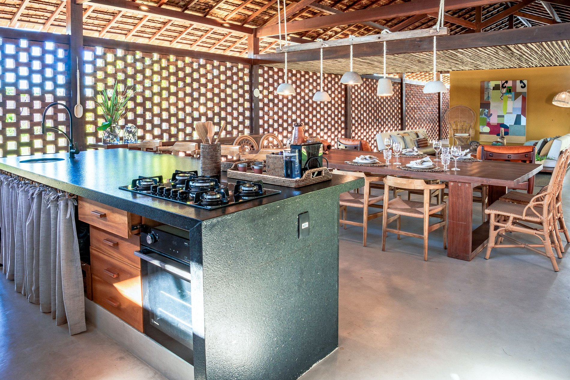 El pabellón principal alberga un ambiente gourmet de primera clase, una cómoda sala de estar, un baño de visitas y una íntima zona de estar. El gourmet dispone de una amplia variedad de equipamientos, como vitrocerámica, frigoríficos, horno, Nespresso y vinoteca con dos zonas de temperatura. La mesa con capacidad para 12 personas y una isla con cuatro taburetes hacen que este espacio sea perfecto para comidas memorables. La vajilla sorprenderá a los invitados en cada comida, y una generosa selección de vasos de cristal y acrílico se adaptará a una amplia gama de preferencias de bebidas, desde cerveza y ginebra hasta vino y champán.