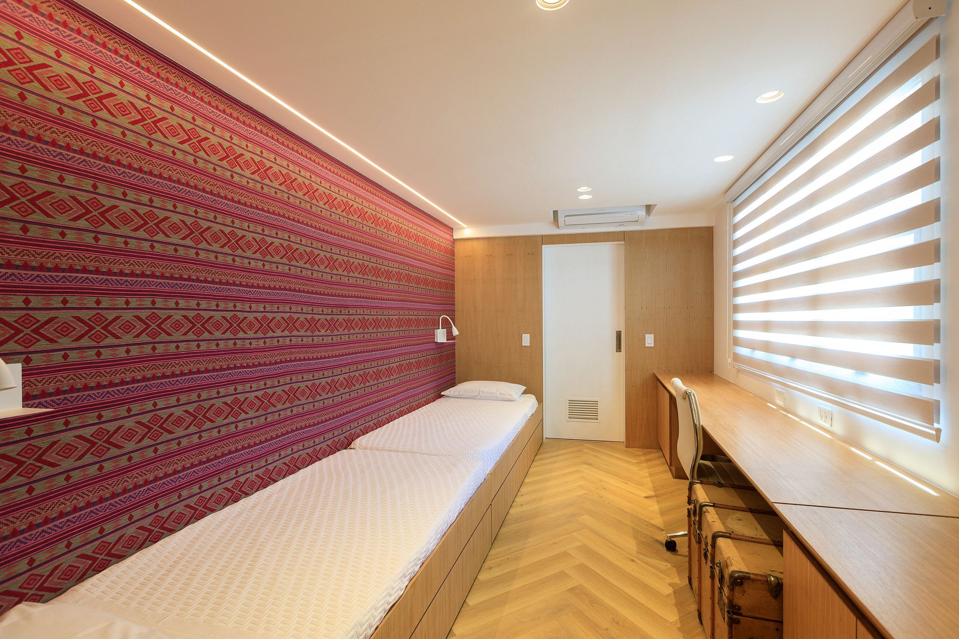 La última habitación es polivalente y destinada al alojamiento de los niños, estando acondicionada como home office y concebida como una habitación individual, con tres camas individuales (una de ellas tipo plegable), un espacio de trabajo y una televisión.